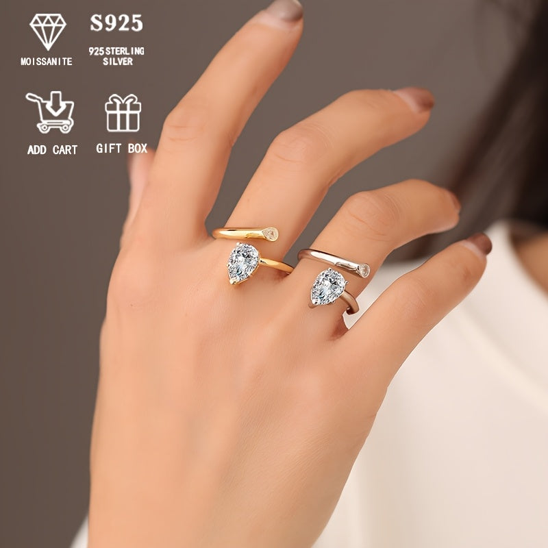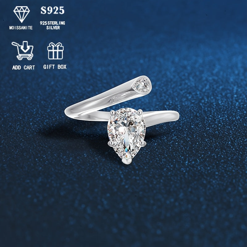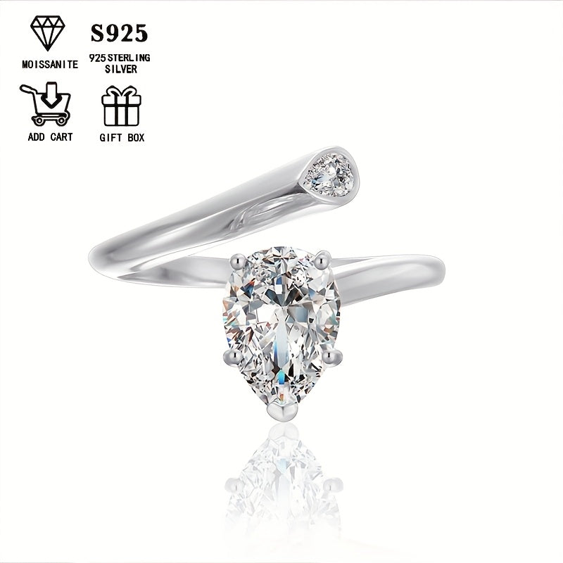 Elegant S925 silver ring featuring a 2ct pear-shaped moissanite stone. Perfect for women with low allergy sensitivity. Adjustable opening for a comfortable fit.