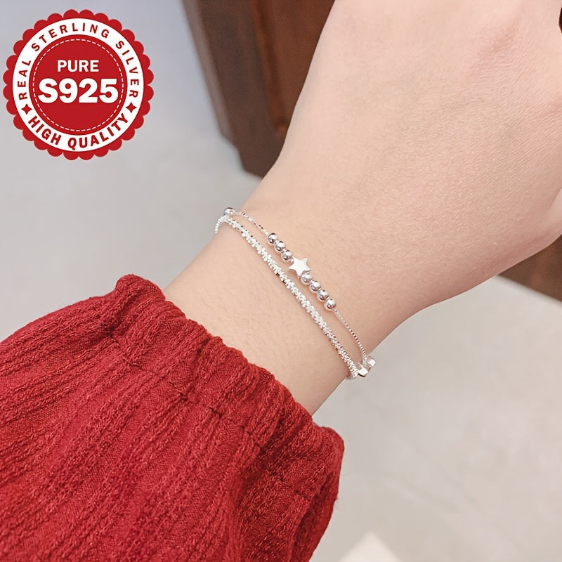 This S925 sterling silver double layered bracelet features star and bead accents, making it a trendy and stylish addition to any outfit. It is hypoallergenic and lightweight at 5g, perfect for daily wear or as a gift. Embrace urban style with this versatile piece.