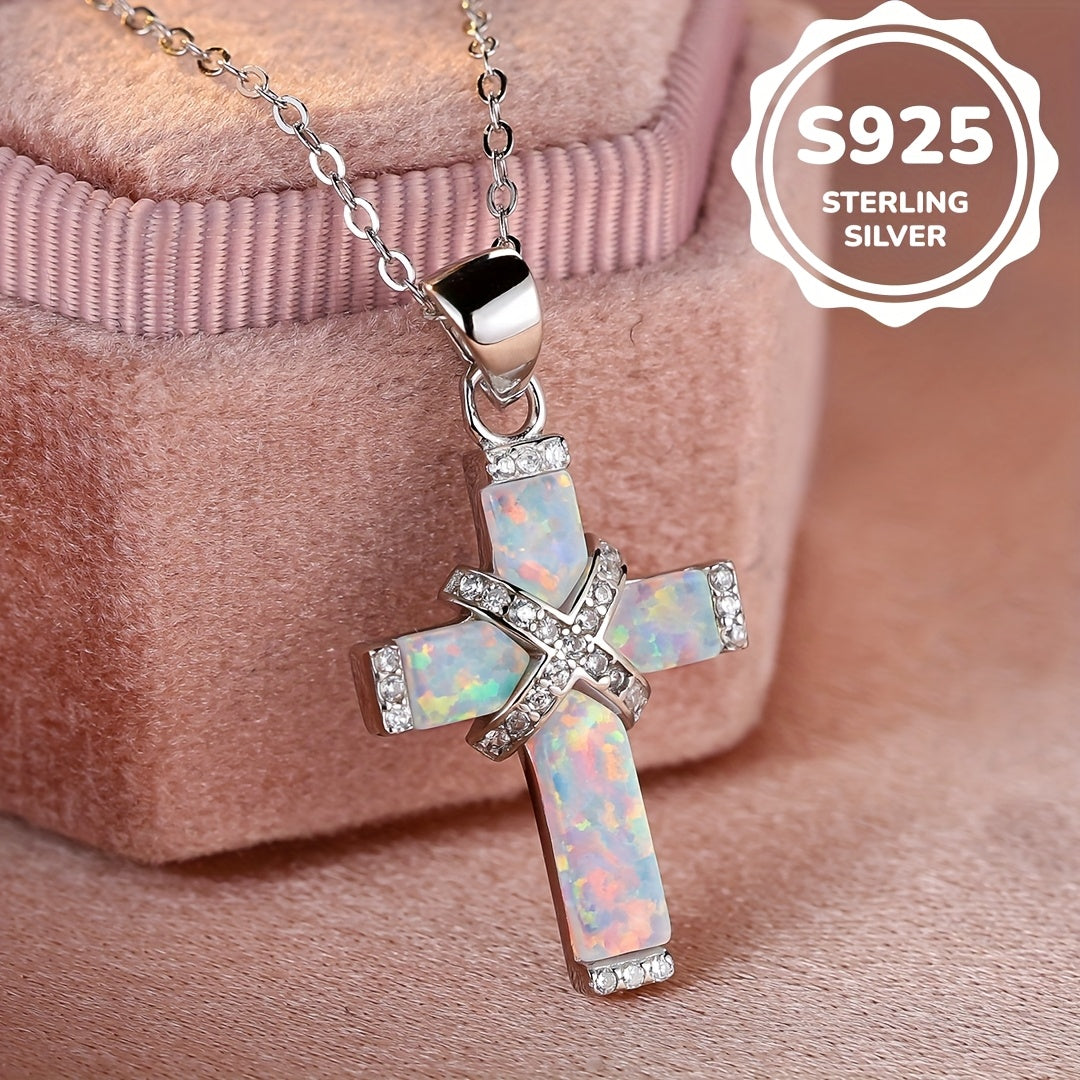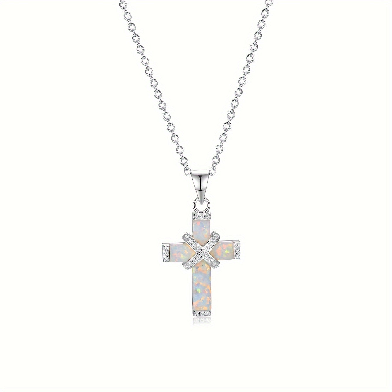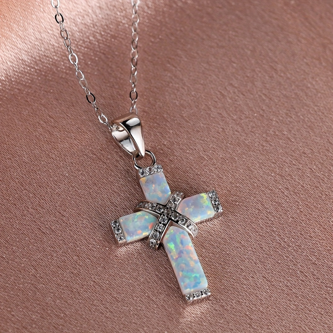 Elegant cross necklace featuring a high-quality synthetic Australian opal in a pure silvery setting. Perfect for everyday wear or special occasions.