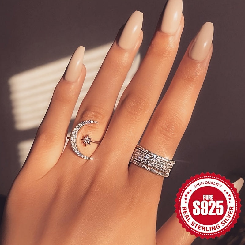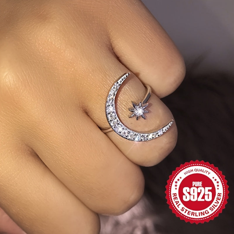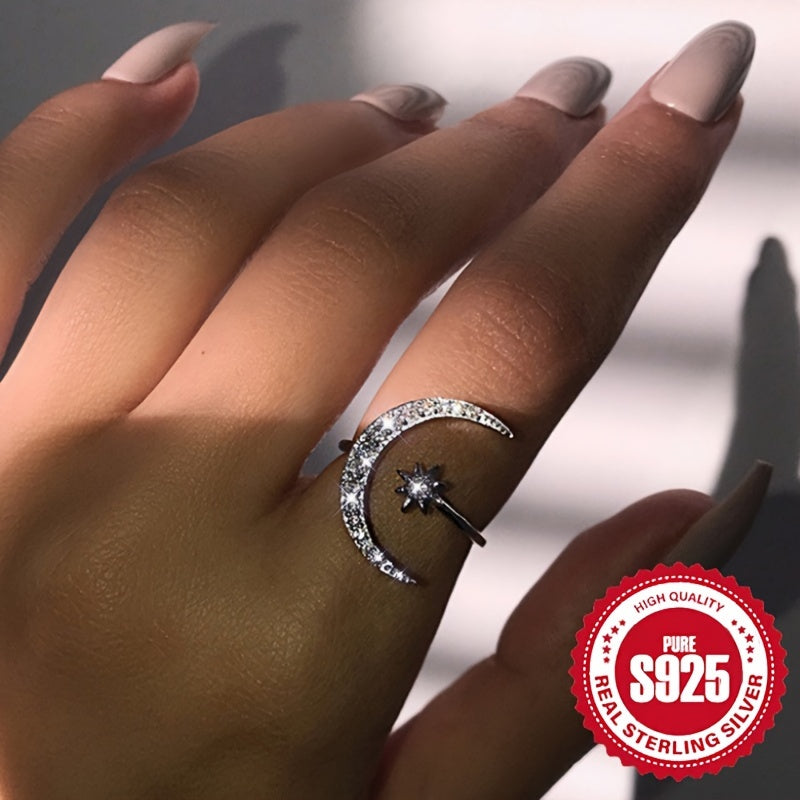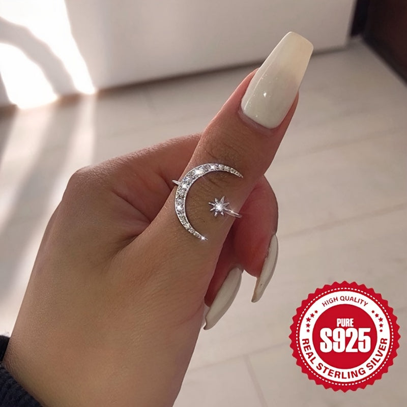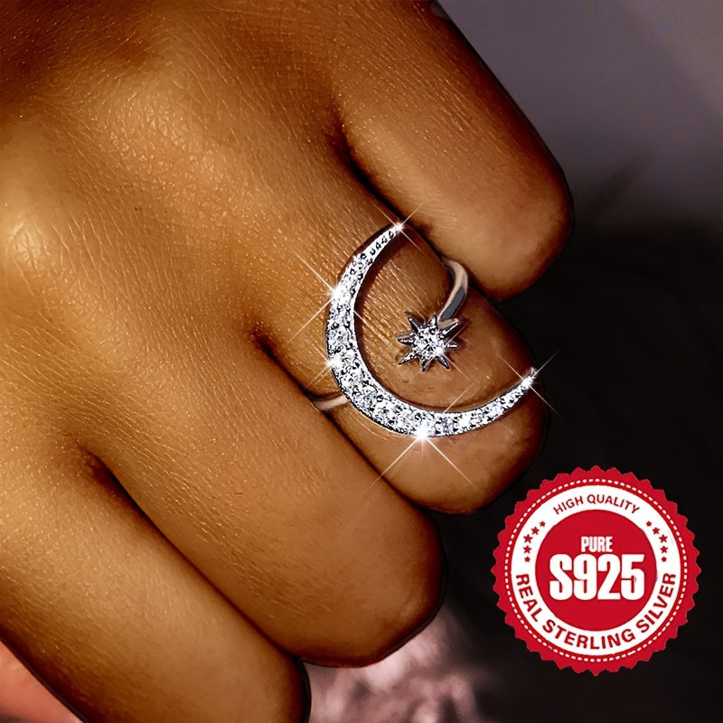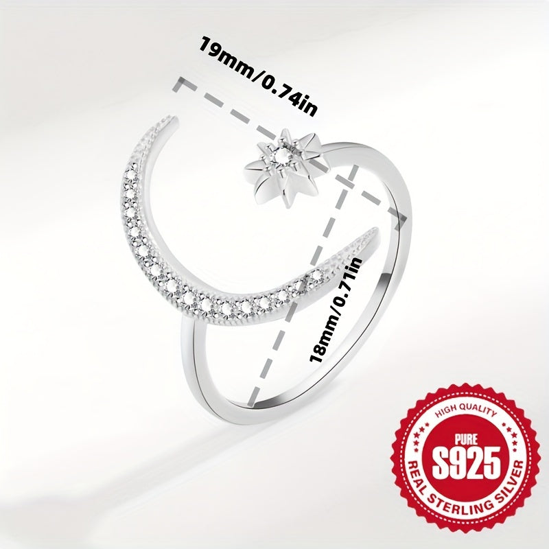This stunning S925 silver ring features moon and stars surrounding flash synthetic zirconia. The adjustable opening ensures a perfect fit and it is low allergy.