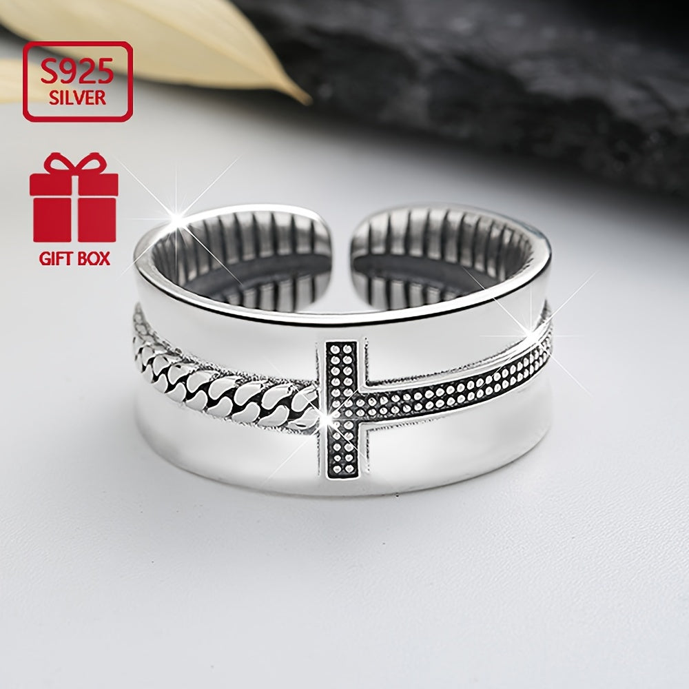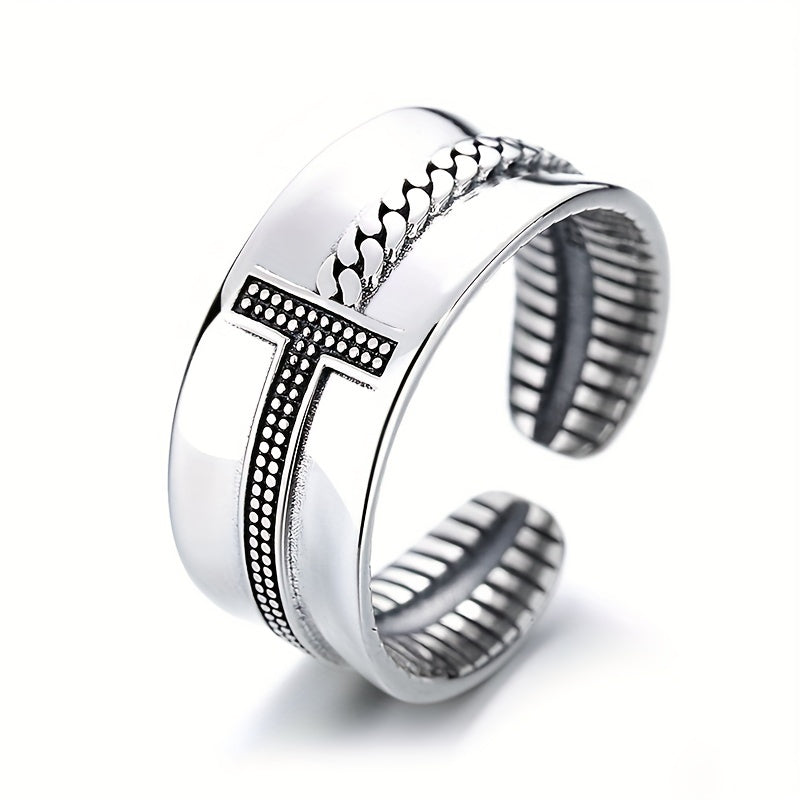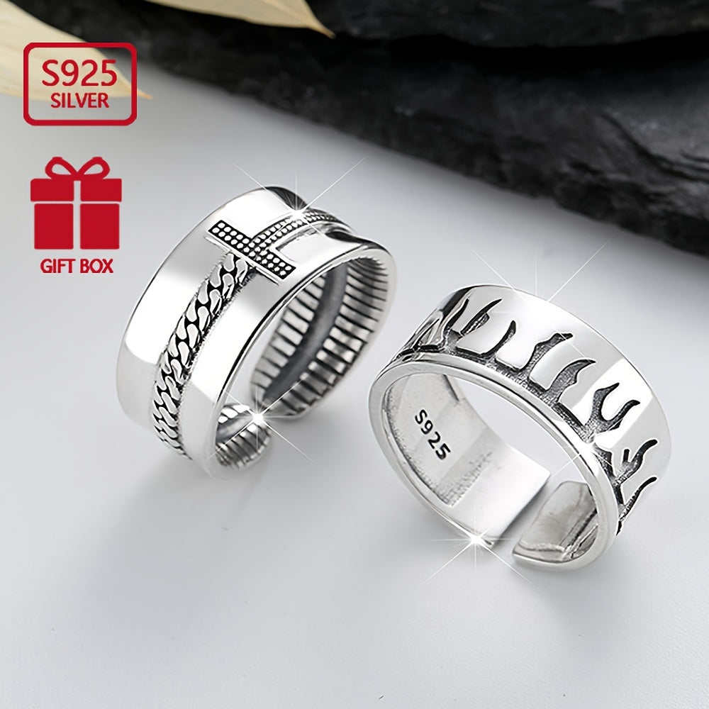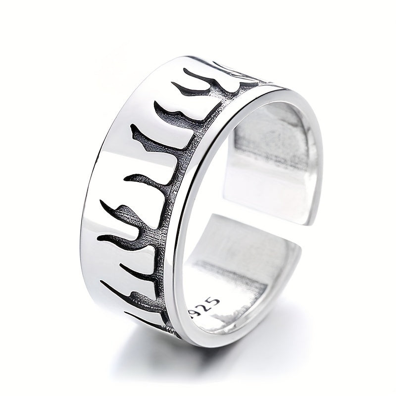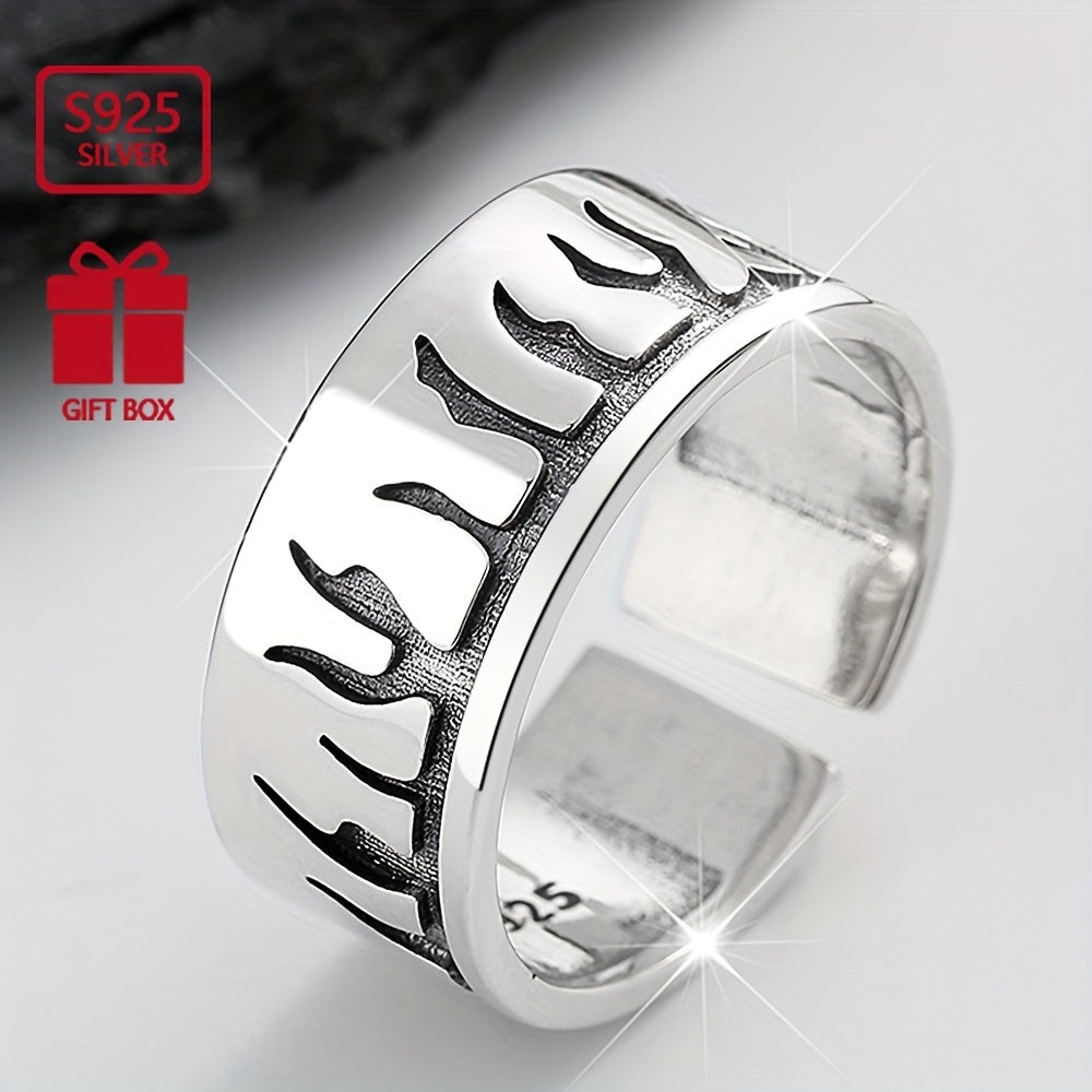 This s925 pure silver wide T shaped ring features a stylish flame pattern, perfect for parties or casual wear. Suitable for both men and women.