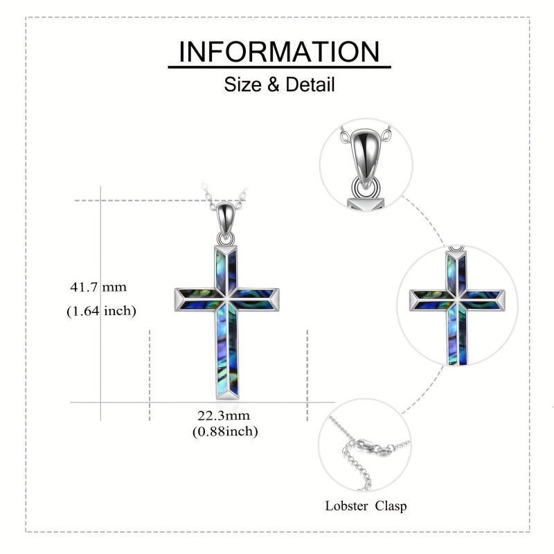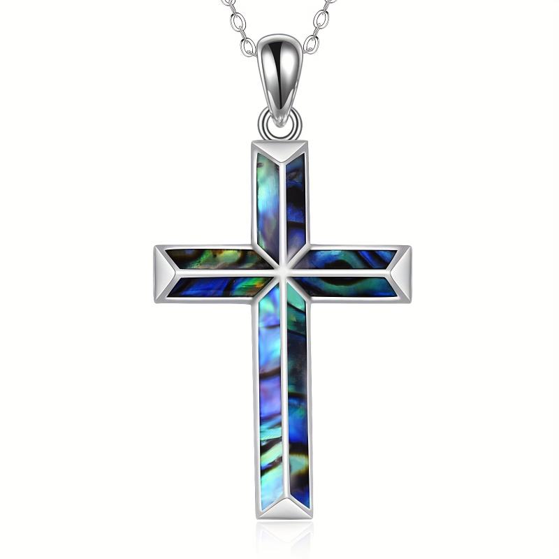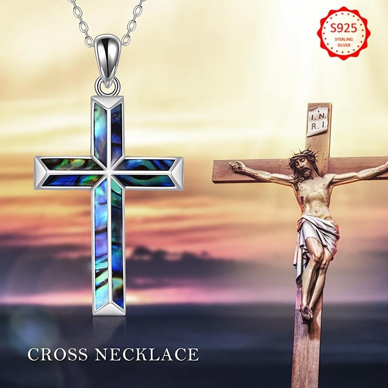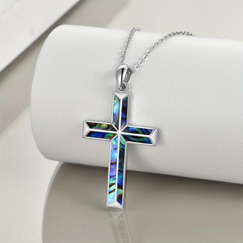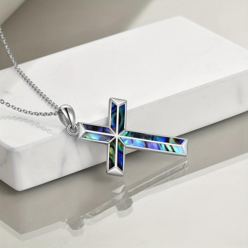 Elegant cross pendant necklace made of 925 sterling silver with abalone shell, perfect for women's religious jewelry collection.