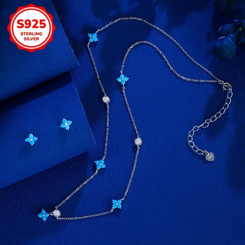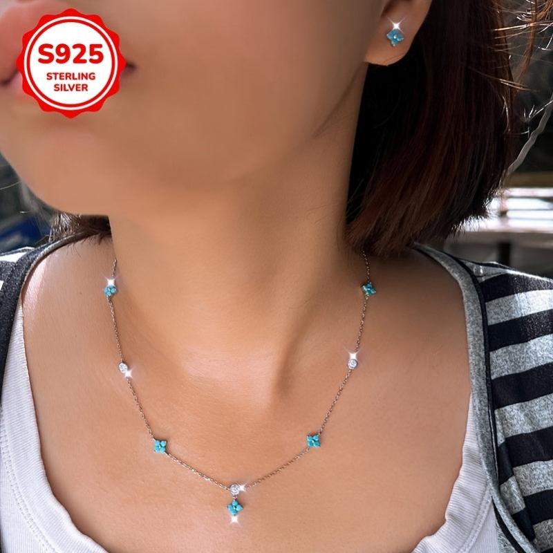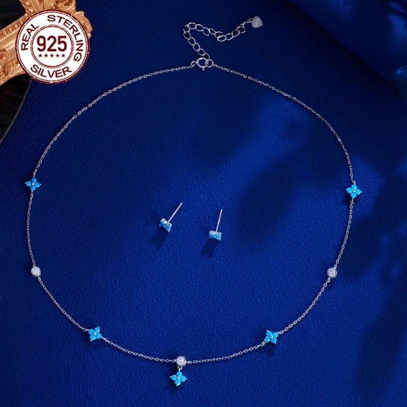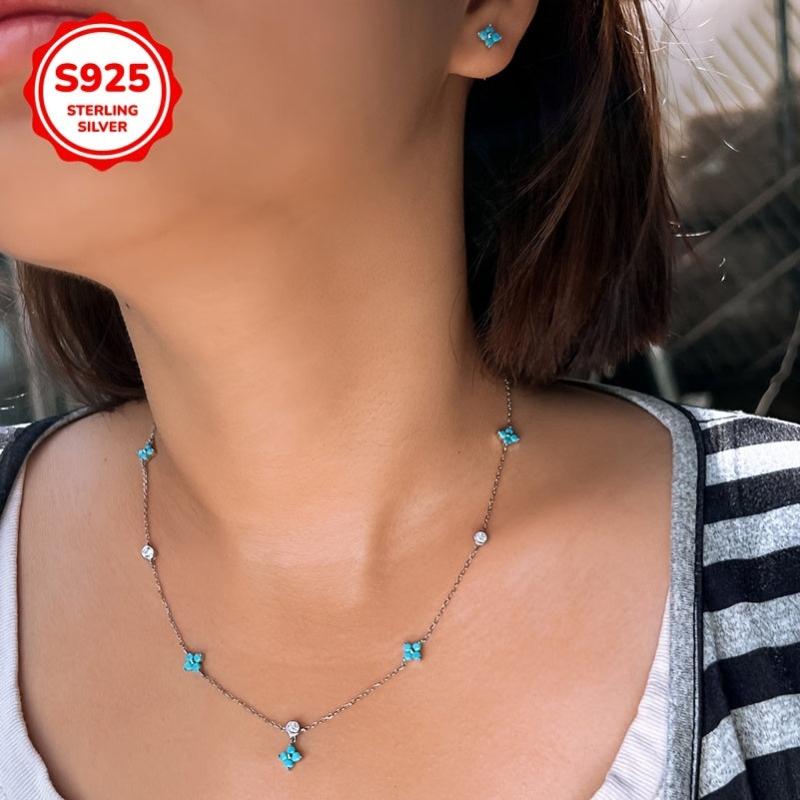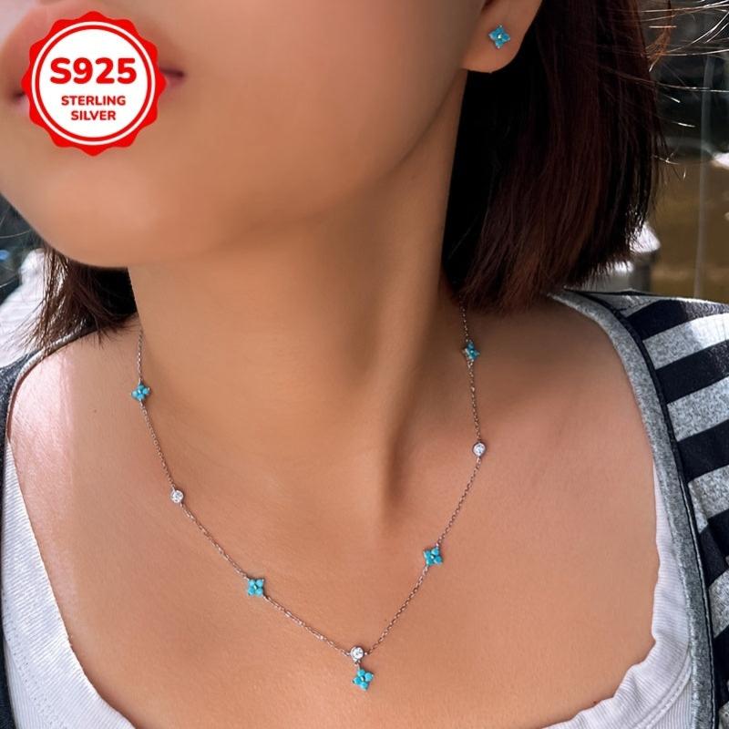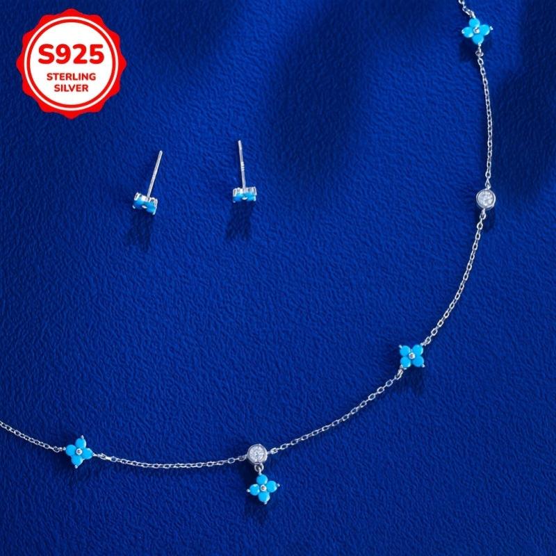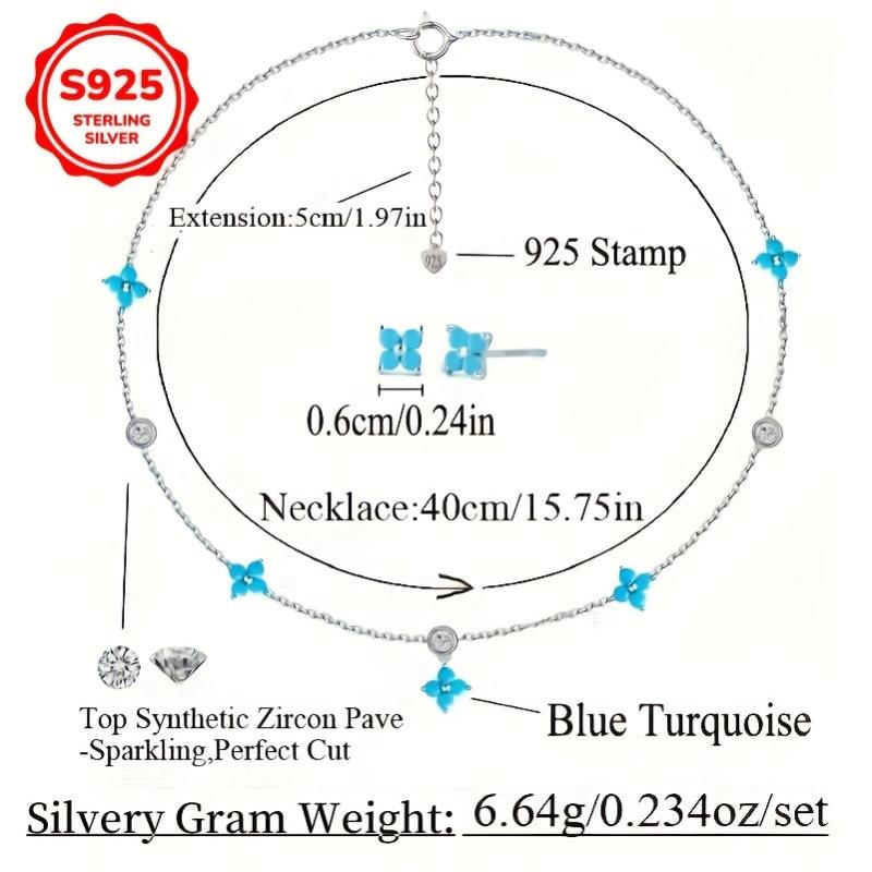 Complete your look with this elegant set of turquoise earrings and necklace crafted from 925 sterling silver. The lucky four leaf clover design is adorned with synthetic zirconia for added sparkle.