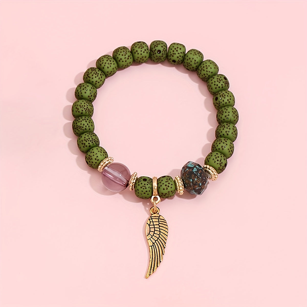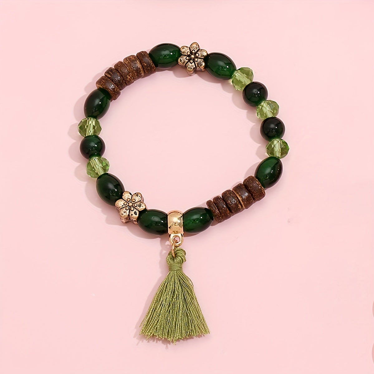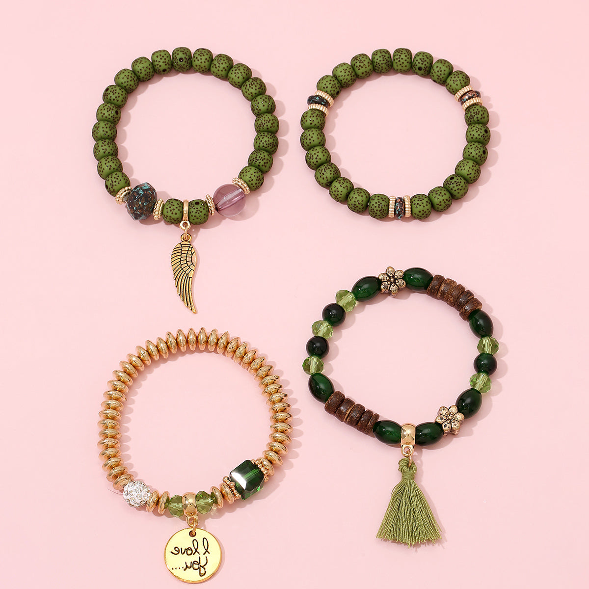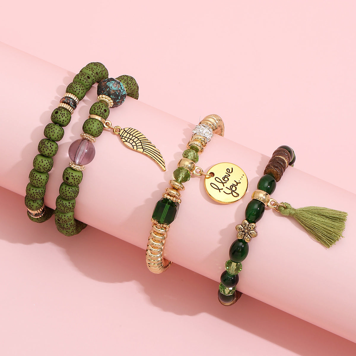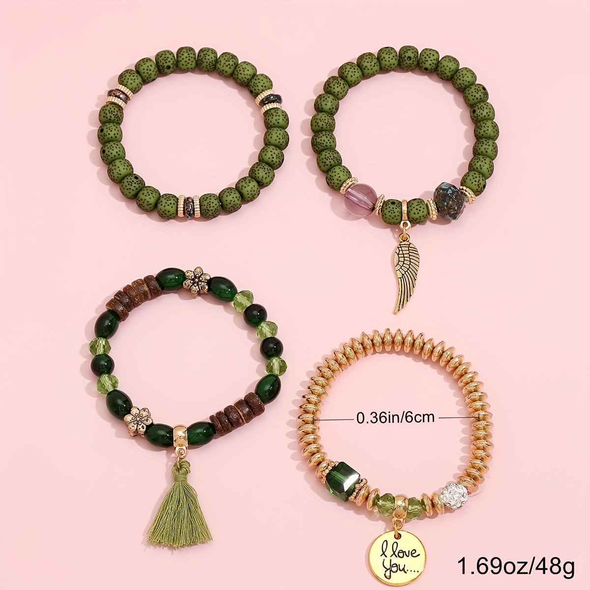 This set includes 4 green beaded bracelets with tassel and wing charms. Perfect for adding a boho-chic touch to your outfits.