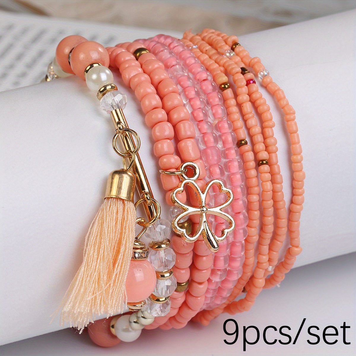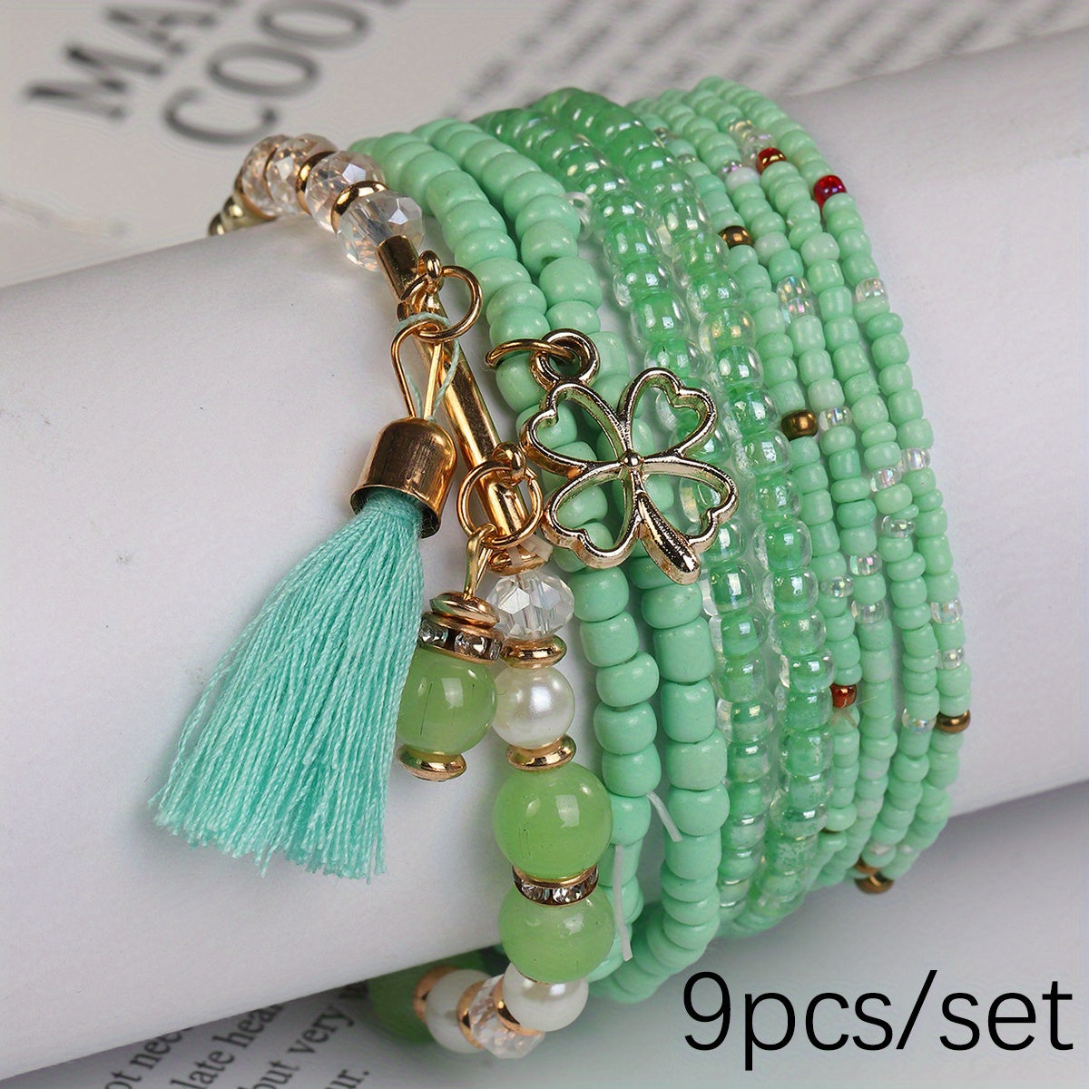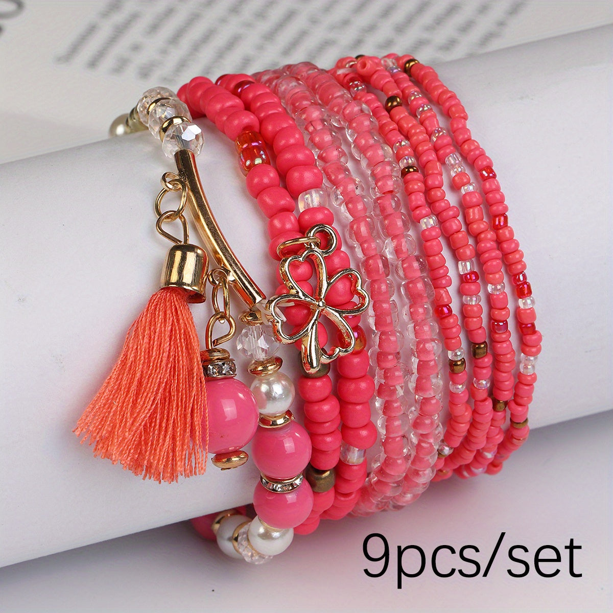This set includes 9 unisex bohemian glass bracelets featuring bow tassel pendants. Each bracelet is layered and adjustable, making it suitable for various wrist sizes.