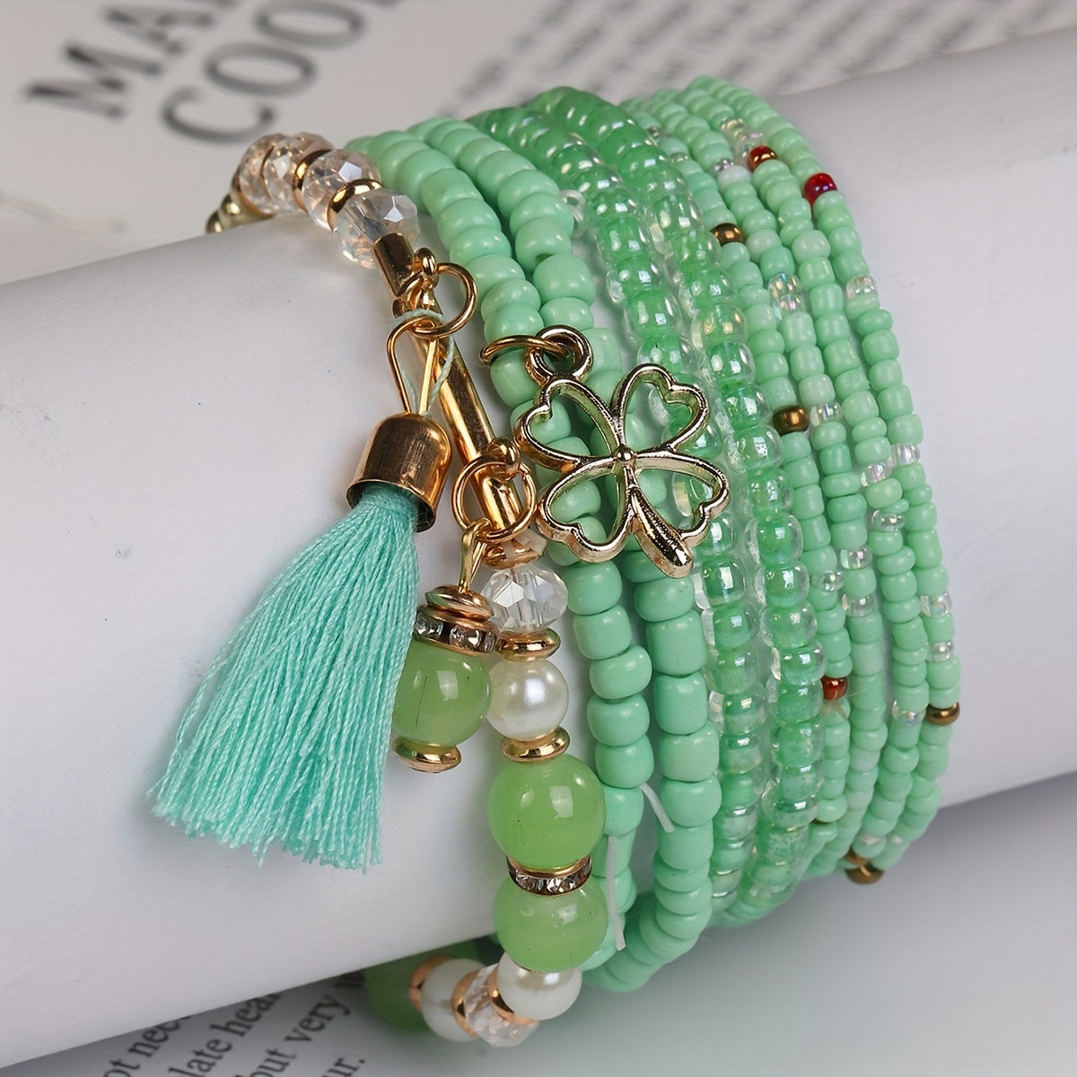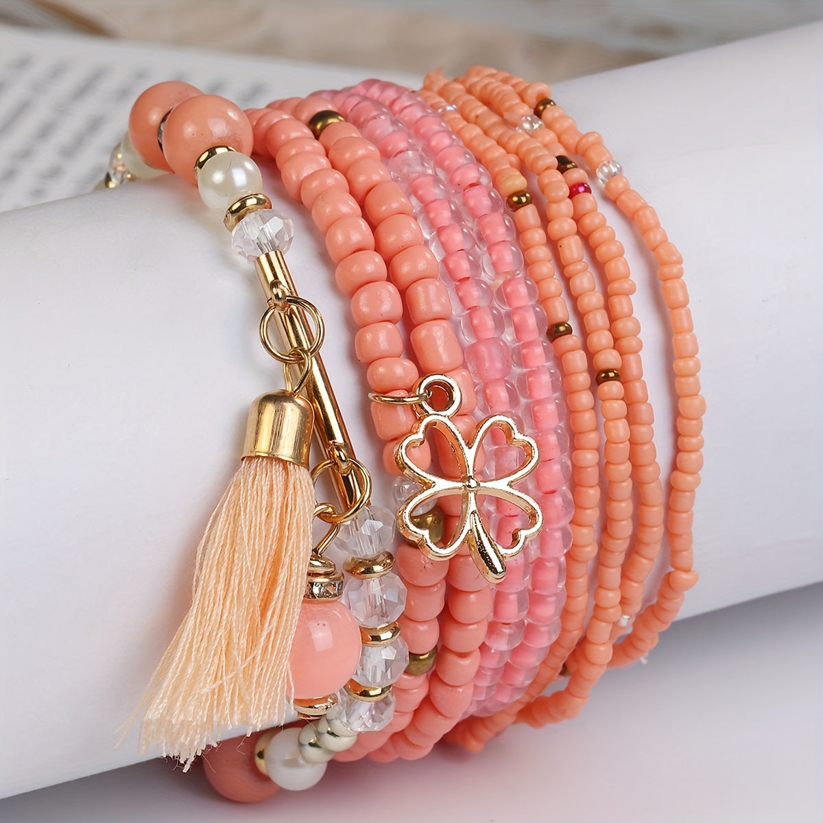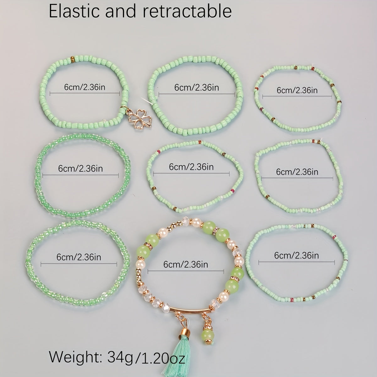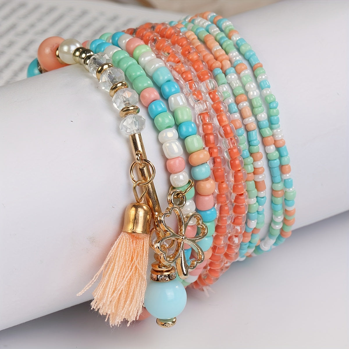 This set includes 9 unisex bohemian glass bracelets featuring bow tassel pendants. Each bracelet is layered and adjustable, making it suitable for various wrist sizes.
