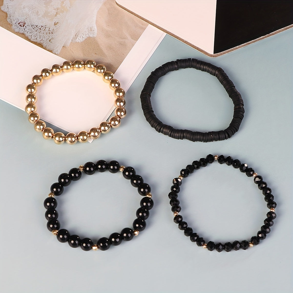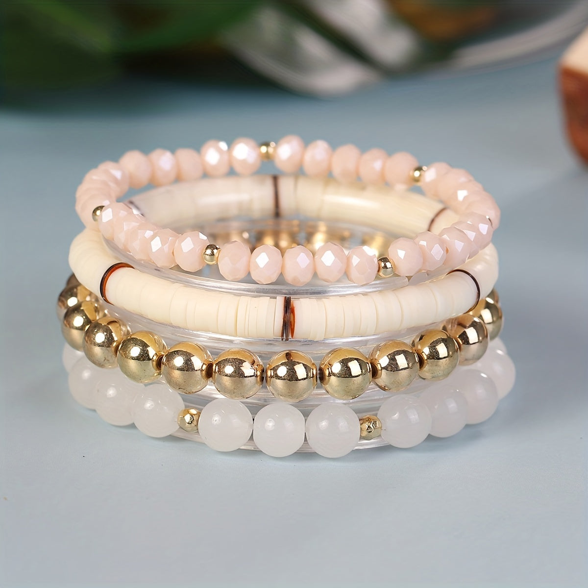 Elevate your style with this 4-piece bohemian bracelet set featuring soft ceramic pieces and colorful glass beads. Perfect for adding a touch of boho chic to any outfit.