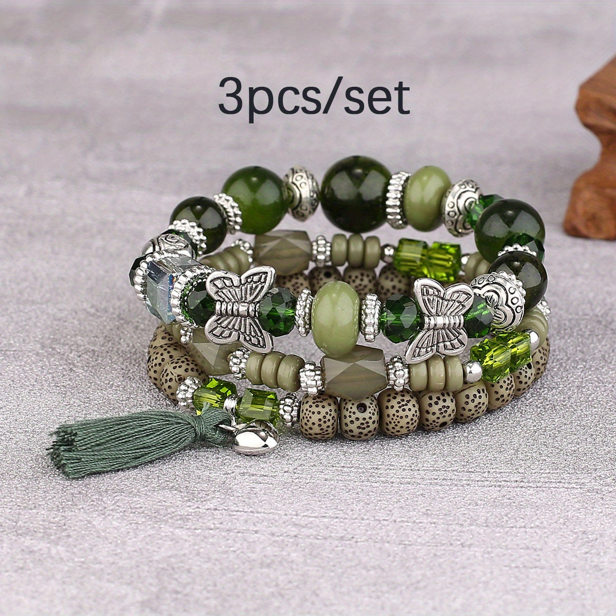 This 3-piece set of elastic layer bracelets features bohemian style with butterfly pendant, tassel, and beads. Perfect for men, daily wear, and gifting to family and friends on holidays or birthdays.
