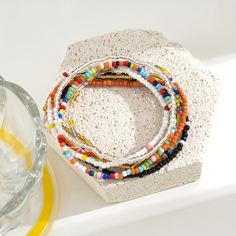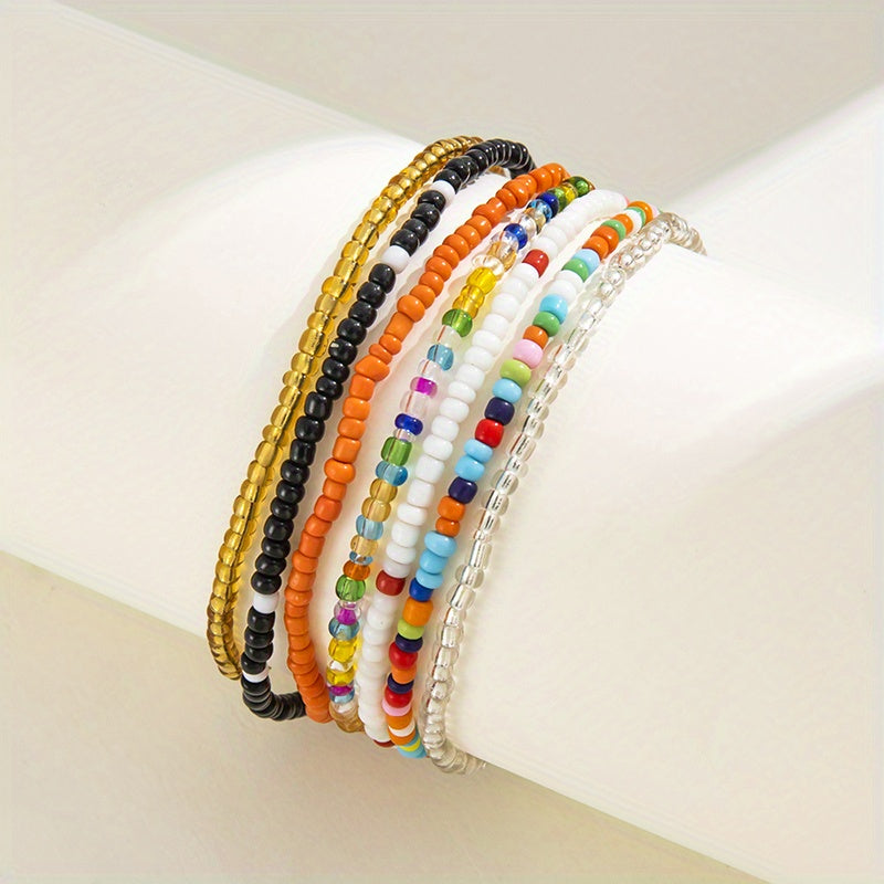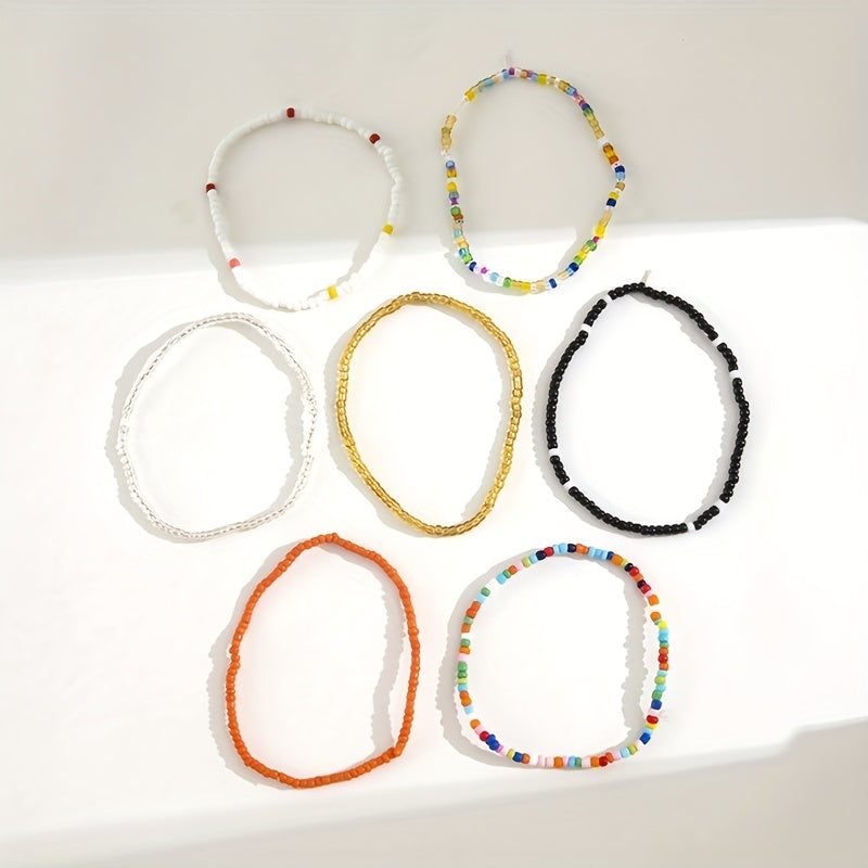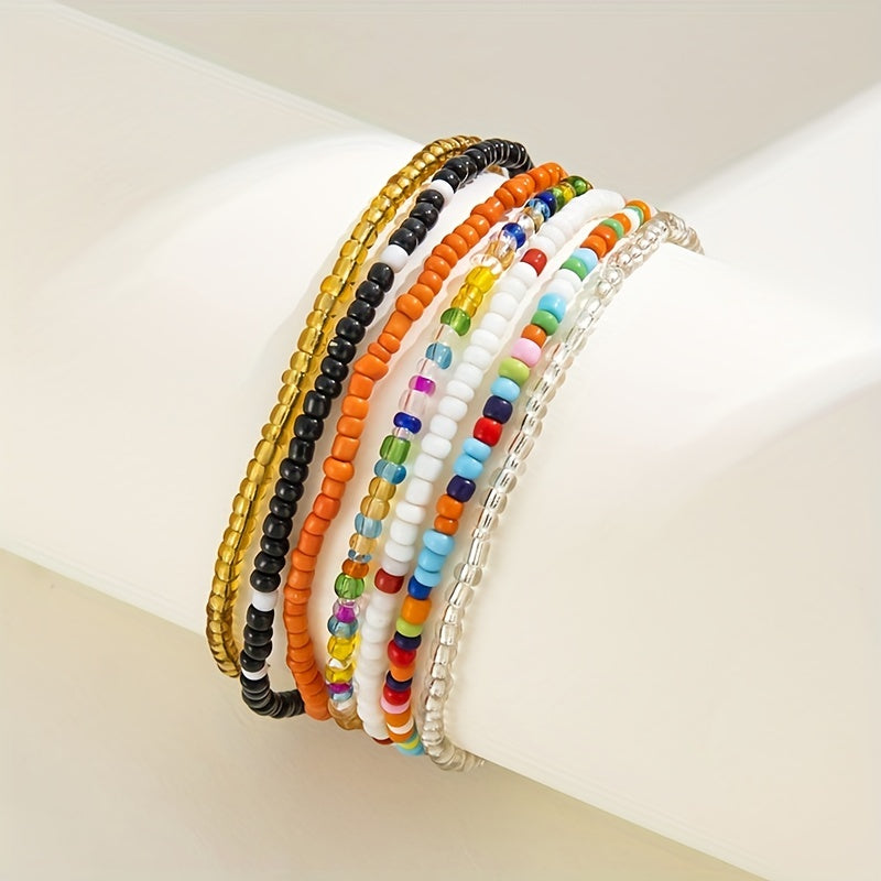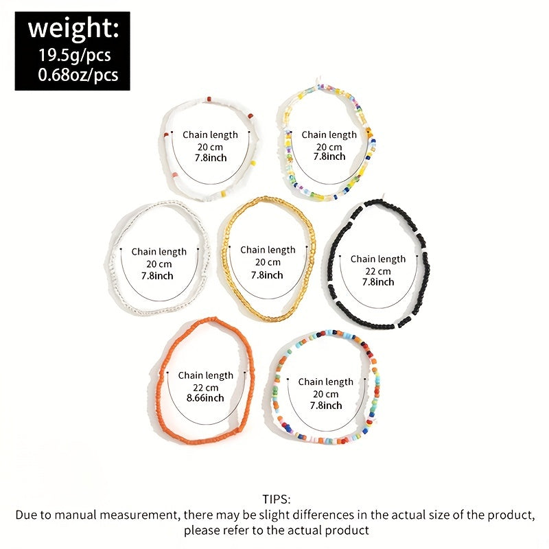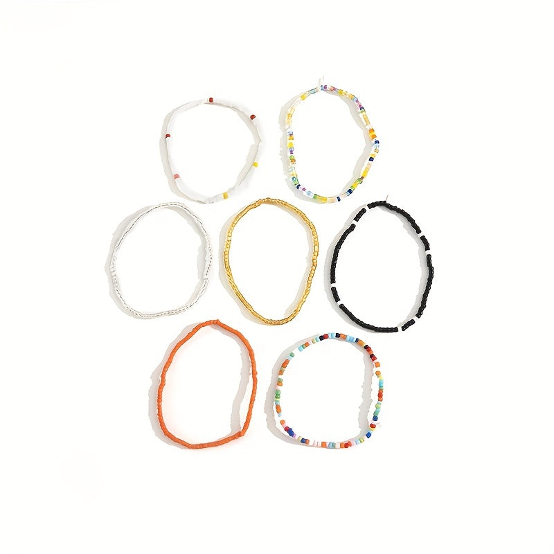 Enjoy the bohemian vibe with this set of 7 stackable ankle bracelets featuring colorful beads and charms. Perfect for adding a touch of free-spirited style to your look.