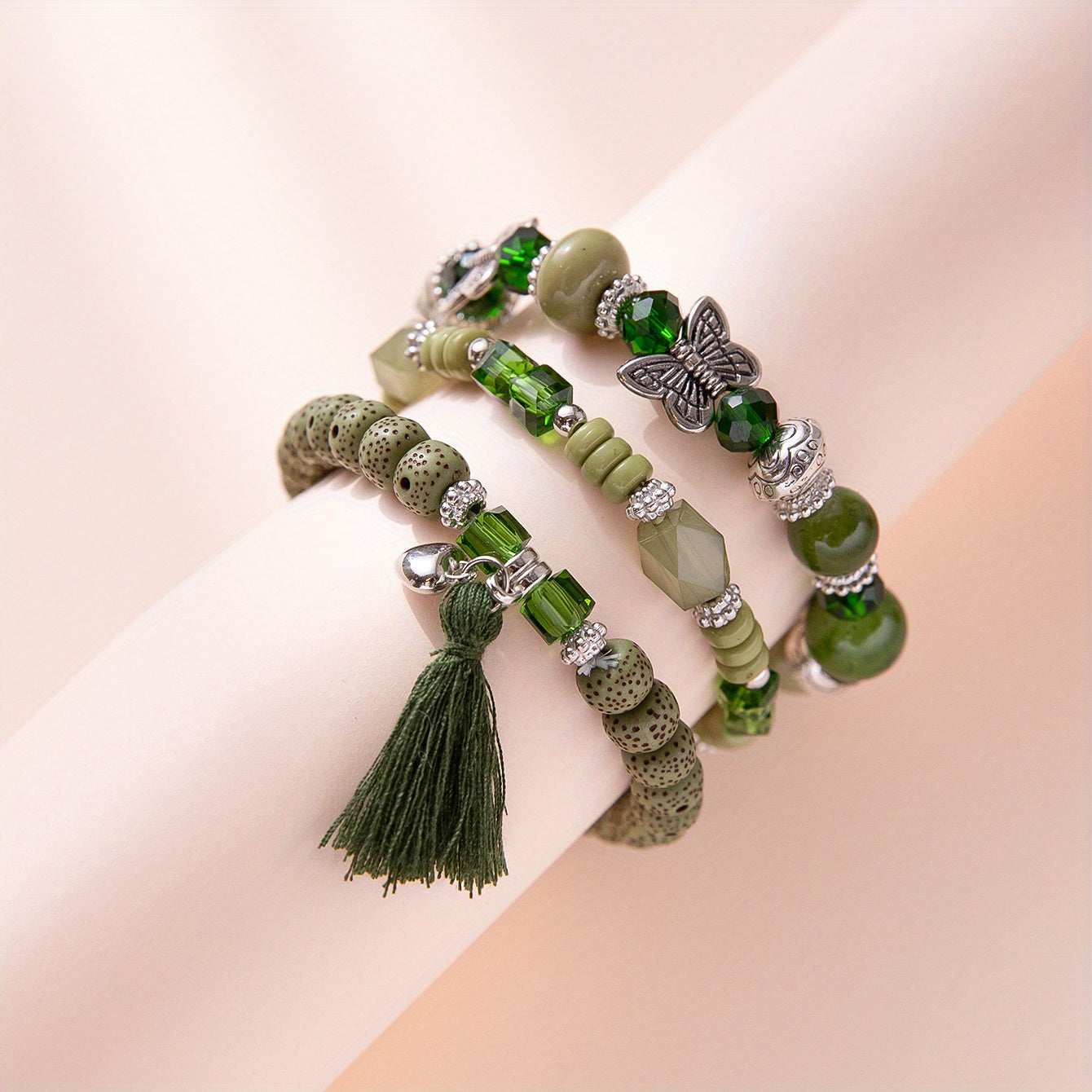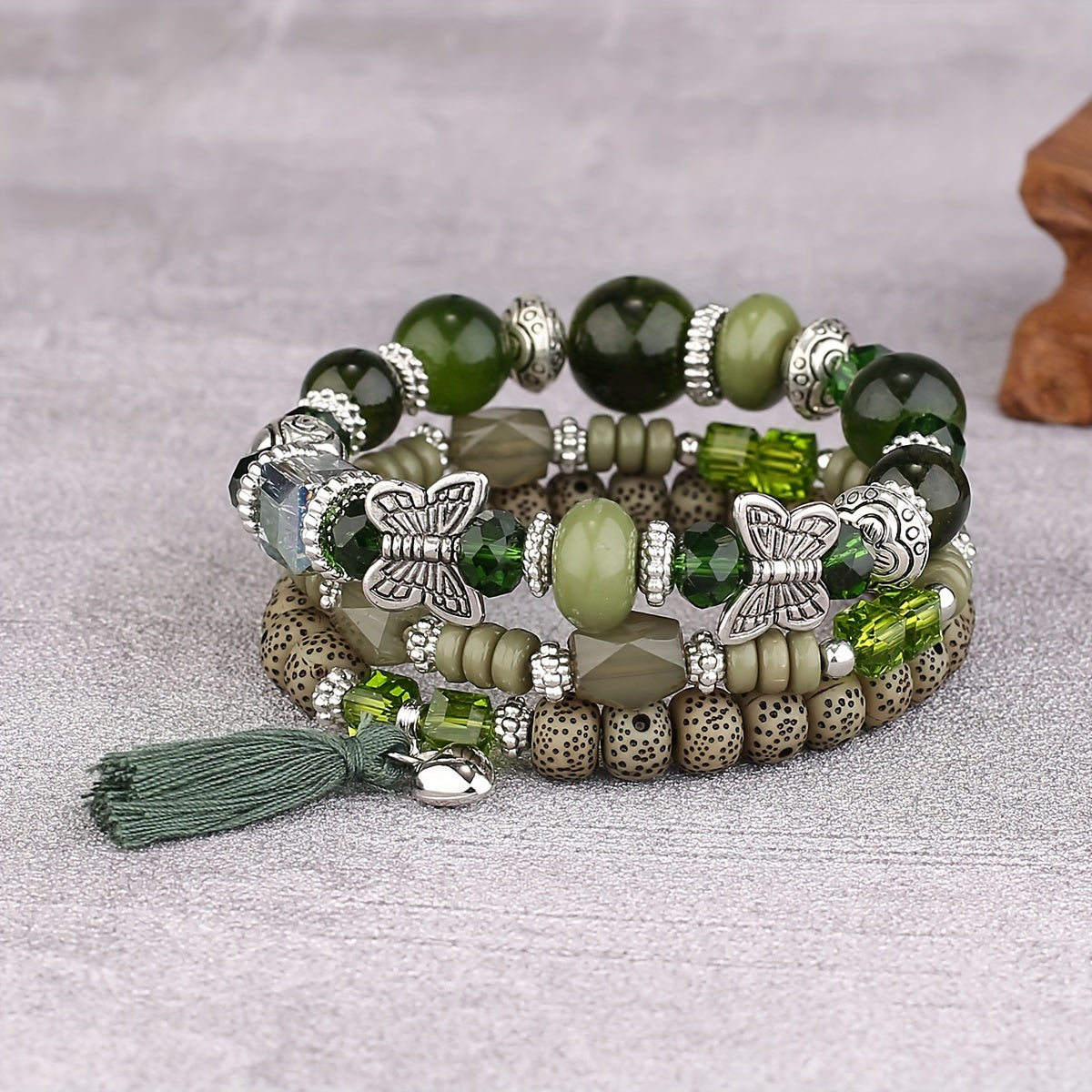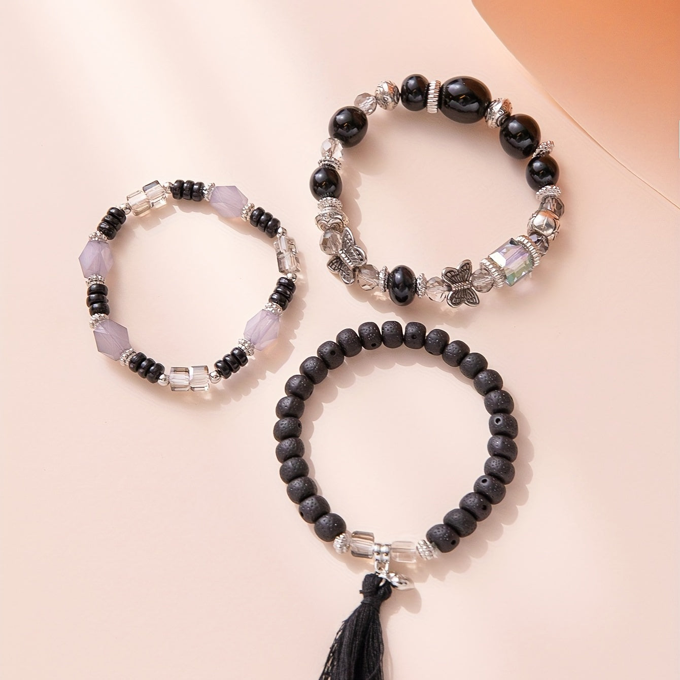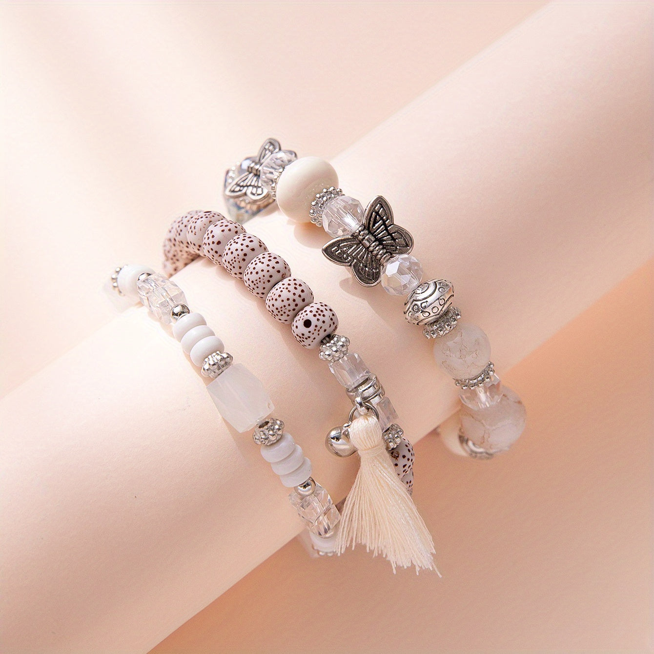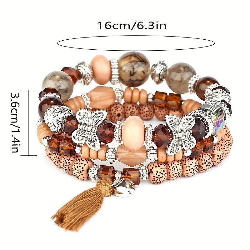 This 3-piece set of multilayer beaded bracelets features a unique boho style with tassel and butterfly charms.