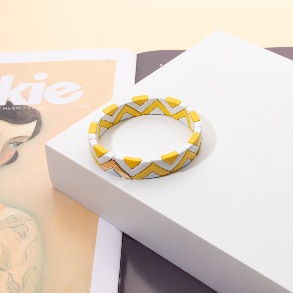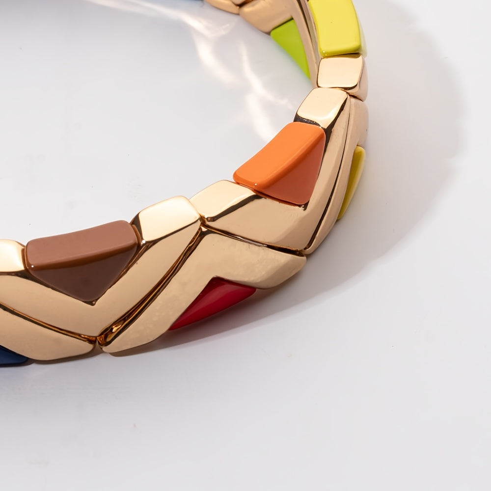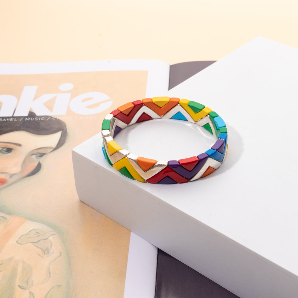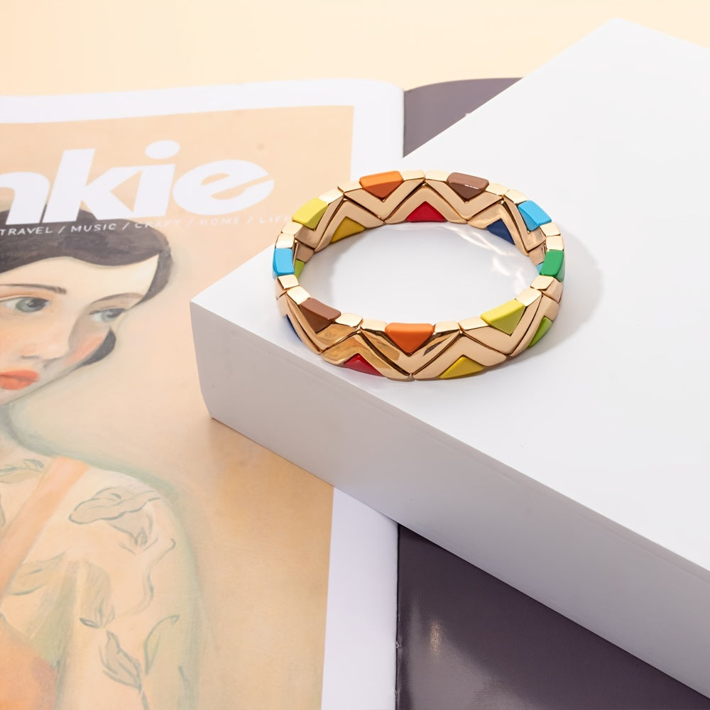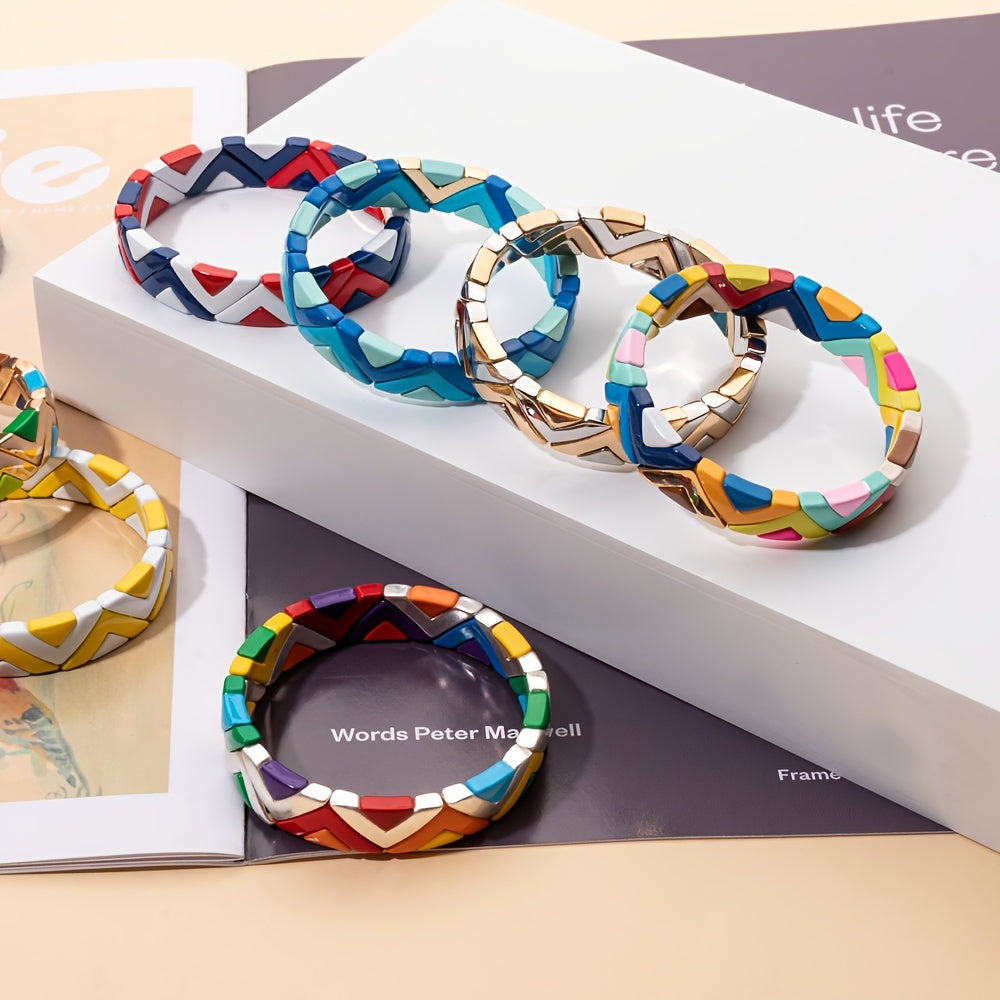Add a pop of color to your style with this enamel elastic bracelet. Featuring a V shape design, this bohemian bangle is a perfect gift for women who love vibrant jewelry.