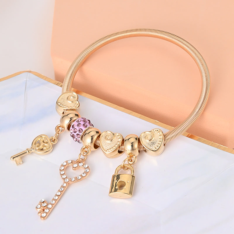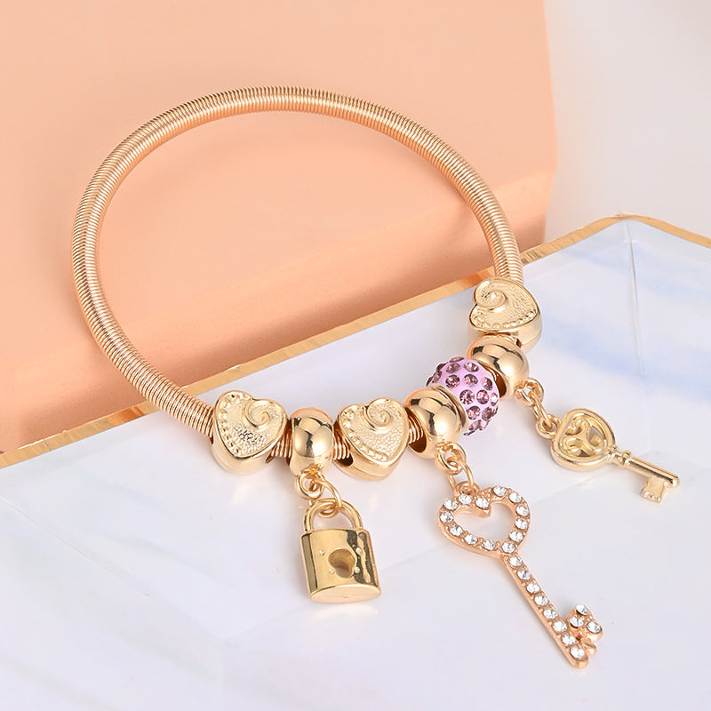 • Stylish bangle bracelet with key lock and heart rhinestone pendant
