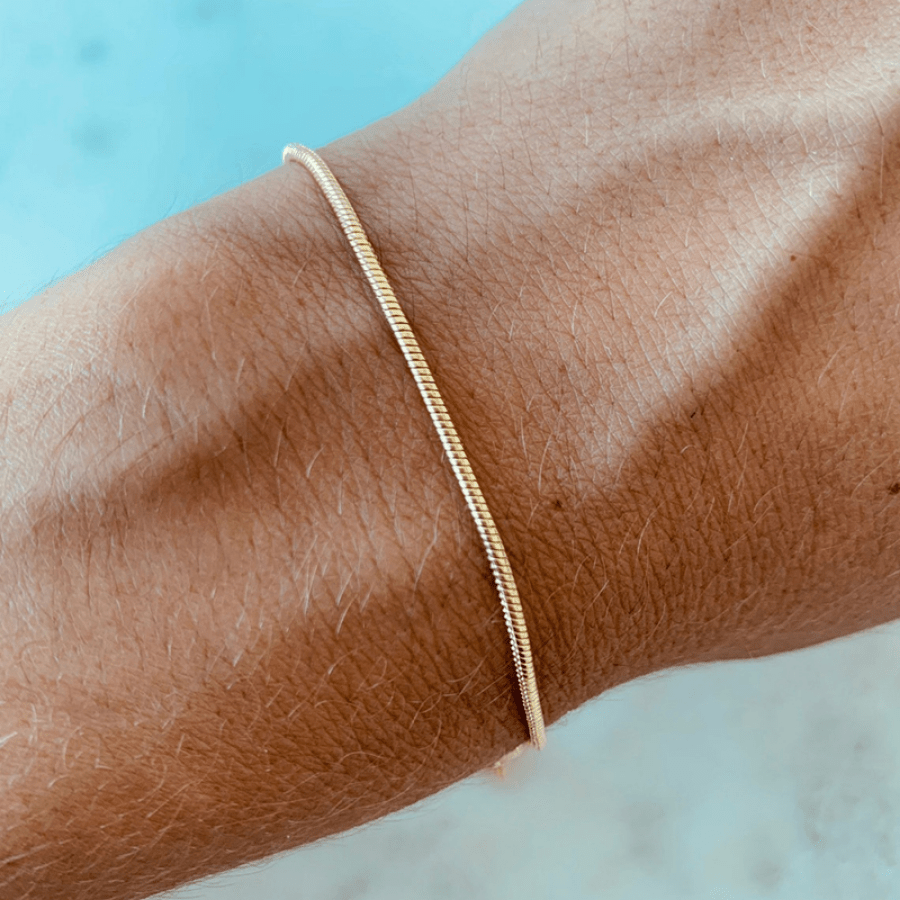 This stylish golden bracelet is suitable for both men and women. Made from durable stainless steel, it features a snake link chain design and a secure lobster clasp with a snap button closure.