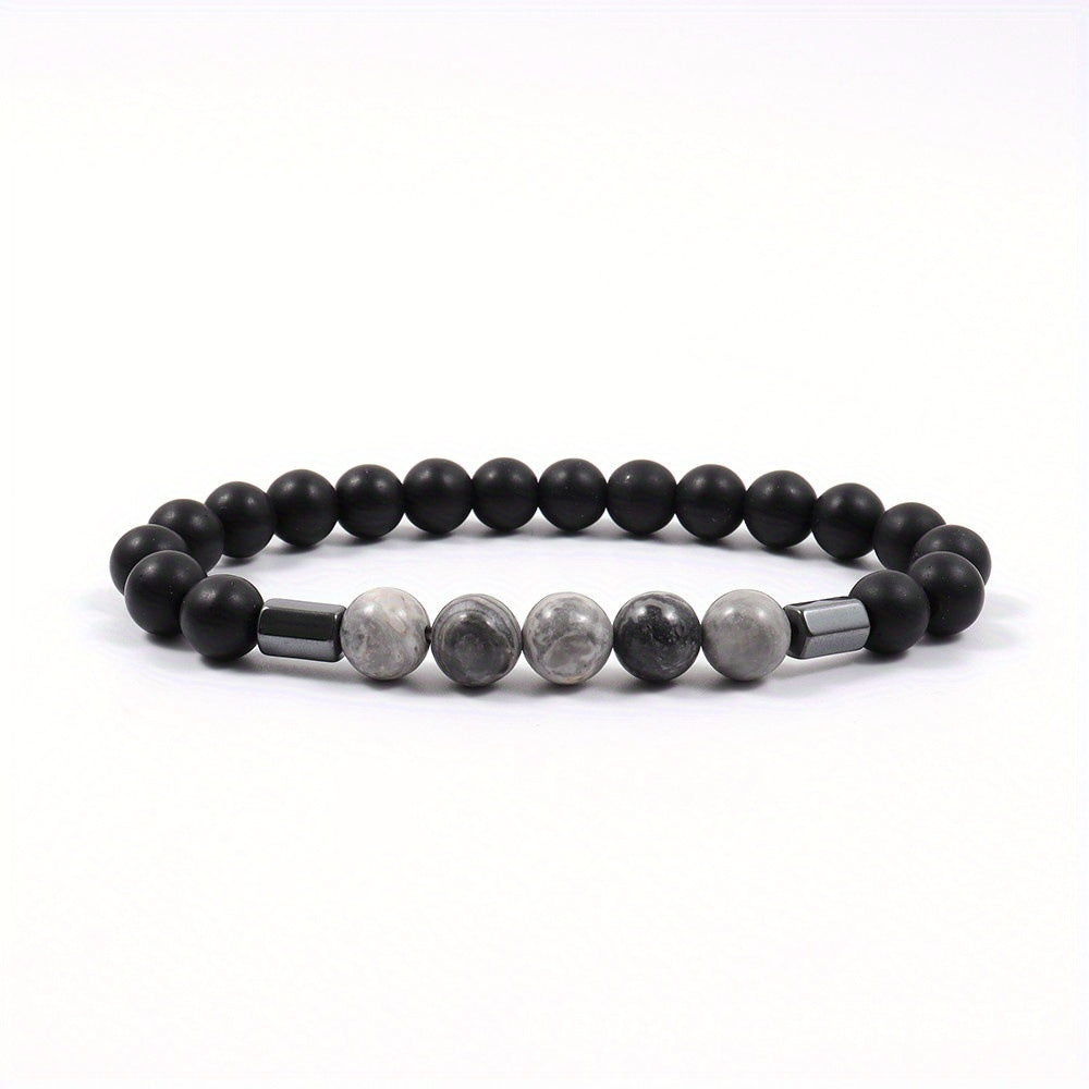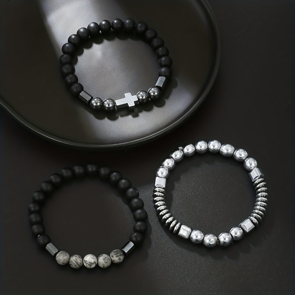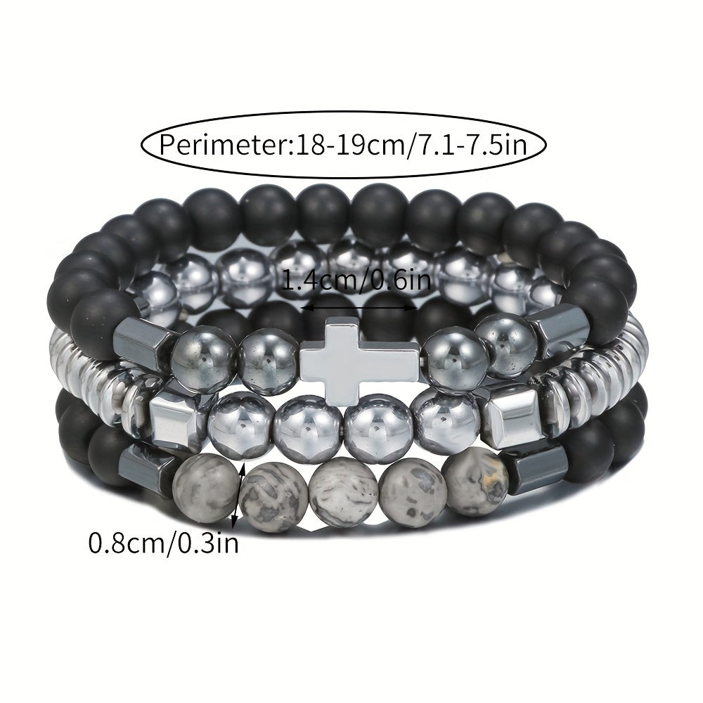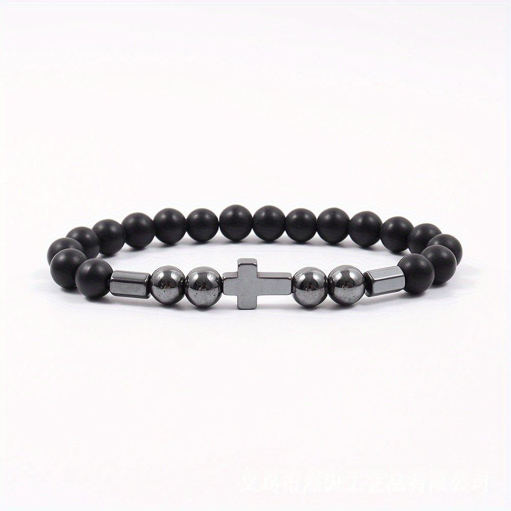 This men's beaded bracelet features a cross charm and chakra crystals for energy balance. It is a stylish and therapeutic accessory for daily wear.