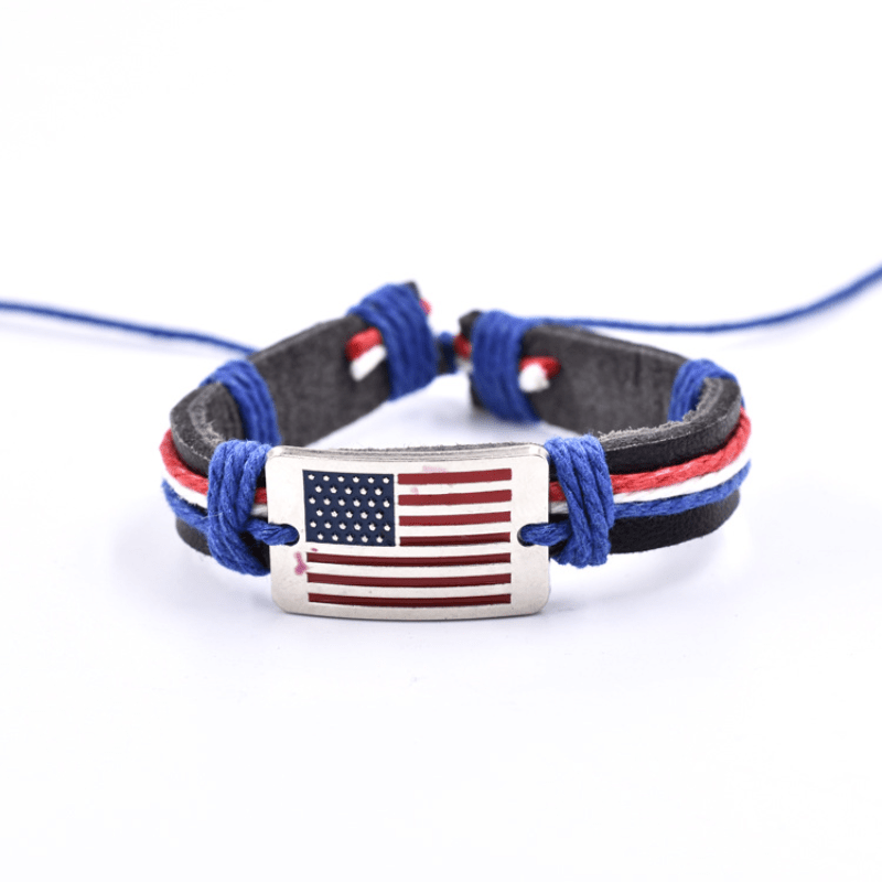 Show your patriotic spirit with this adjustable red wax thread leather bracelet featuring the national flag design. Perfect for men.