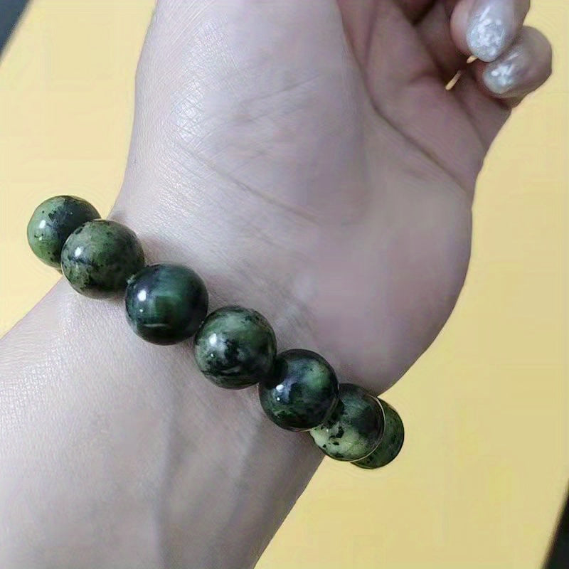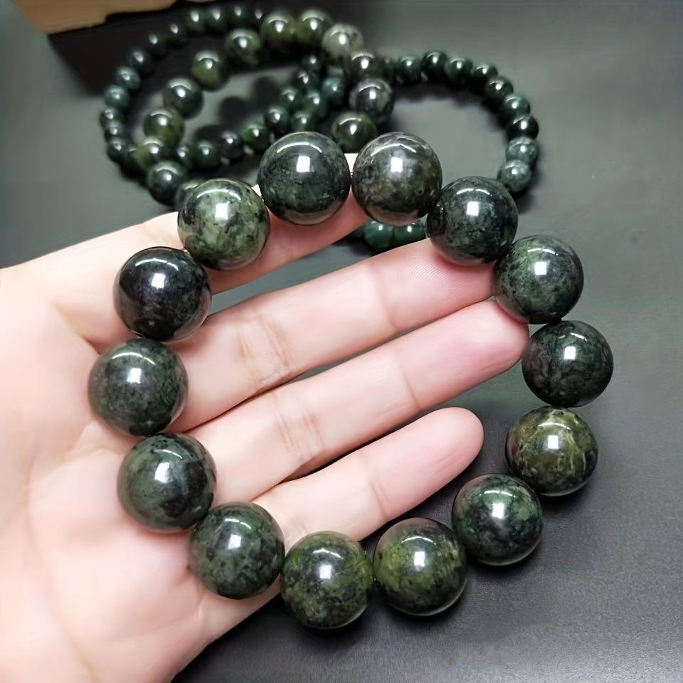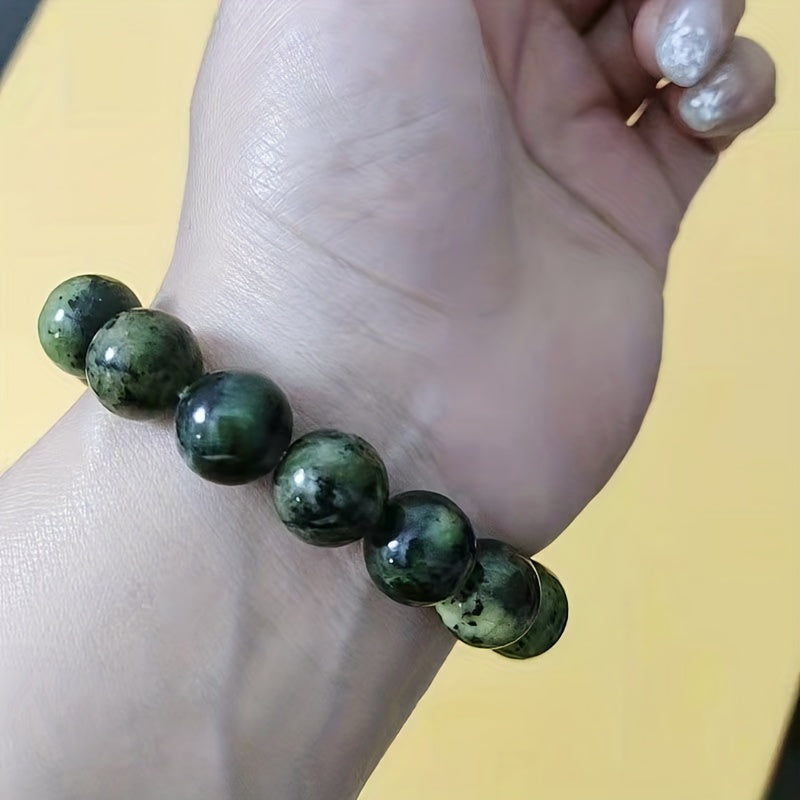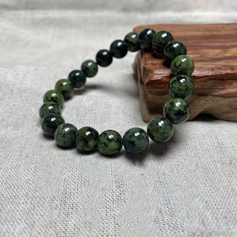 This men's bracelet features natural olive green jade stones combined with meteorite and graphite beads. The unique blend of stones creates a stylish and masculine accessory.