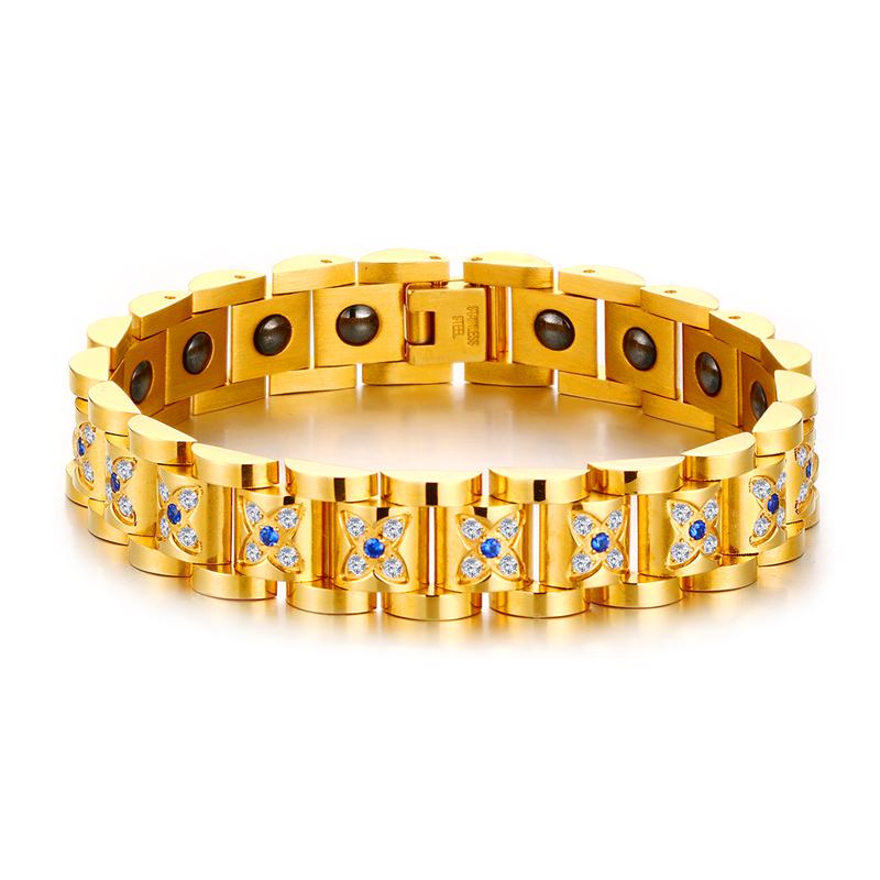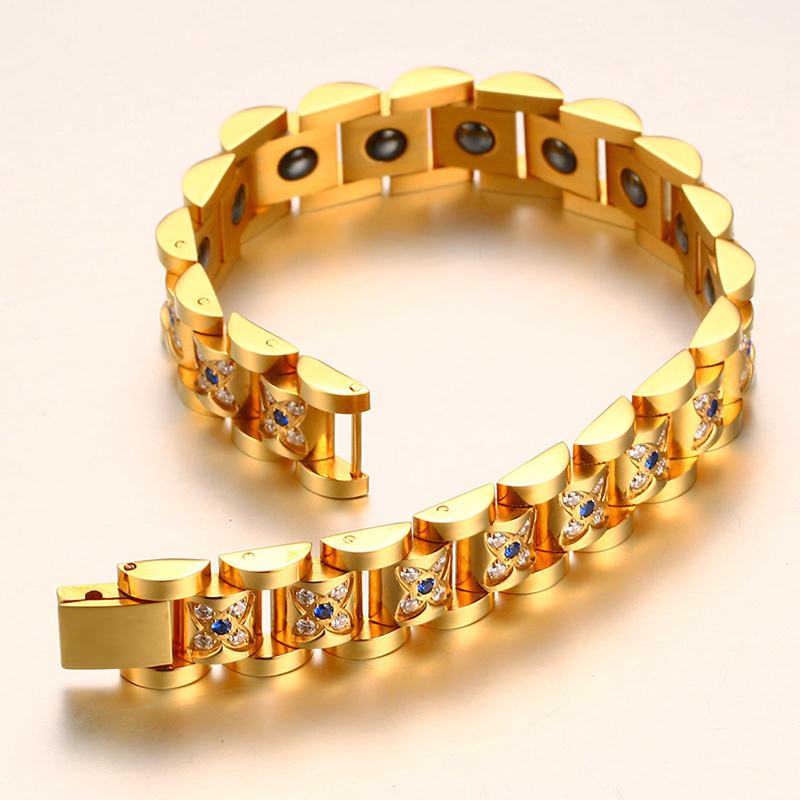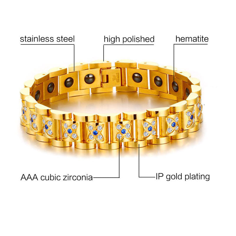 This stylish bracelet features zircon stones, titanium steel construction, and a removable design. Available in golden or silver colors.