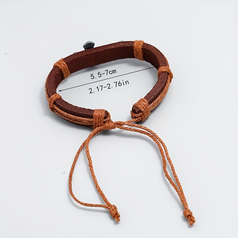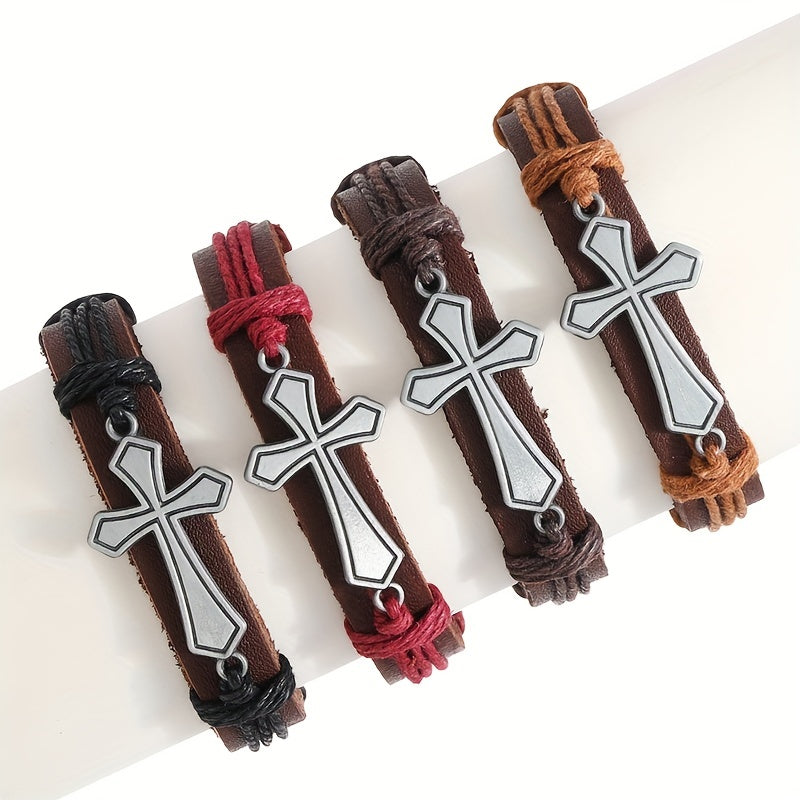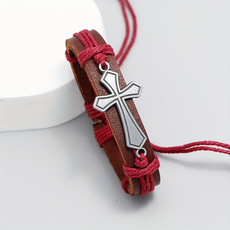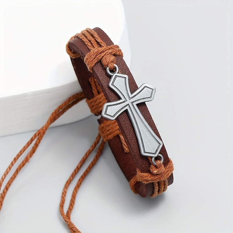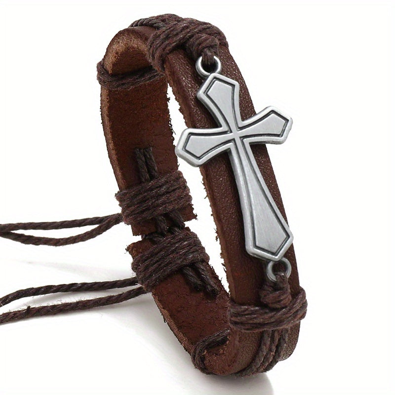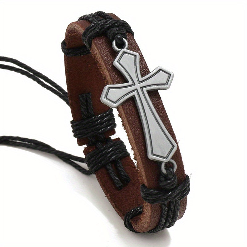 Vintage style leather bracelet with a cross design, suitable for men. Features braided detailing and adjustable size for a comfortable fit.