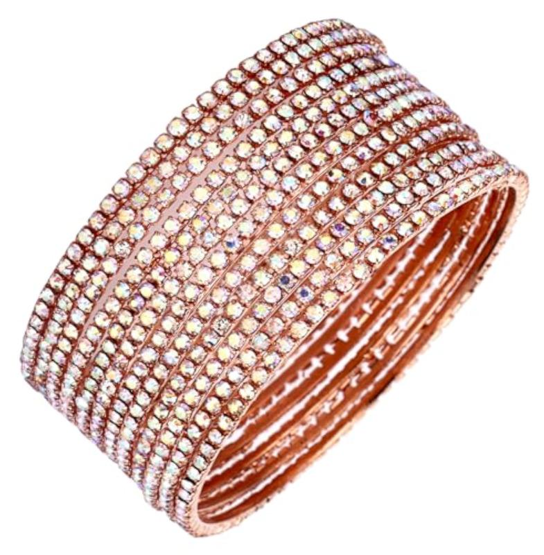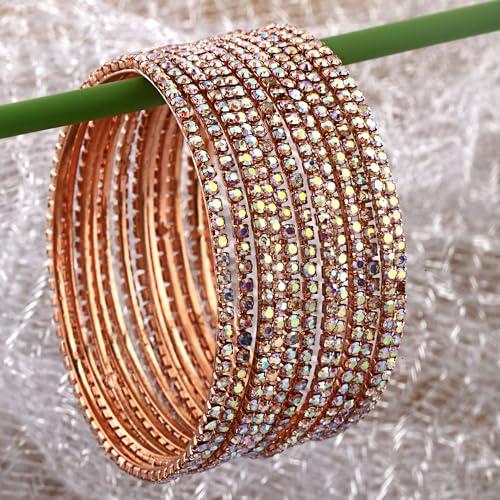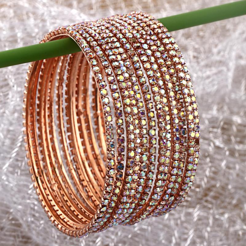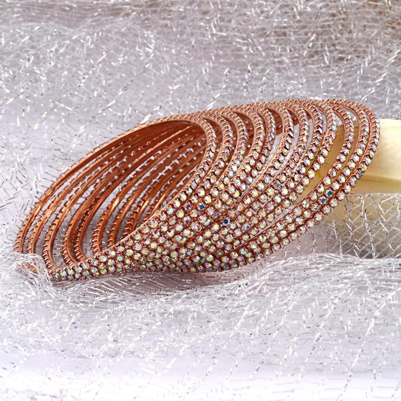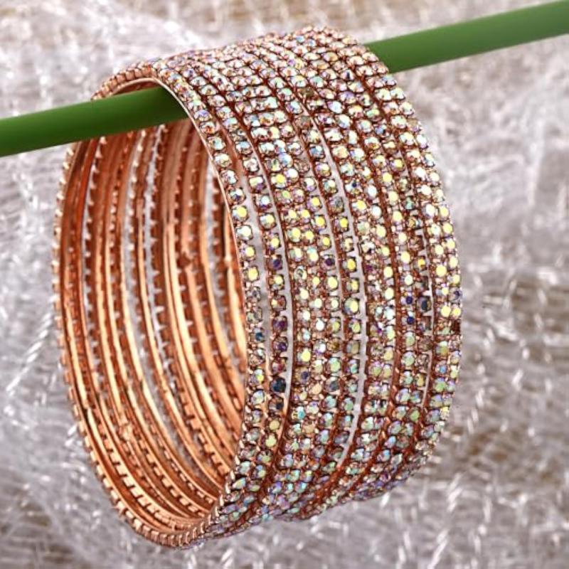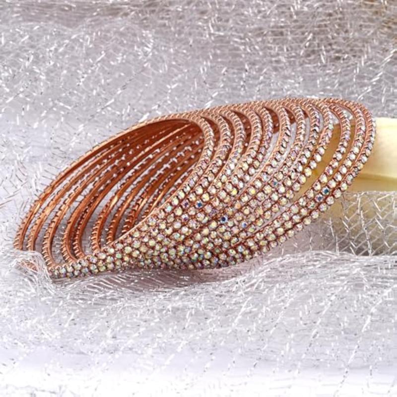 Enhance your traditional look with this set of 12 plated stone bangles. The beautiful rainbow rose gold color adds a touch of elegance to your outfit. Available in size 2-8.