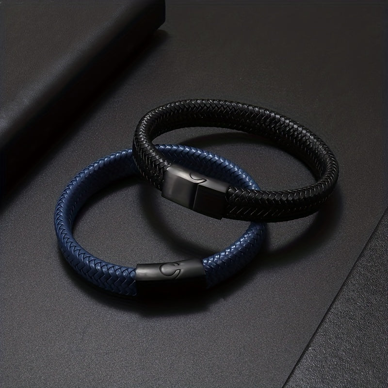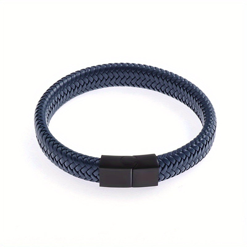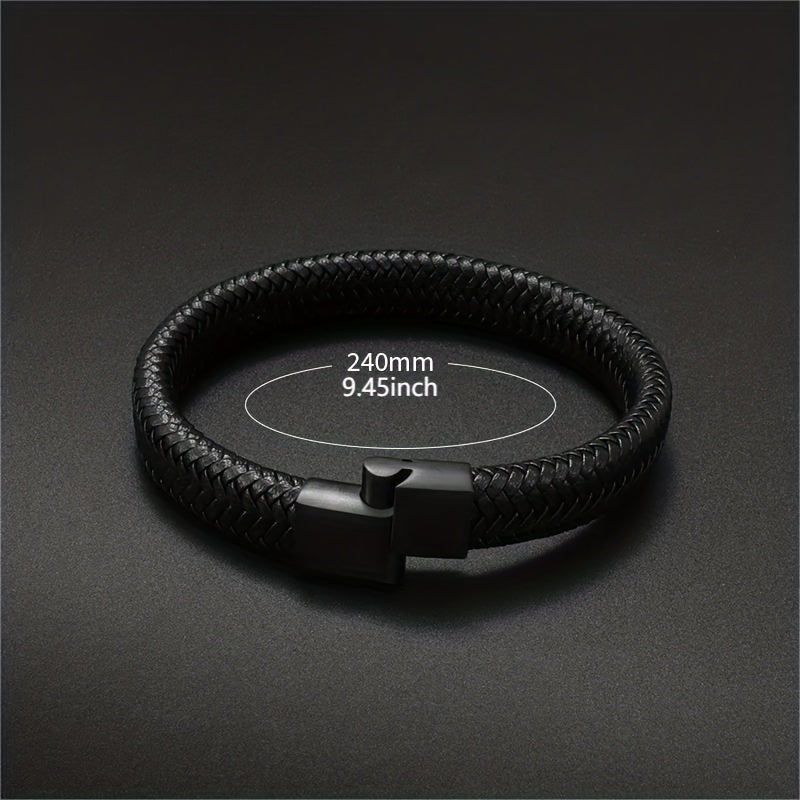 Add a touch of style to your outfit with this high-quality single braided leather bracelet. The bracelet features a metal magnetic clasp for easy wear and removal. Perfect for men and women, this bracelet is a great accessory for any party or special occasion. Give it as a gift to someone special!