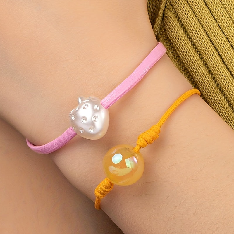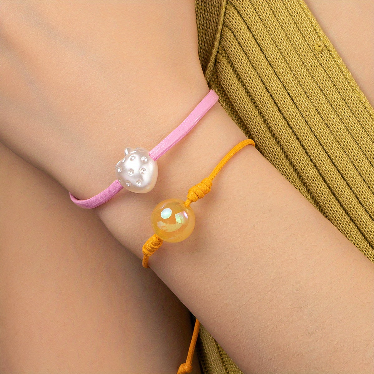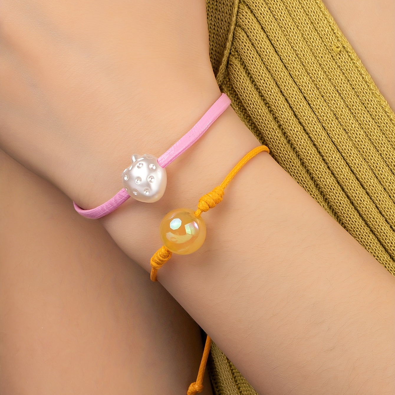 Add a touch of fun to your holiday or vacation outfits with this 2-piece set of bracelets featuring strawberry and yellow acrylic beads. Perfect for beach days or summer adventures.