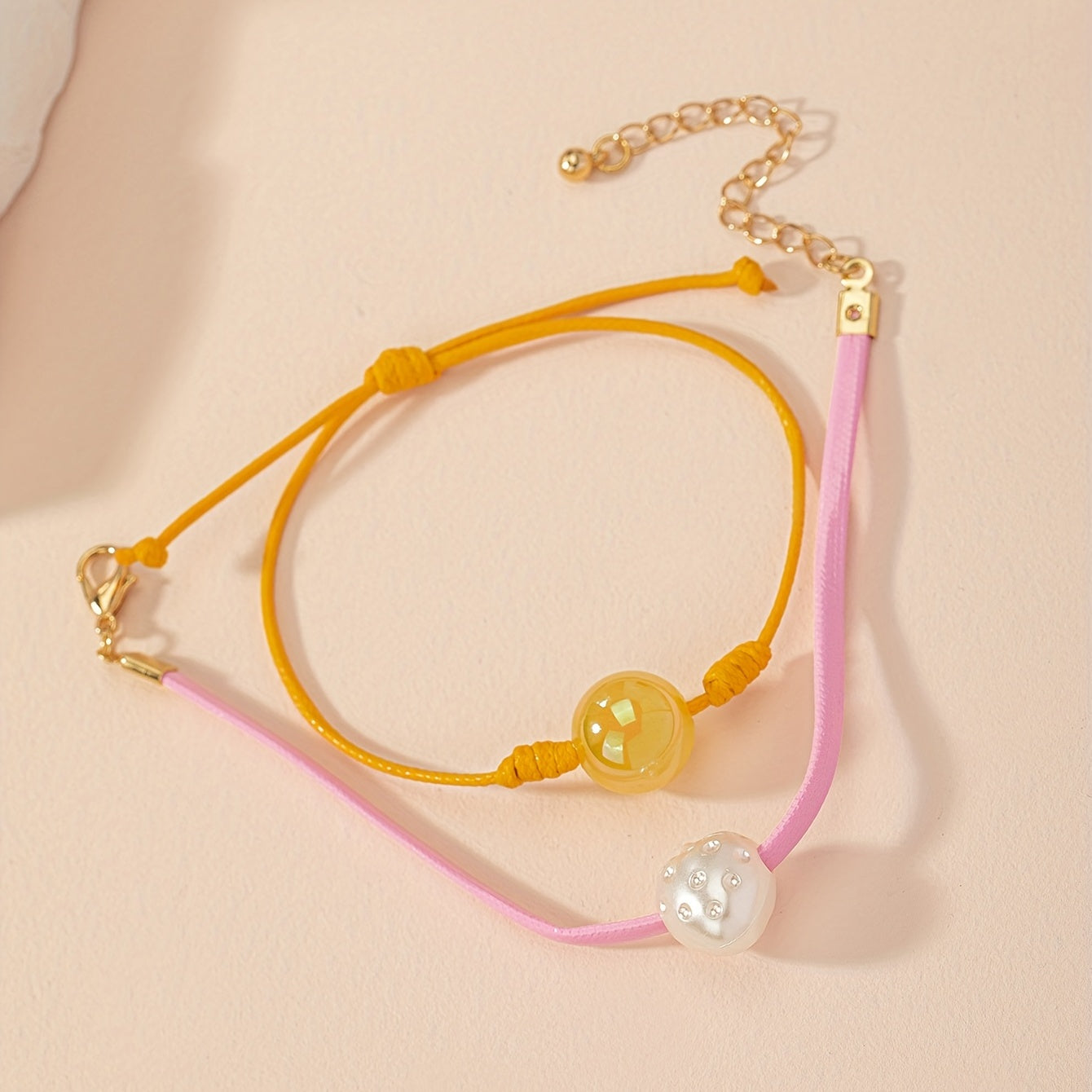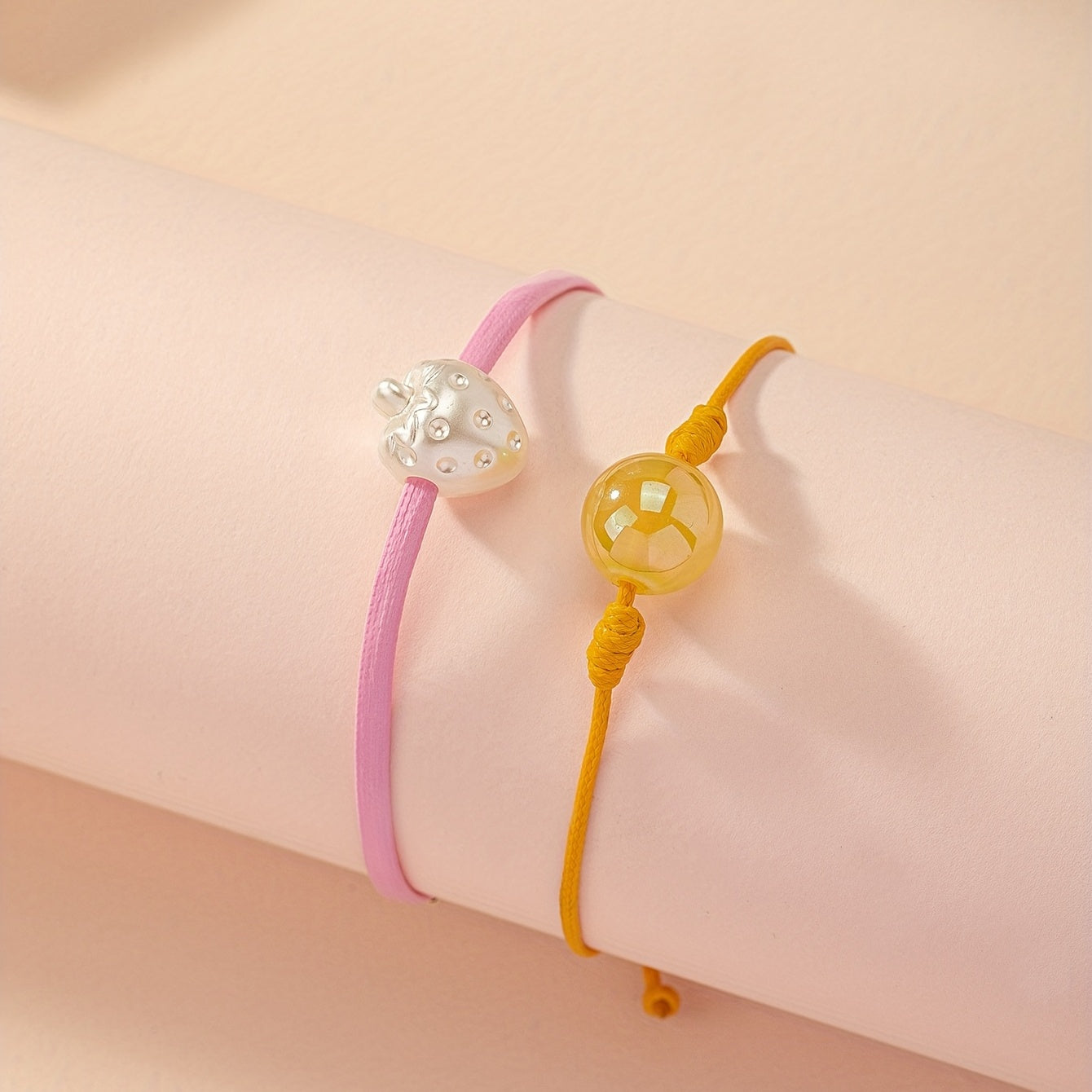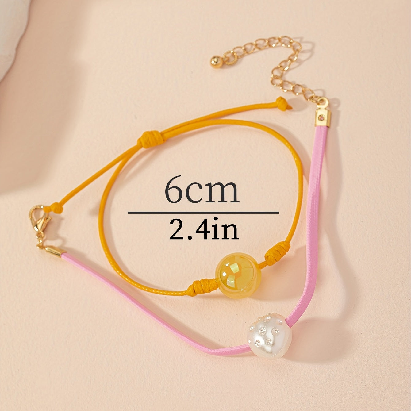 Add a touch of fun to your holiday or vacation outfits with this 2-piece set of bracelets featuring strawberry and yellow acrylic beads. Perfect for beach days or summer adventures.
