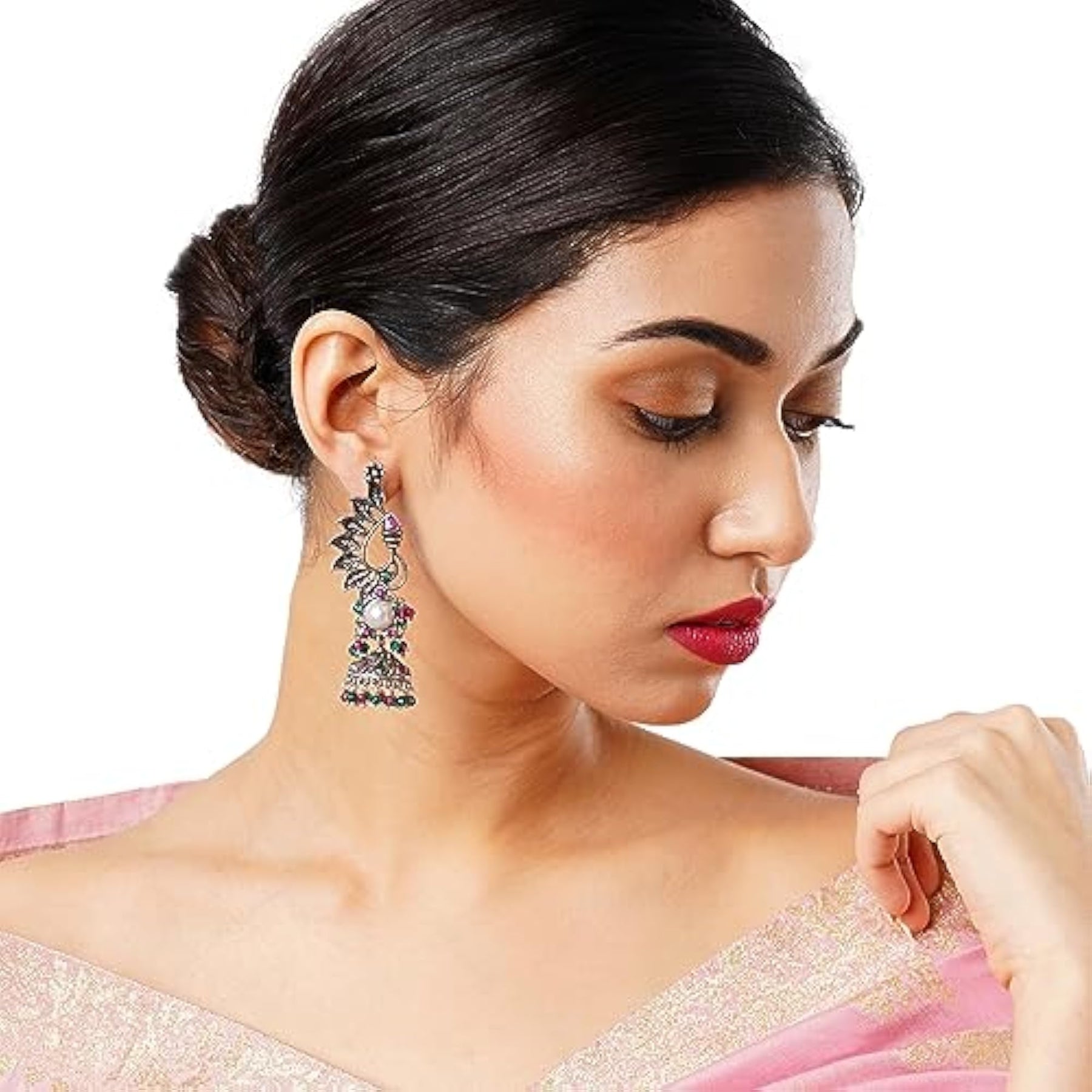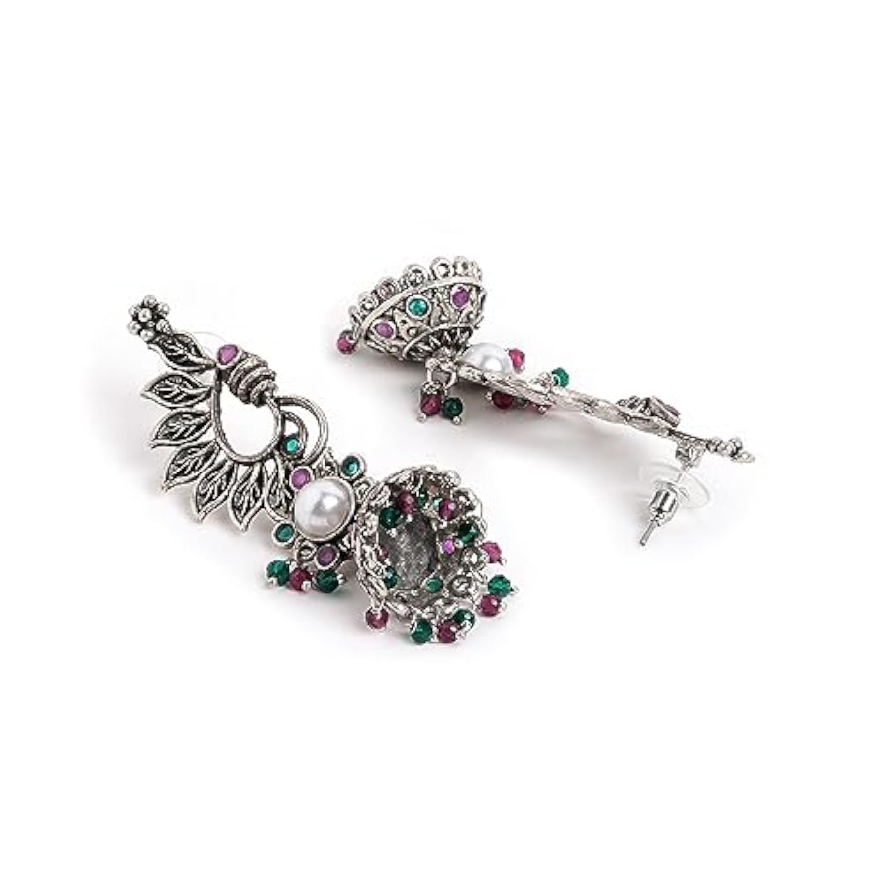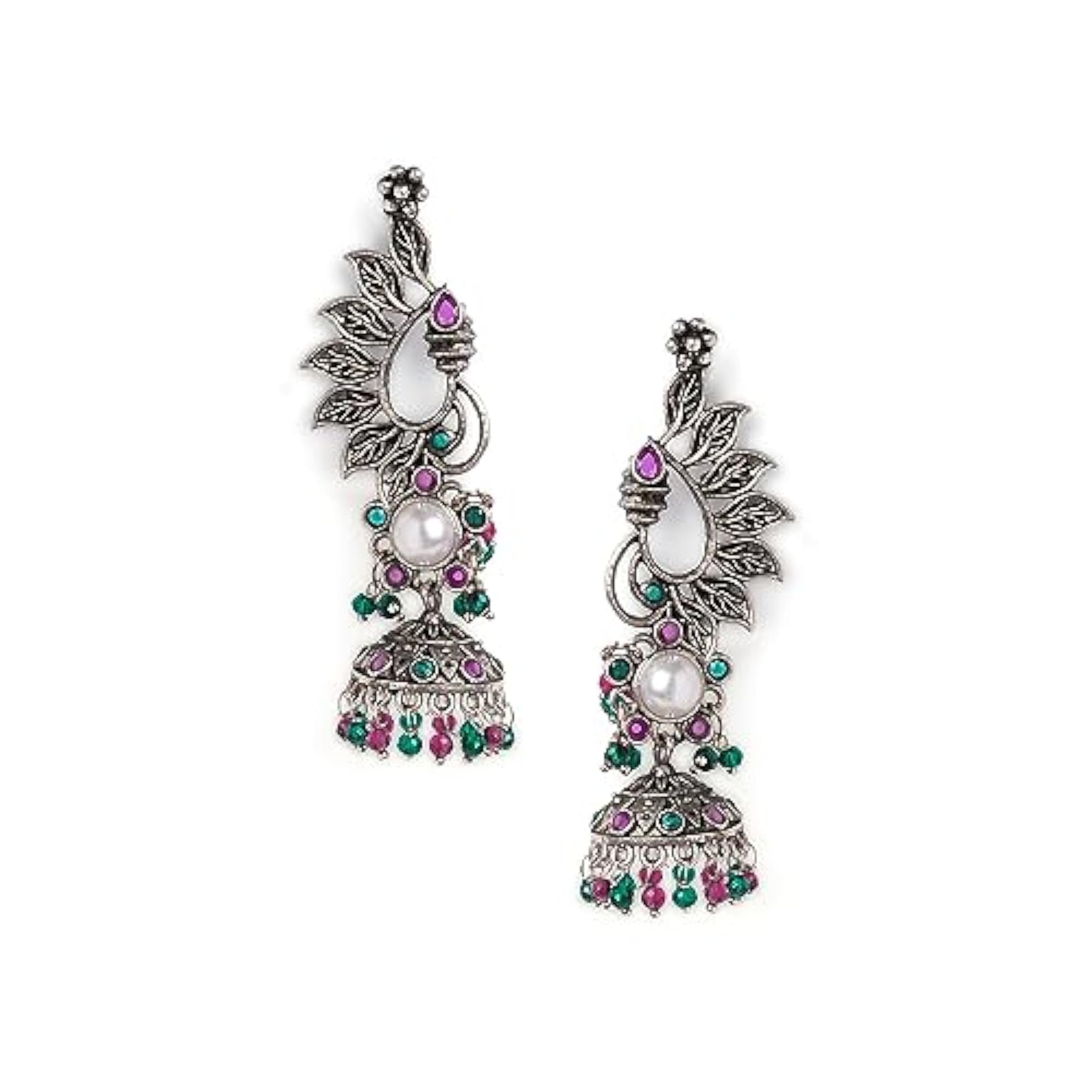 These earrings are uniquely handcrafted with a touch of ethnic charm, featuring intricate detailing that adds to their beauty. Perfect for adding a touch of traditional style to your look.
