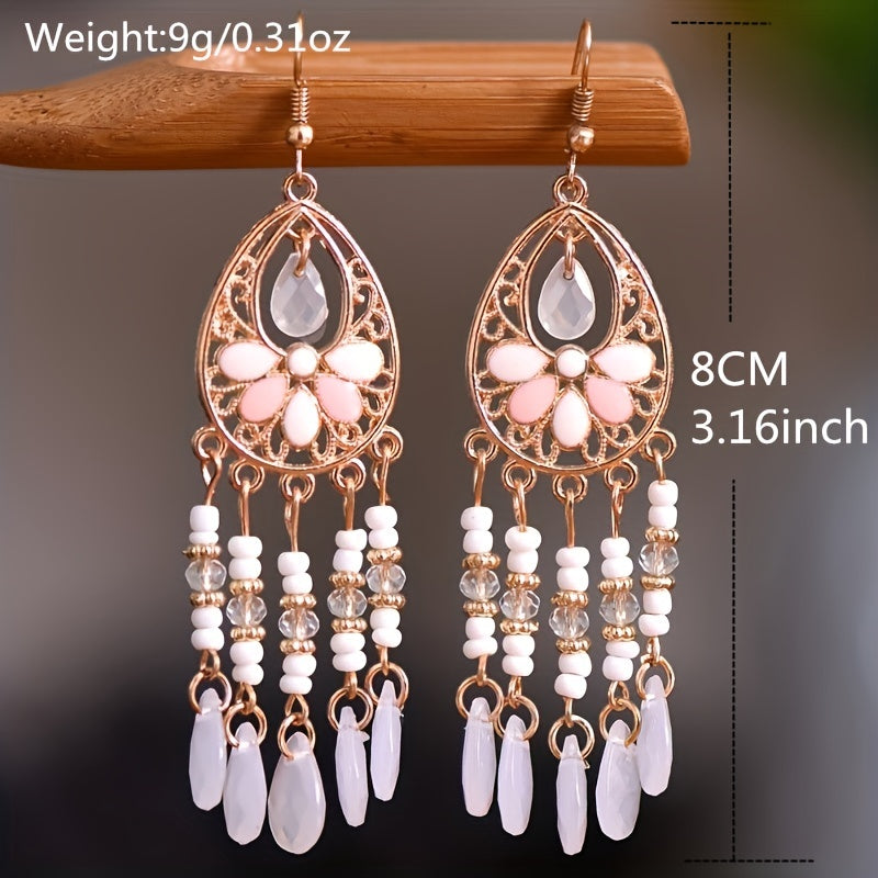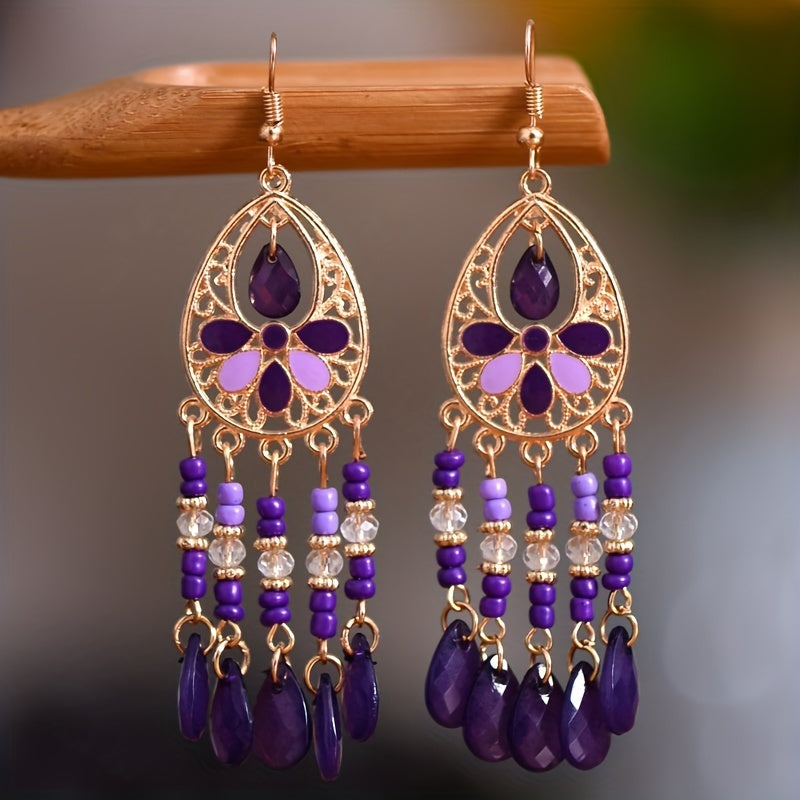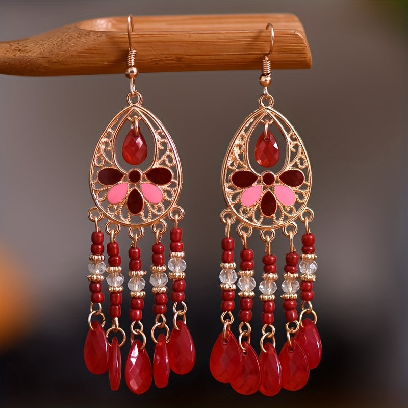 Add a touch of vintage bohemian style to your outfits with these long ethnic tassels flower earrings. Perfect accessory for a unique and trendy look.