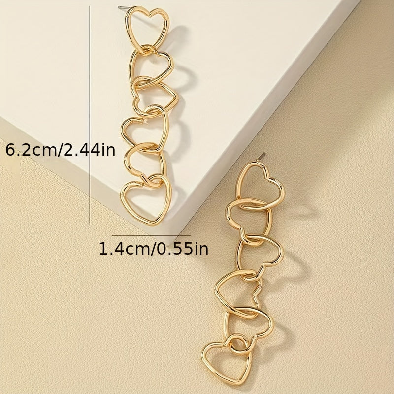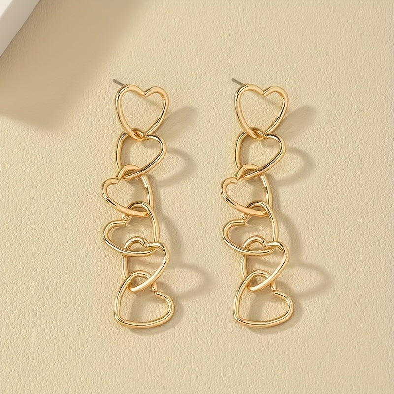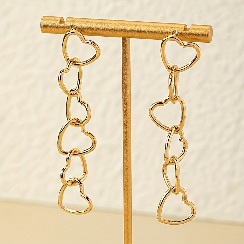 These stylish dangle earrings feature a charming hollow heart shape design in a golden finish. They are perfect for adding a touch of elegance to any outfit.