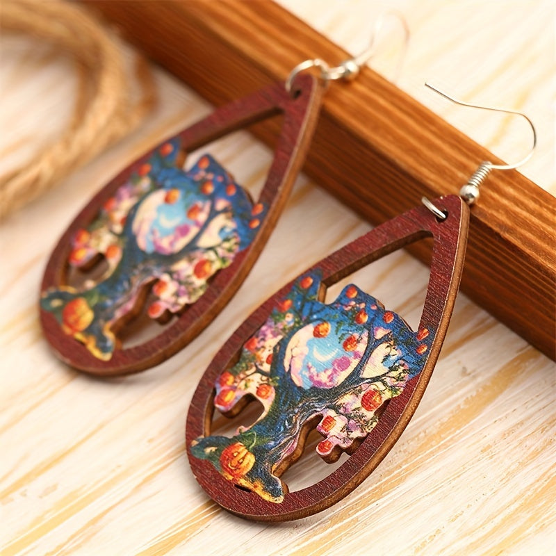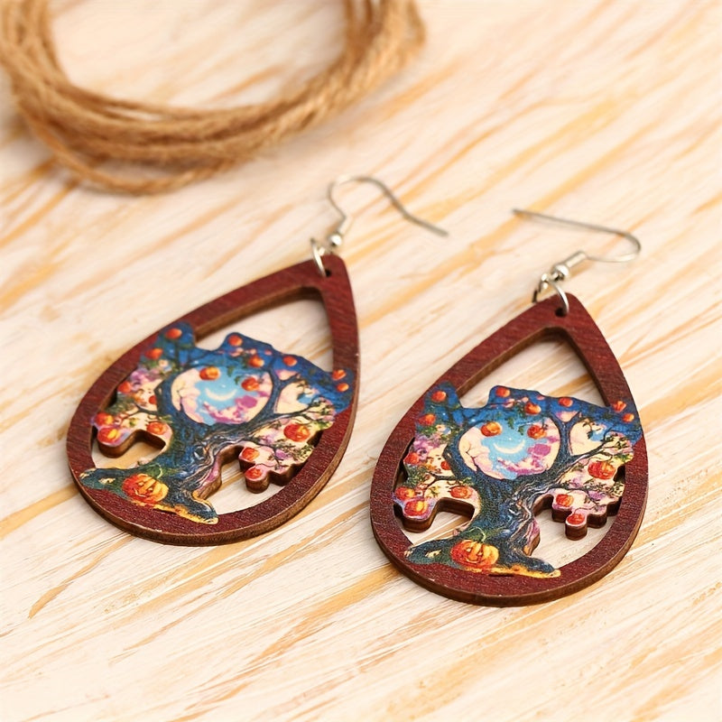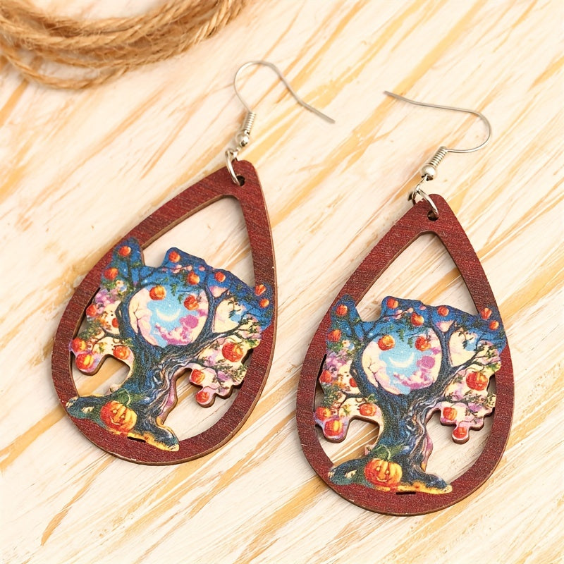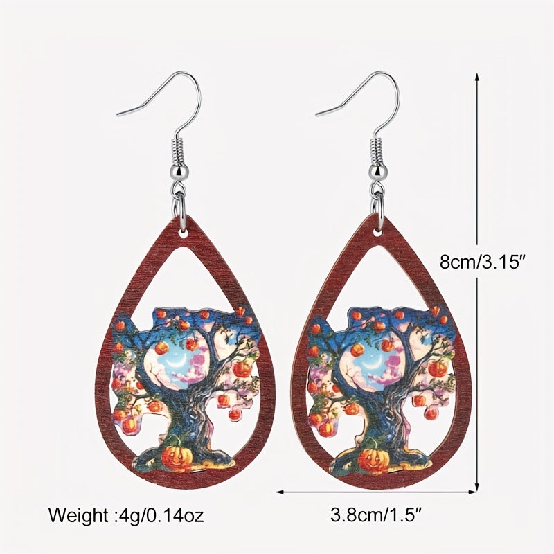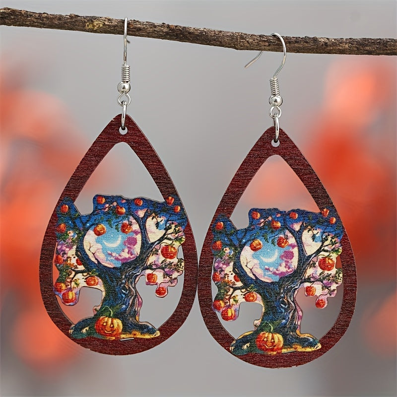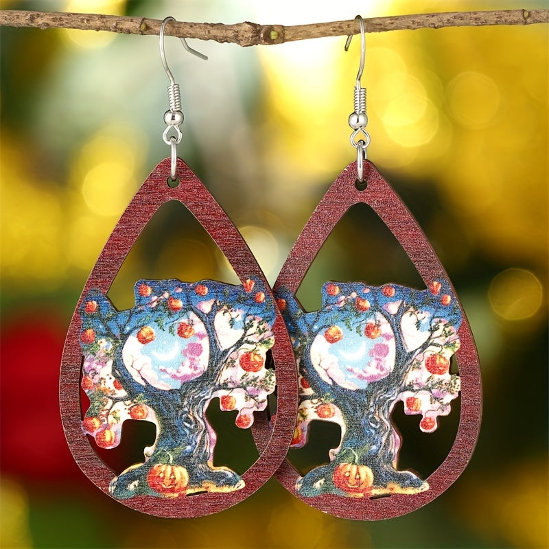 Add a touch of spooky charm to your look with these Halloween-themed teardrop earrings featuring a pumpkin tree design. These punk style wooden earrings are perfect for the season.