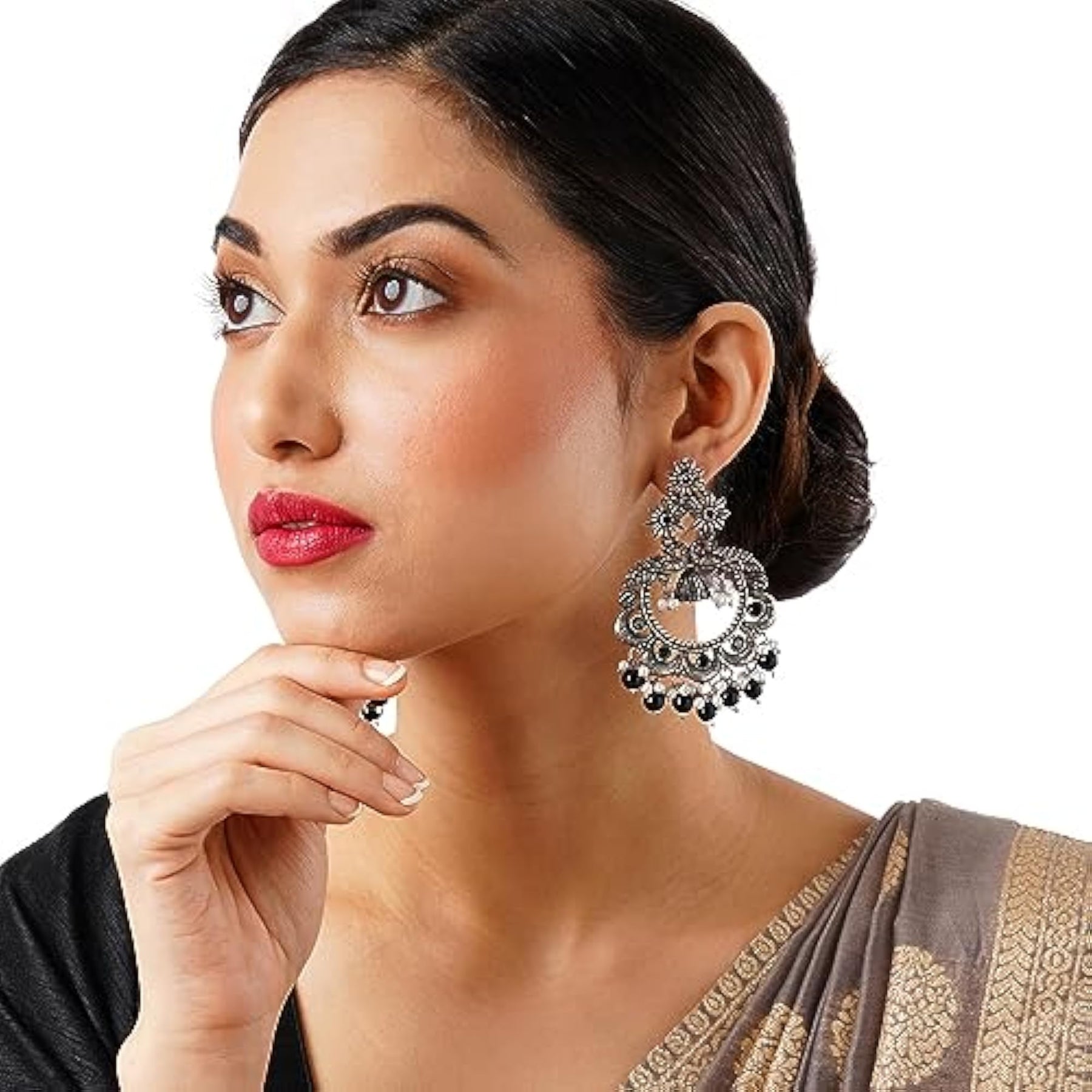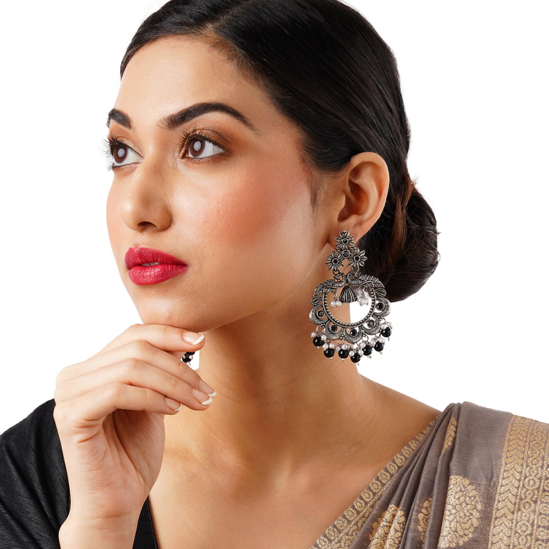 Add a touch of cultural elegance to your look with these statement earrings featuring exquisite handcrafted detailing.