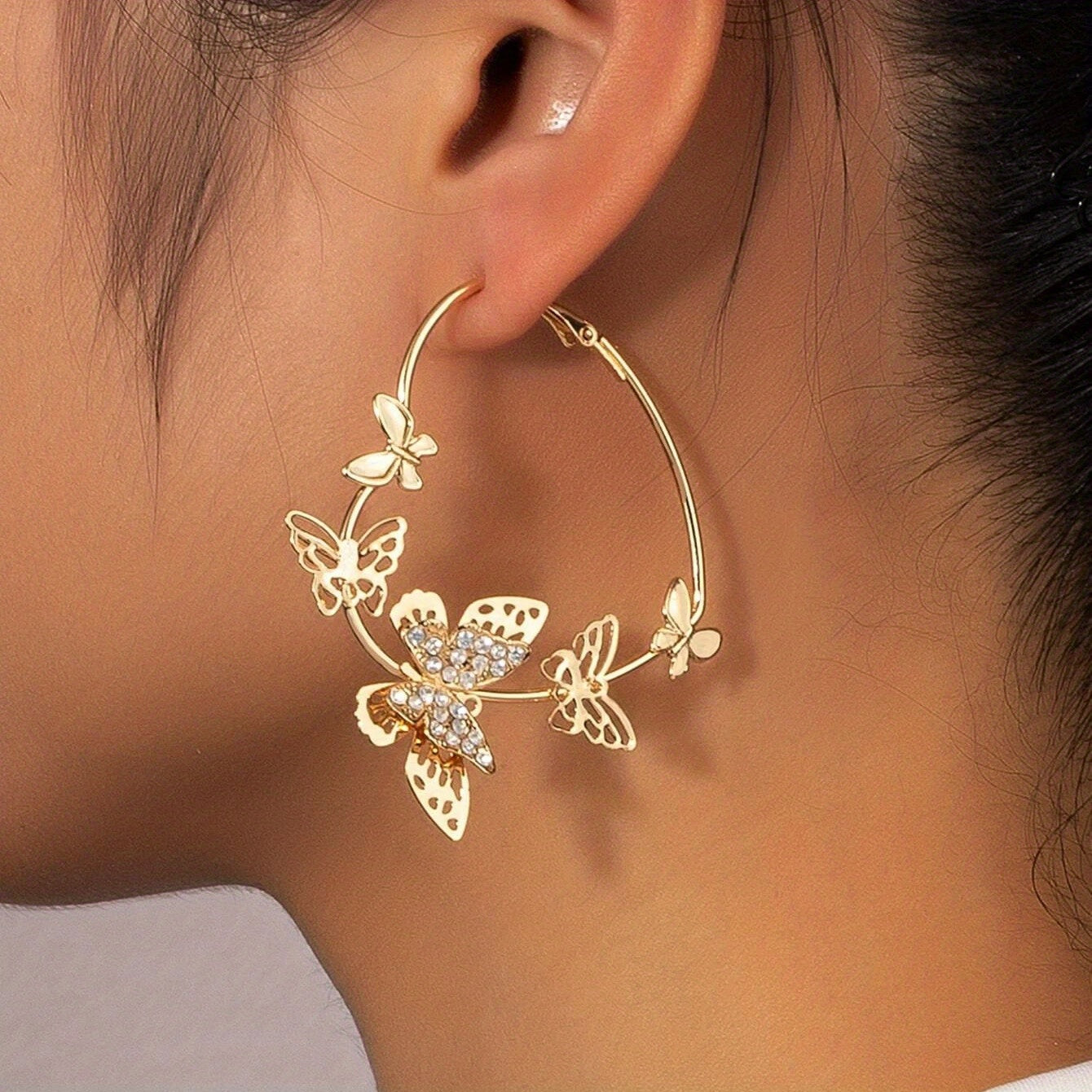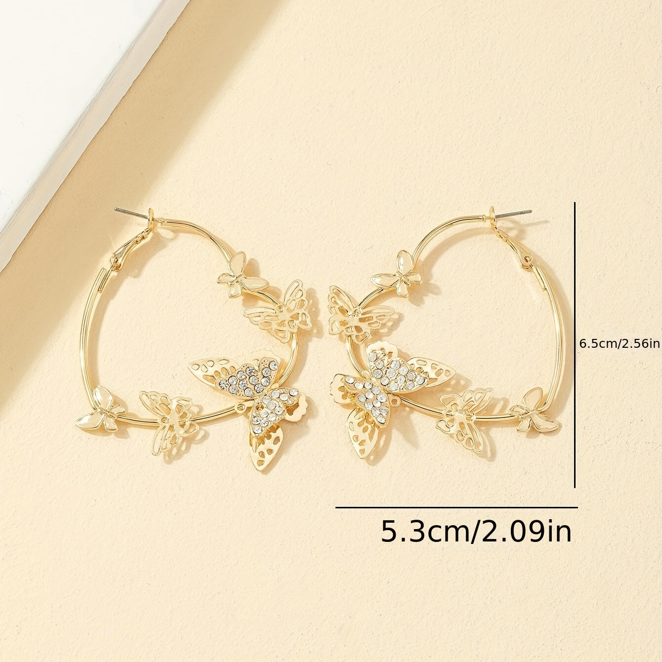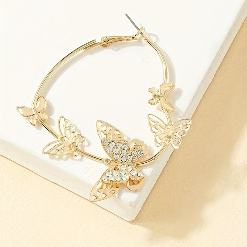 These stunning hoop earrings feature a heart shape design with golden butterflies and rhinestone inlays. Perfect for adding a touch of elegance to any outfit.