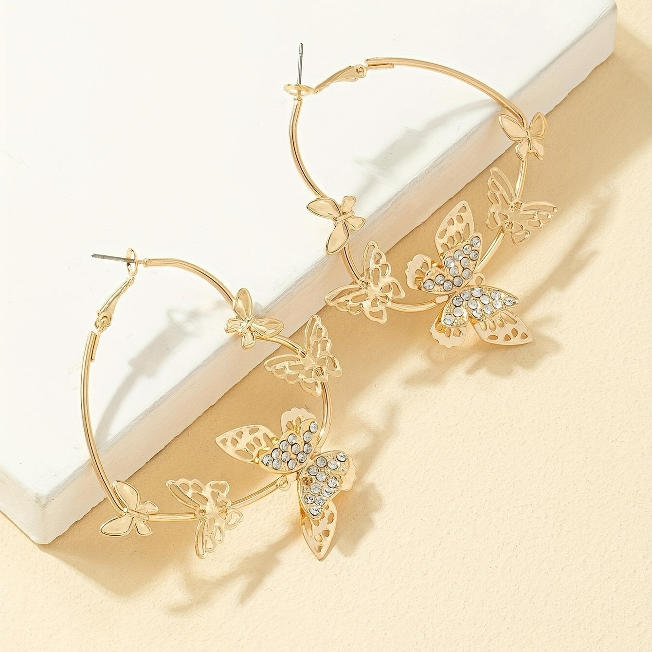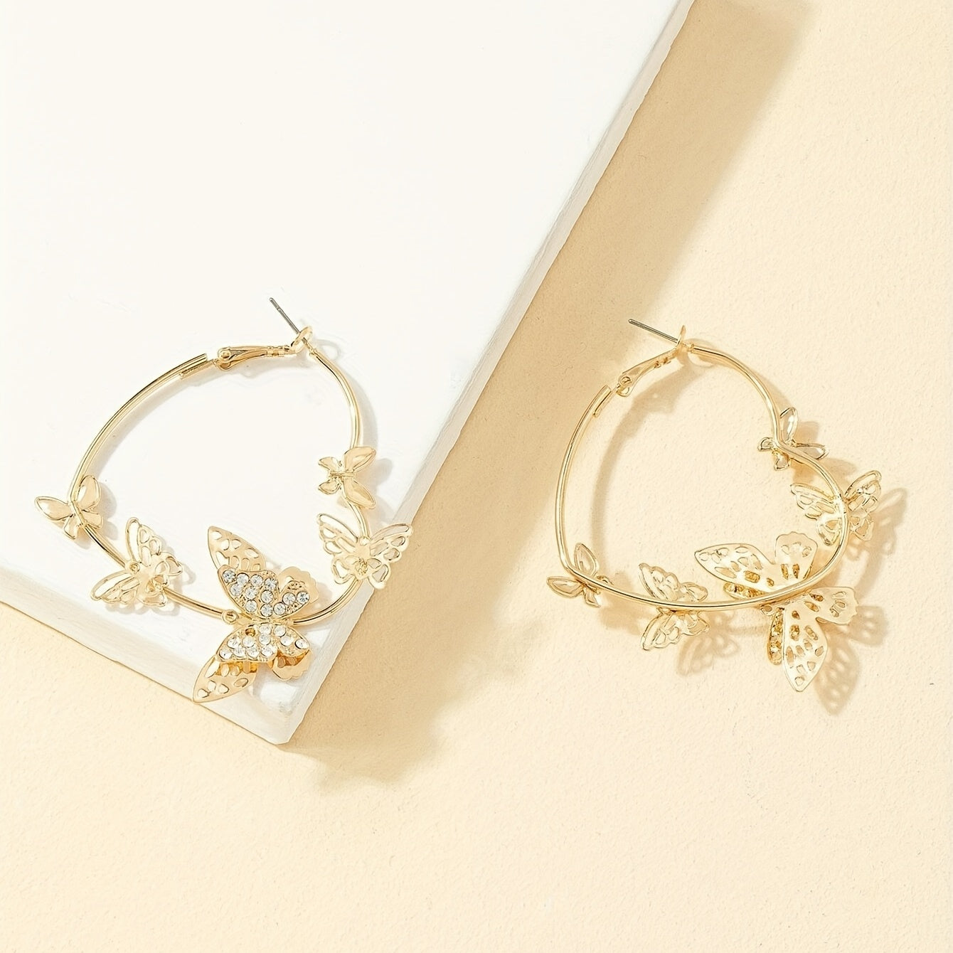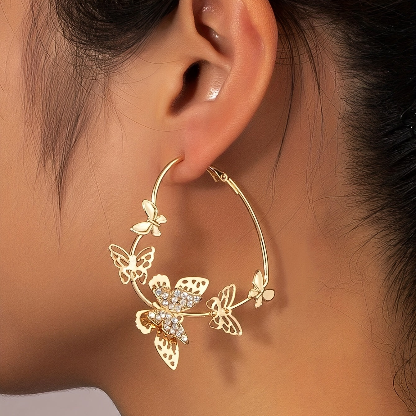 These stunning hoop earrings feature a heart shape design with golden butterflies and rhinestone inlays. Perfect for adding a touch of elegance to any outfit.