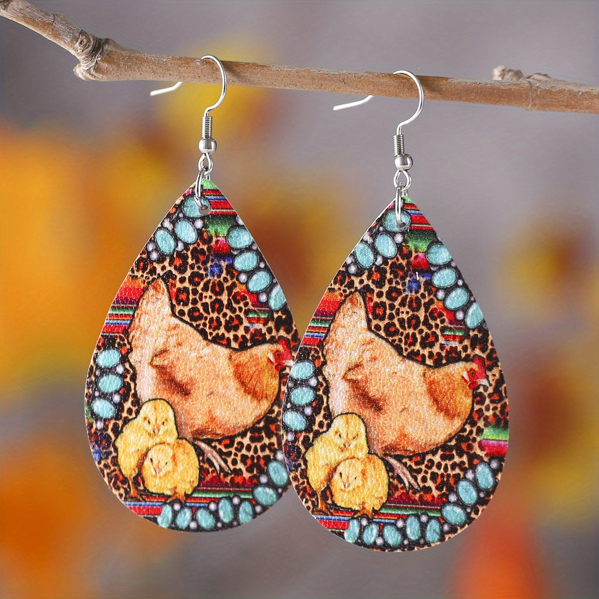 Add a touch of retro style with these double-sided water drop earrings featuring a hen and chick design. Perfect for parties or holidays.
