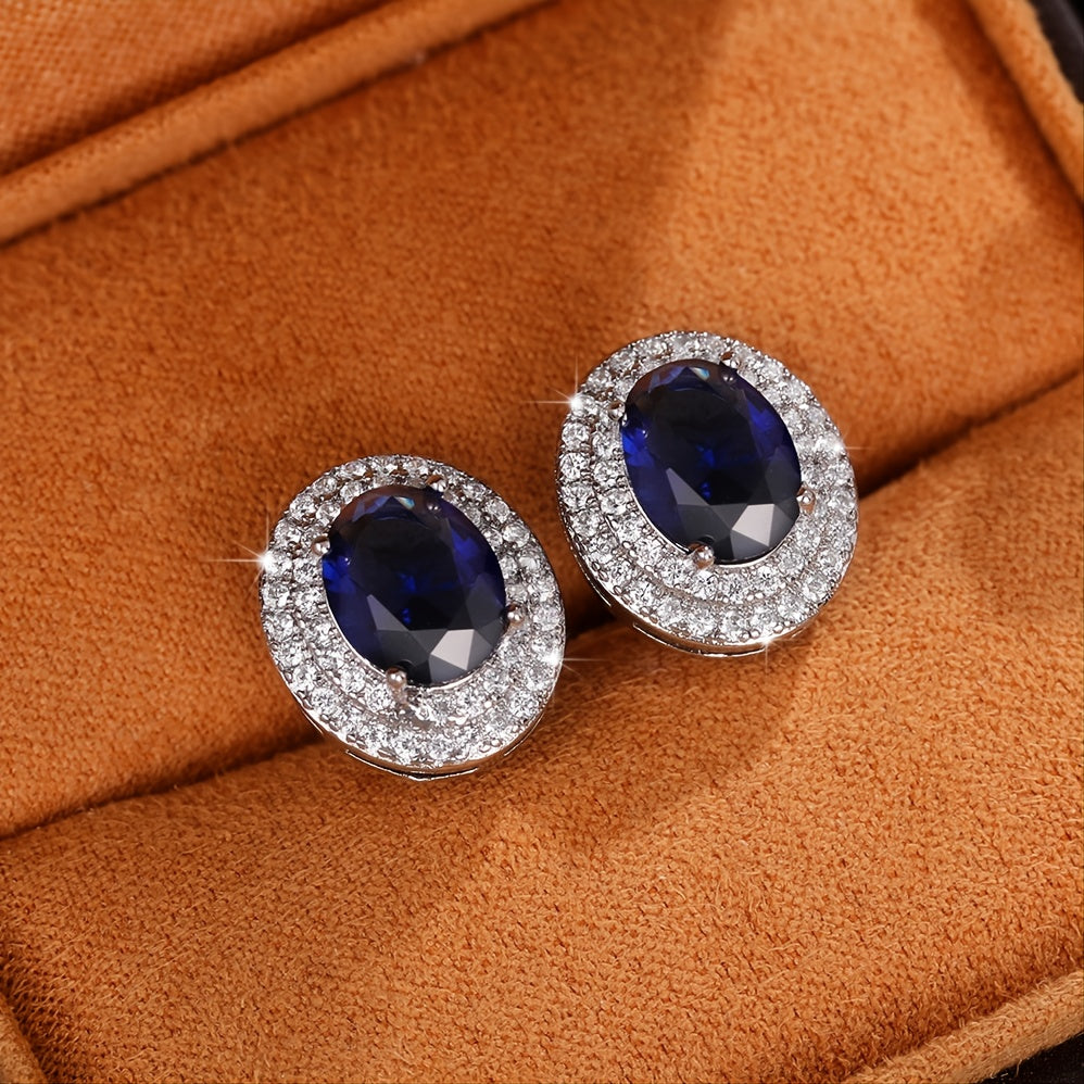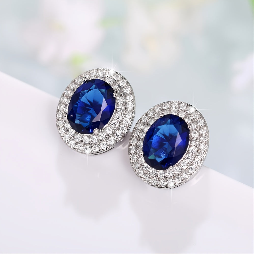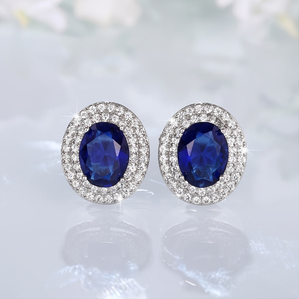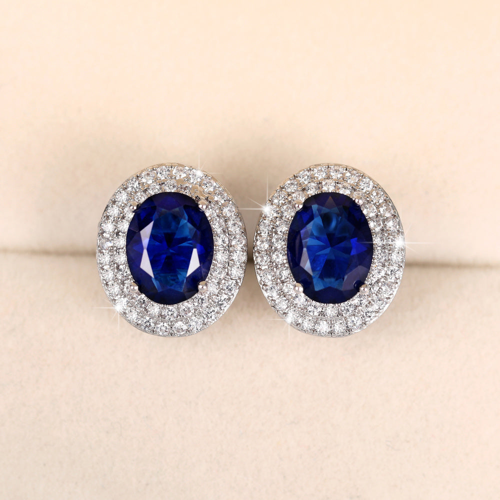 Elegant bridal engagement wedding earrings for women featuring oval cut sapphire studs. These silver plated earrings make a perfect jewelry gift.