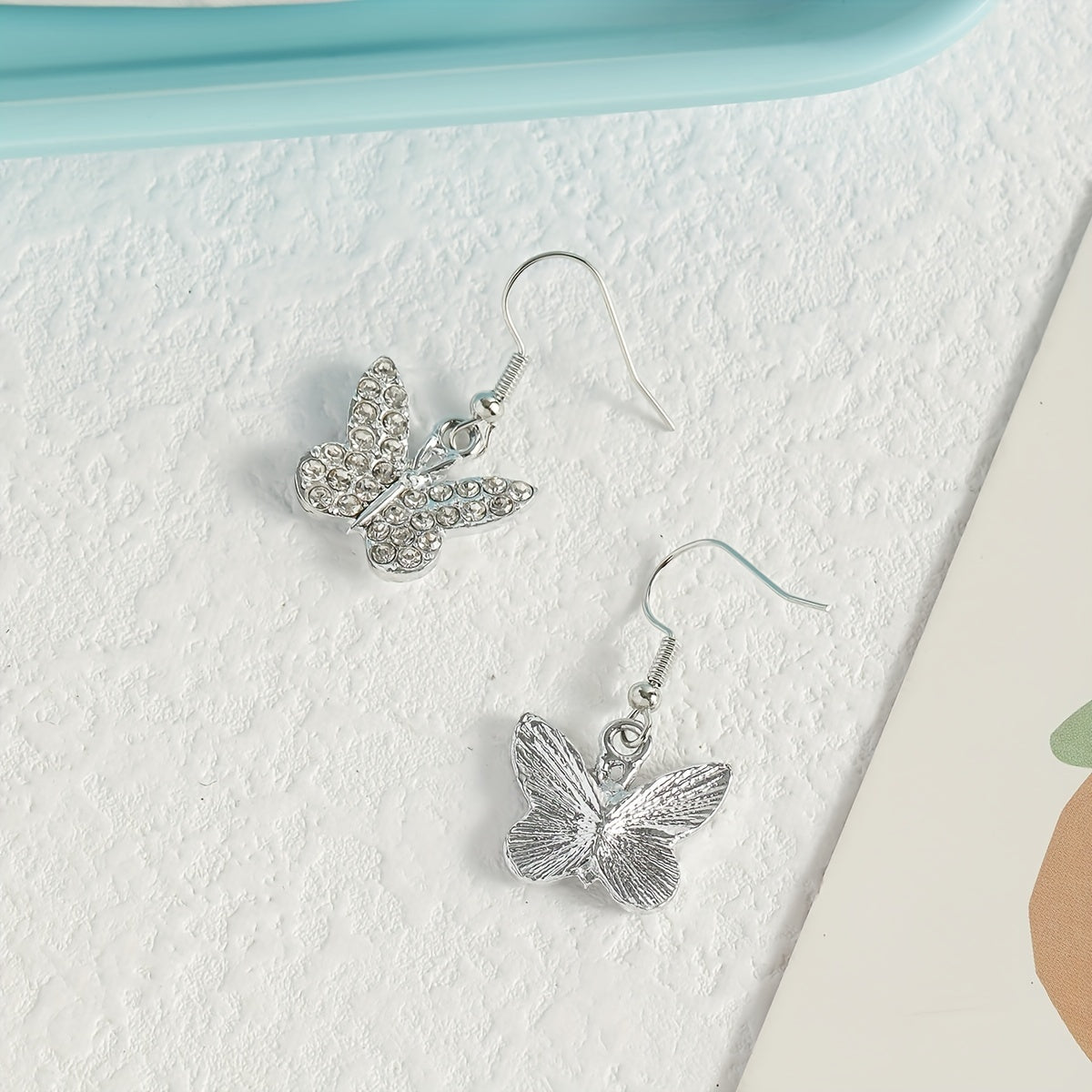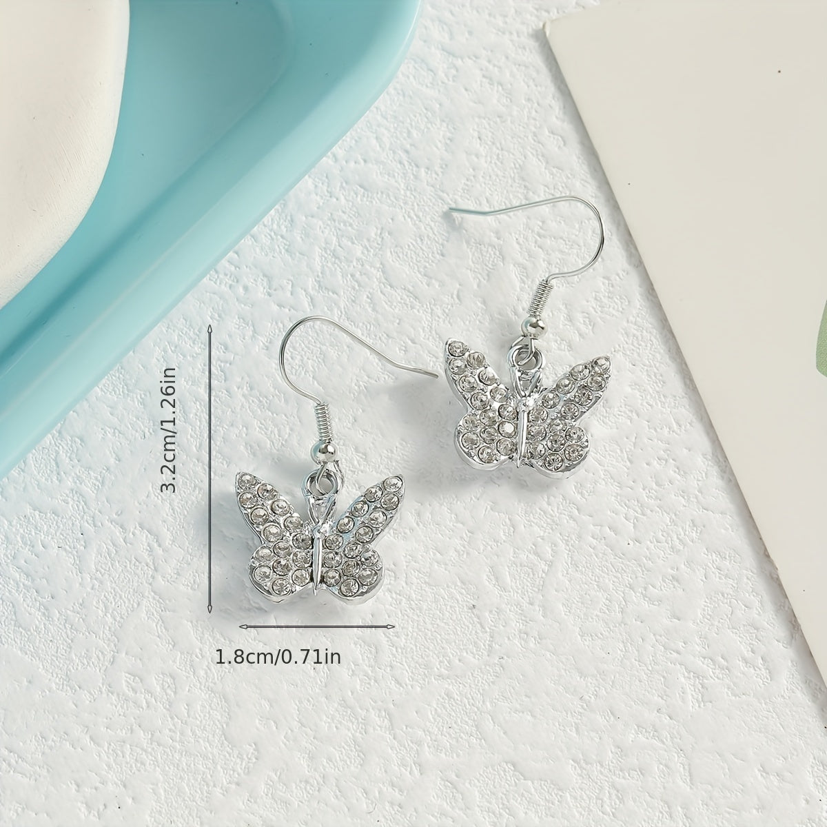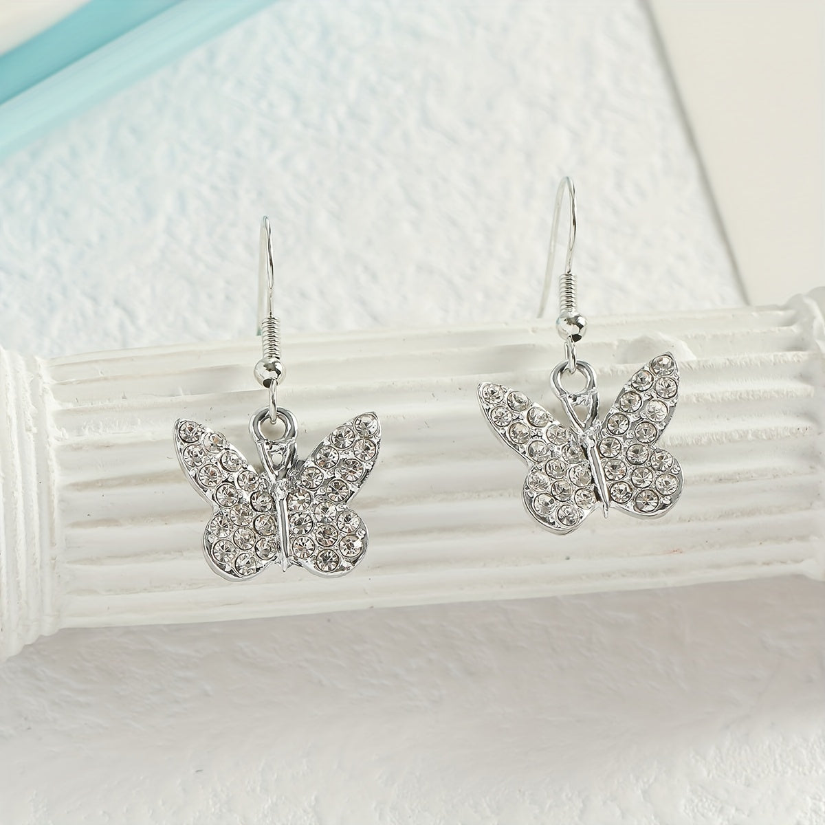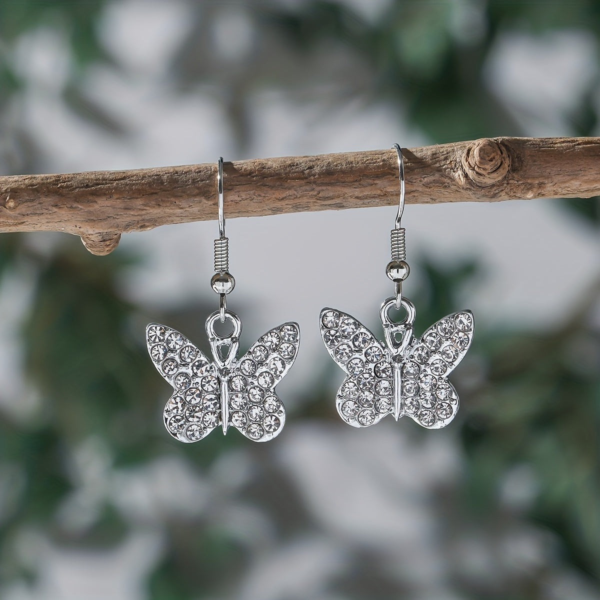 • Silvery butterfly dangle earrings with full rhinestone decor