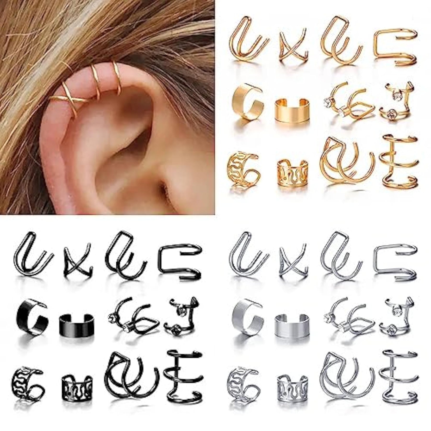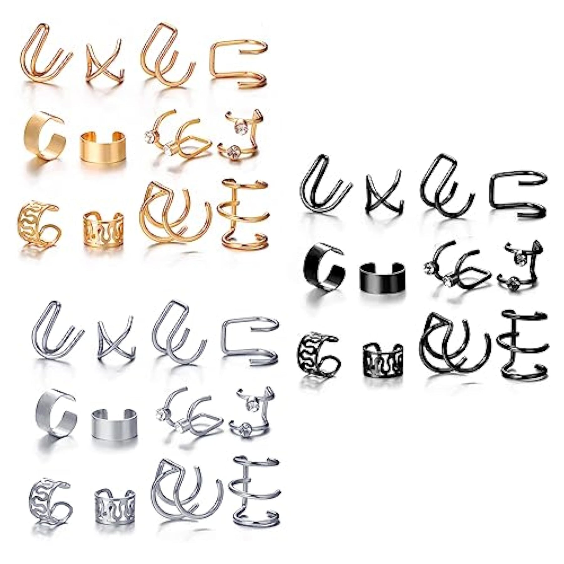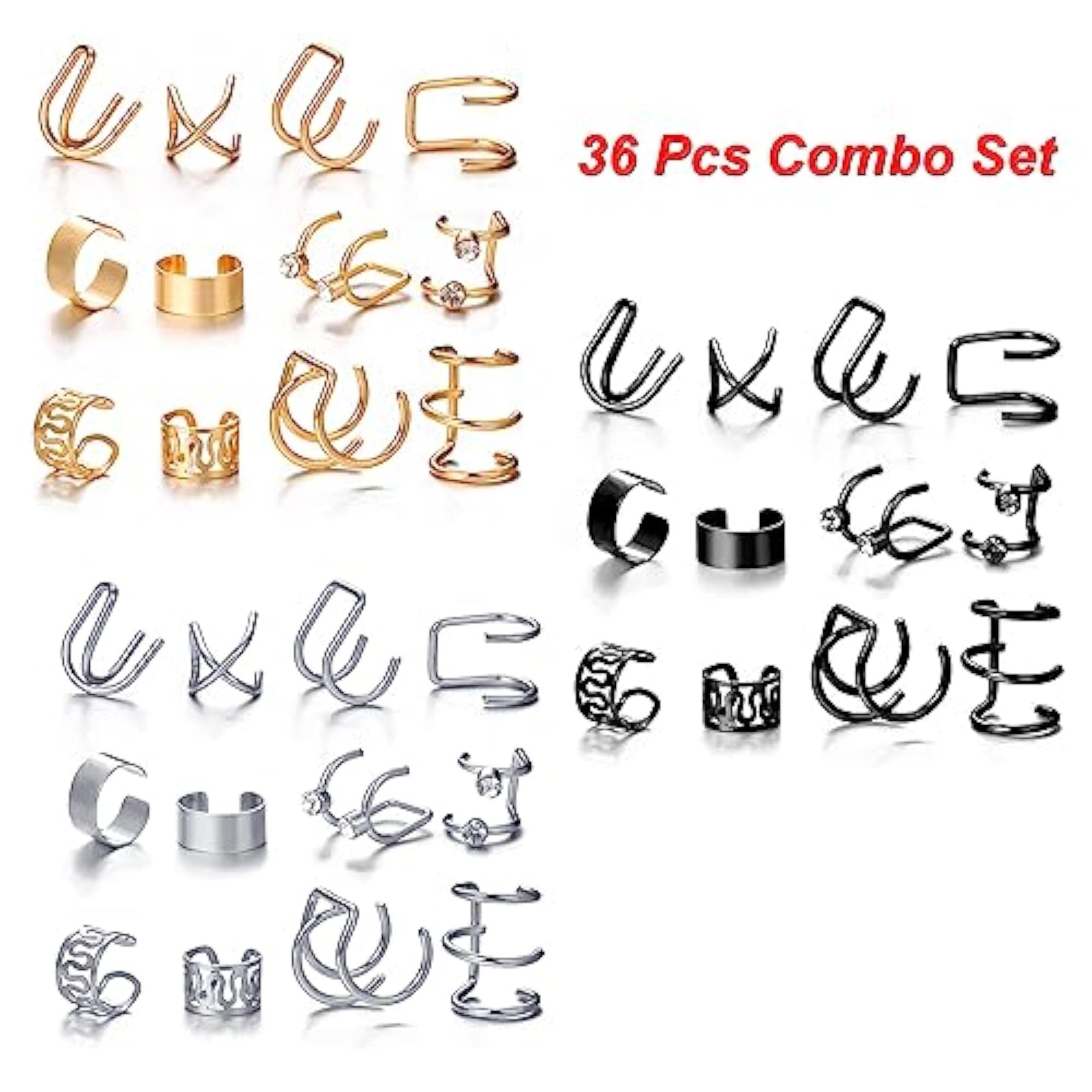 Upgrade your accessory game with this combo pack of clip-on ear cuff earrings. The set includes 36 trendy pieces to mix and match for a chic and edgy look.