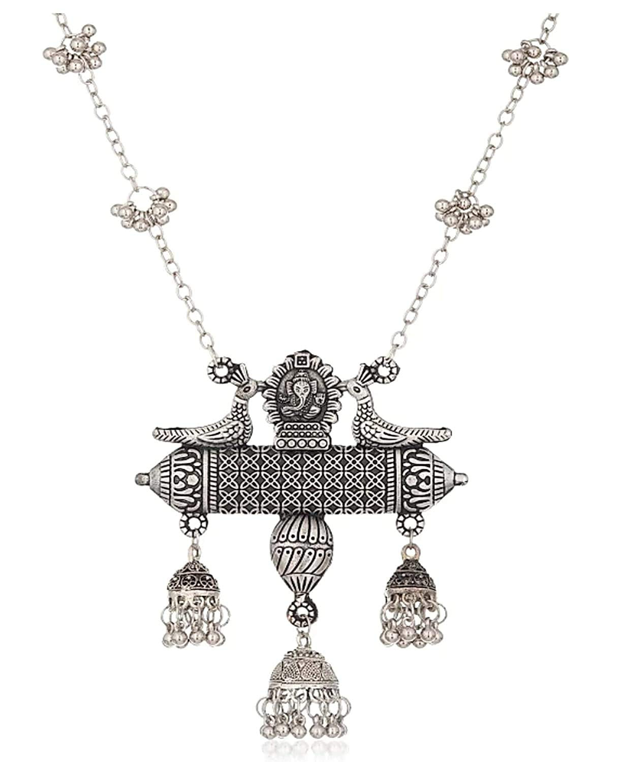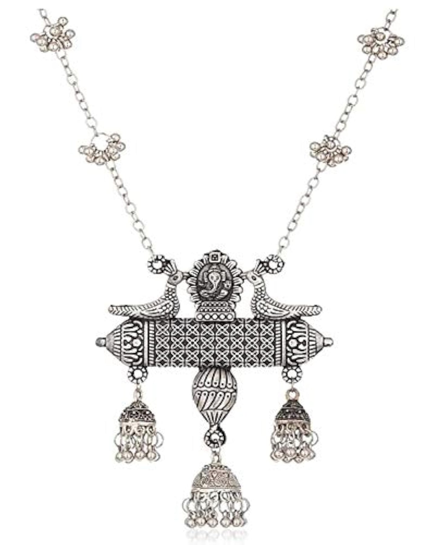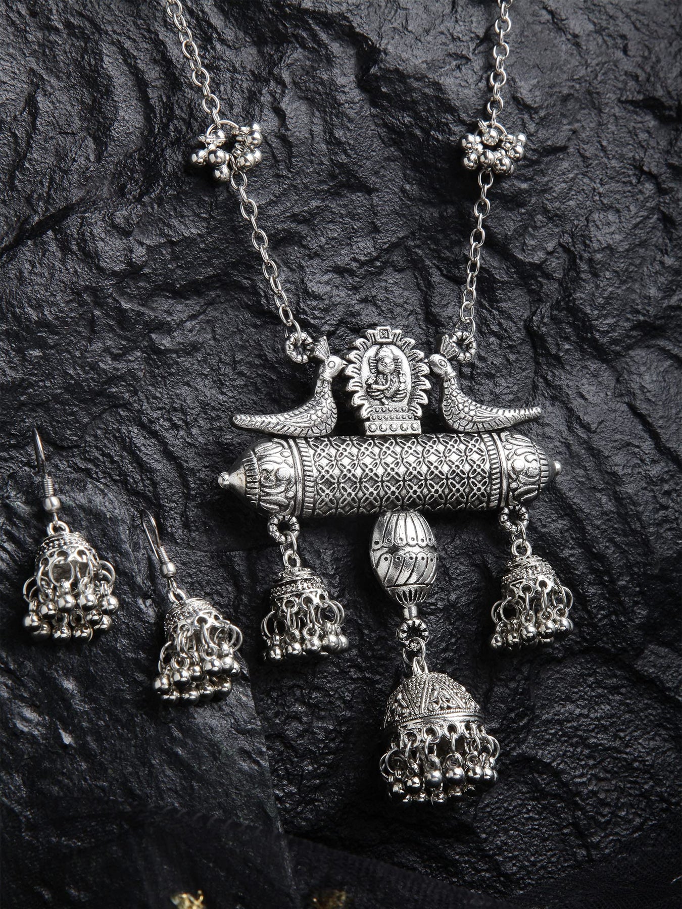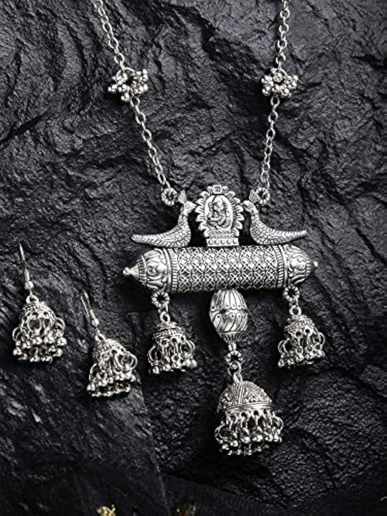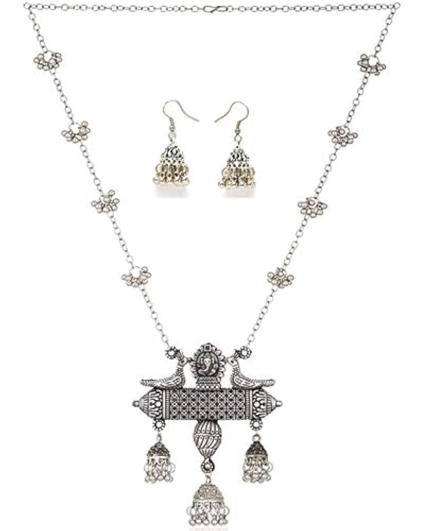 Beautiful Oxidised German Afghani jewellery set featuring long chain pendant earrings and necklace for a stunning look.