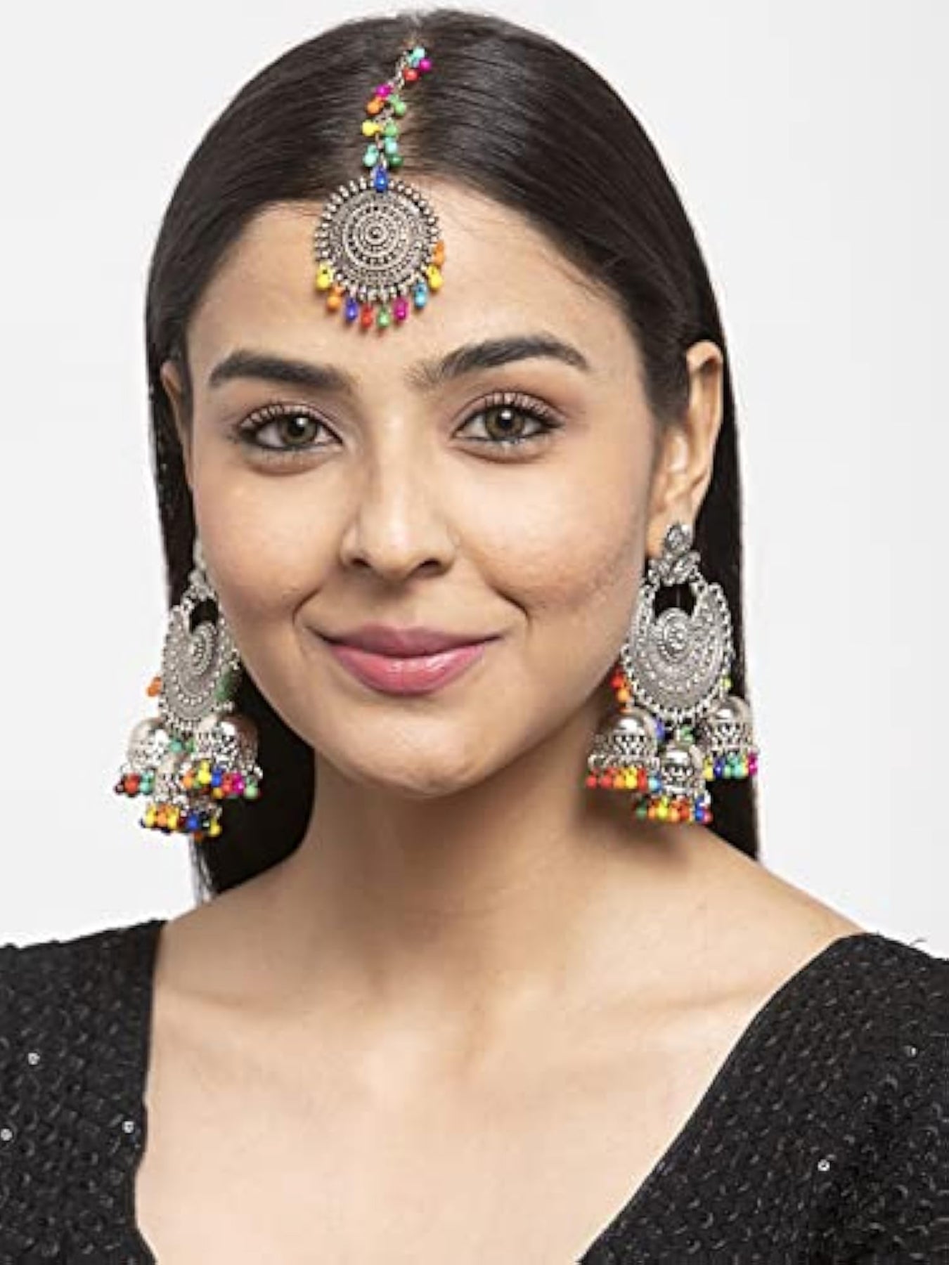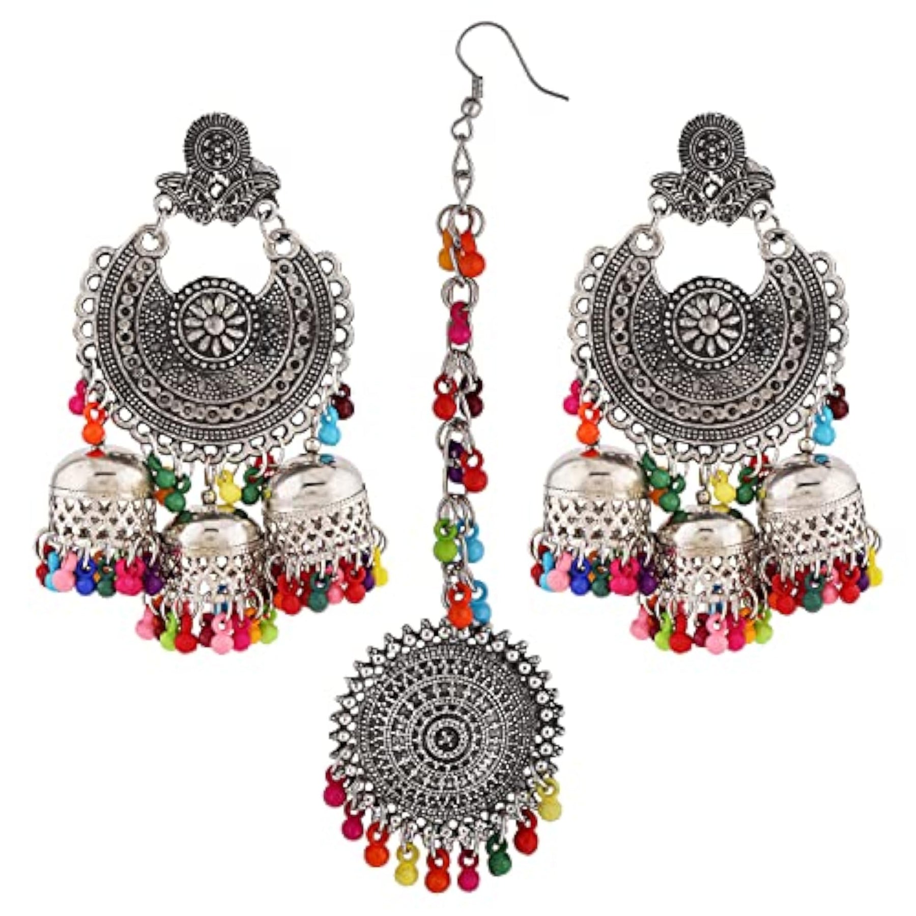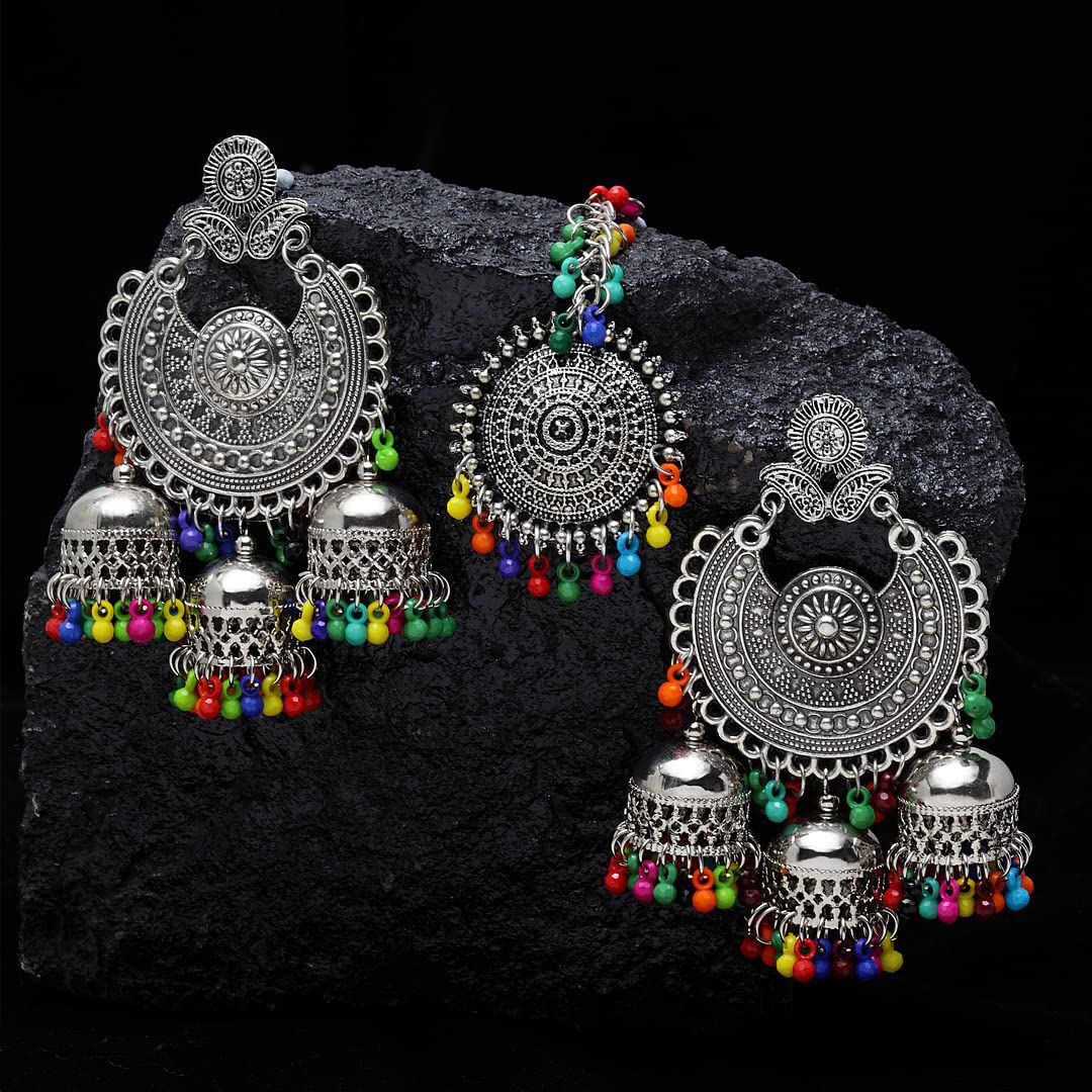 Enhance your traditional look with this exquisite oxidised silver Maang Tikka and Jhumka Earrings set.