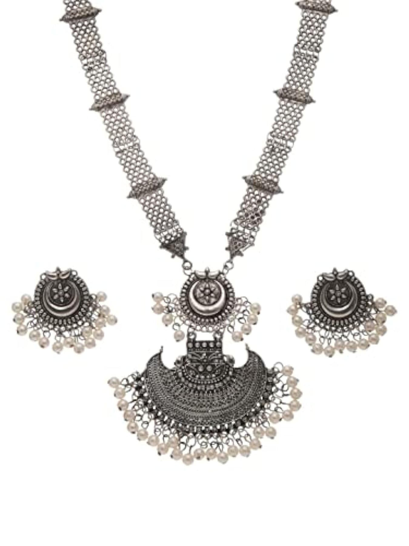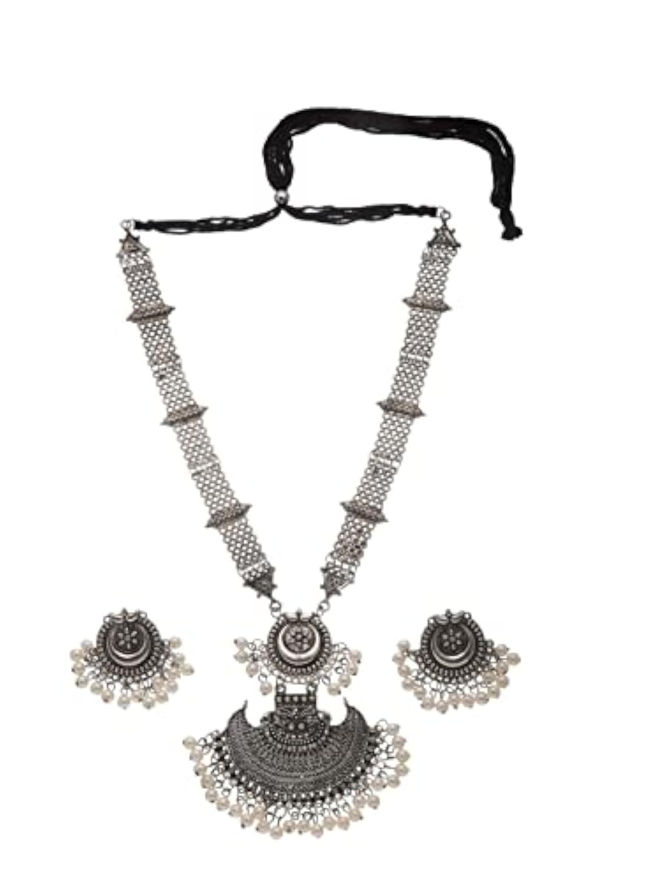 Elegant and trendy oxidised silver-plated jewellery set featuring beautiful beaded Afghani chain design. Perfect for casual or special occasions.