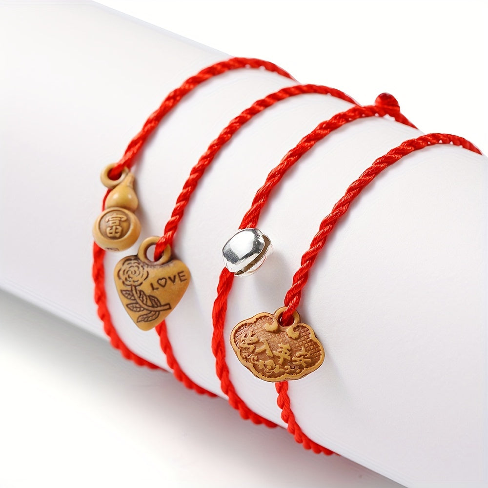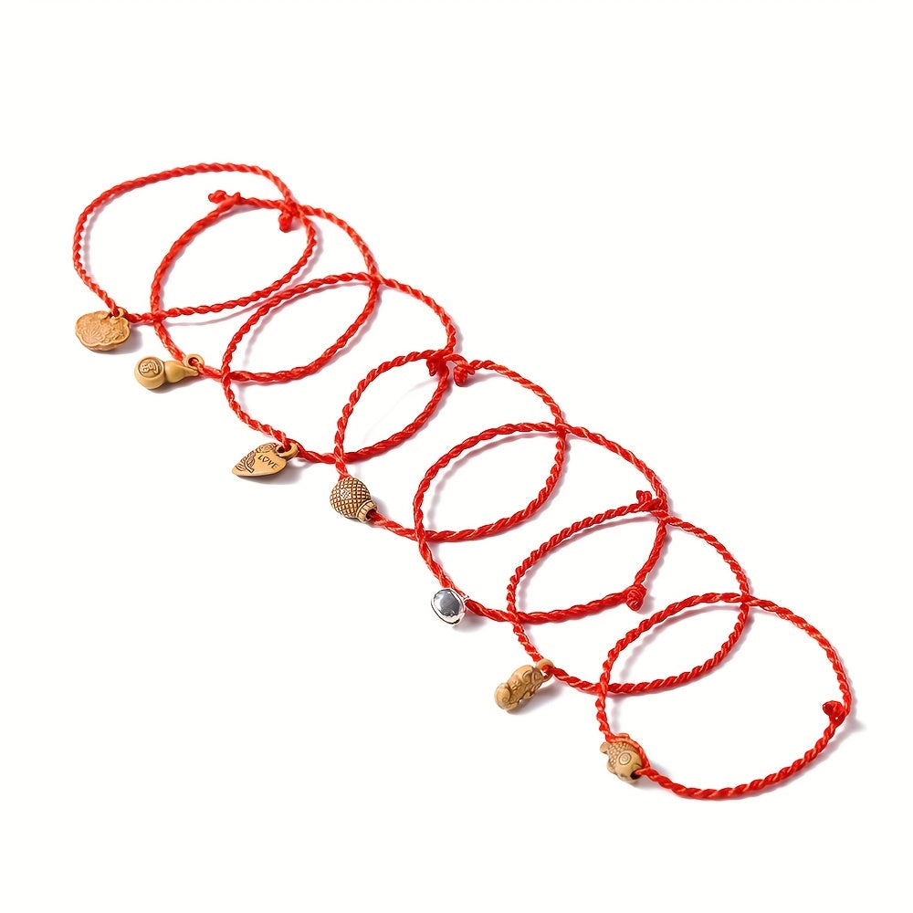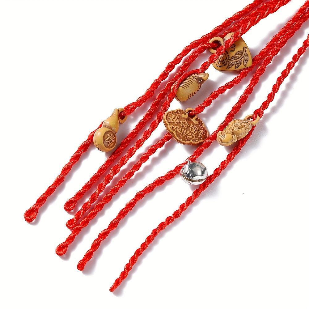 This set includes 10 lucky bracelets with peach wooden red rope chains, perfect as a gift for lover or couple. The bracelets come in 7 different styles.