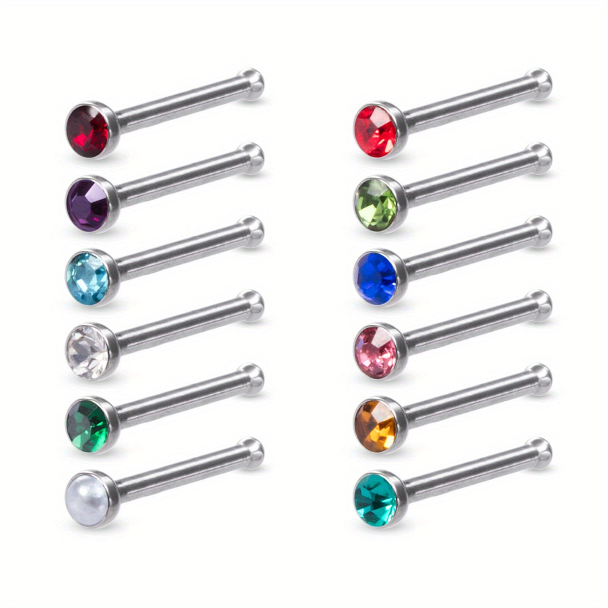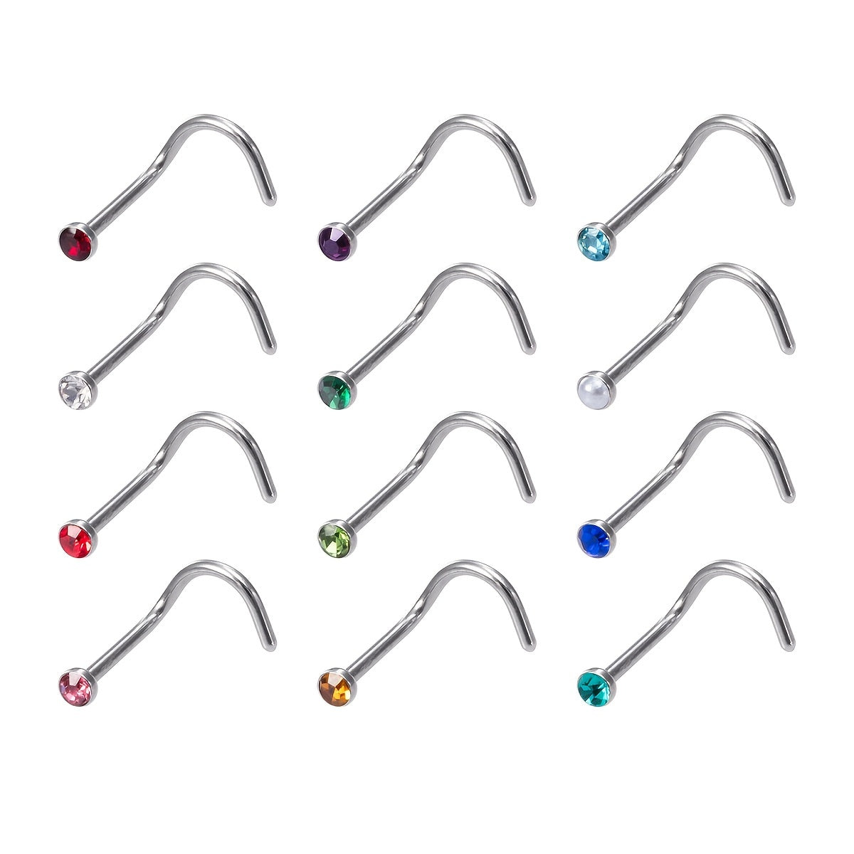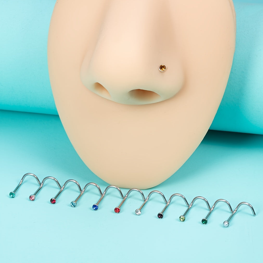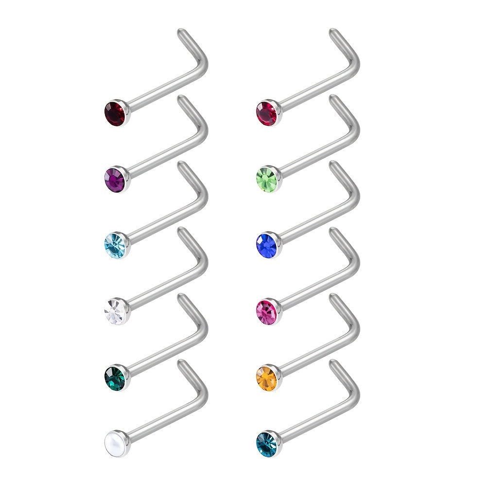 Add a touch of personality to your style with this set of 12 nose rings featuring inlaid rhinestones. Perfect for body piercing enthusiasts!