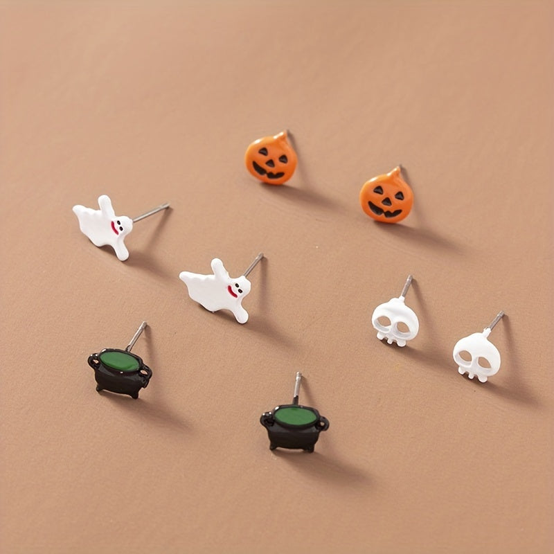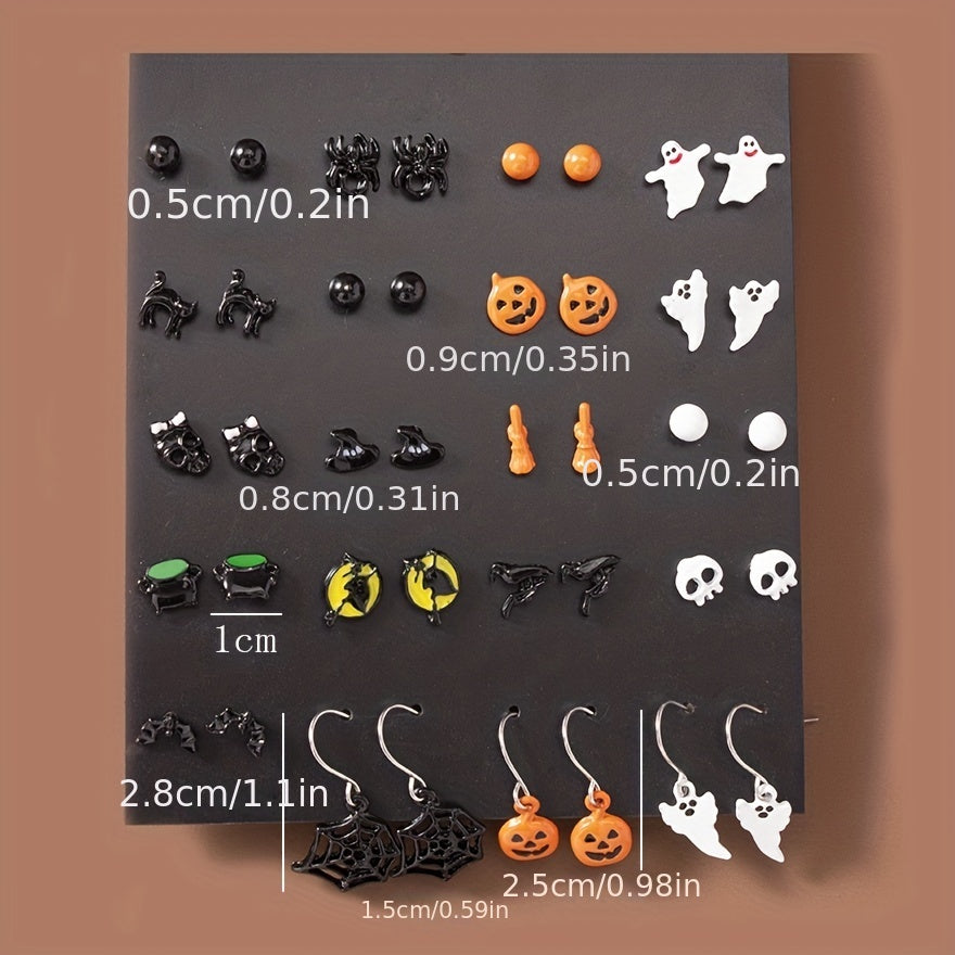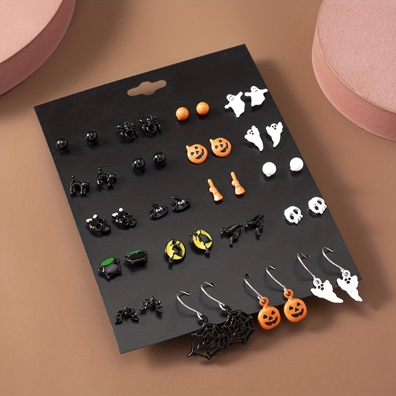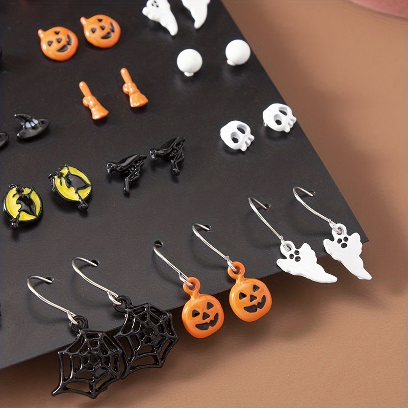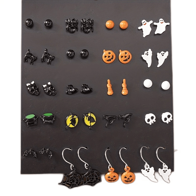 Get into the Halloween spirit with this set of 20 pairs of stud and dangle earrings. Perfect for a hip Halloween party look!