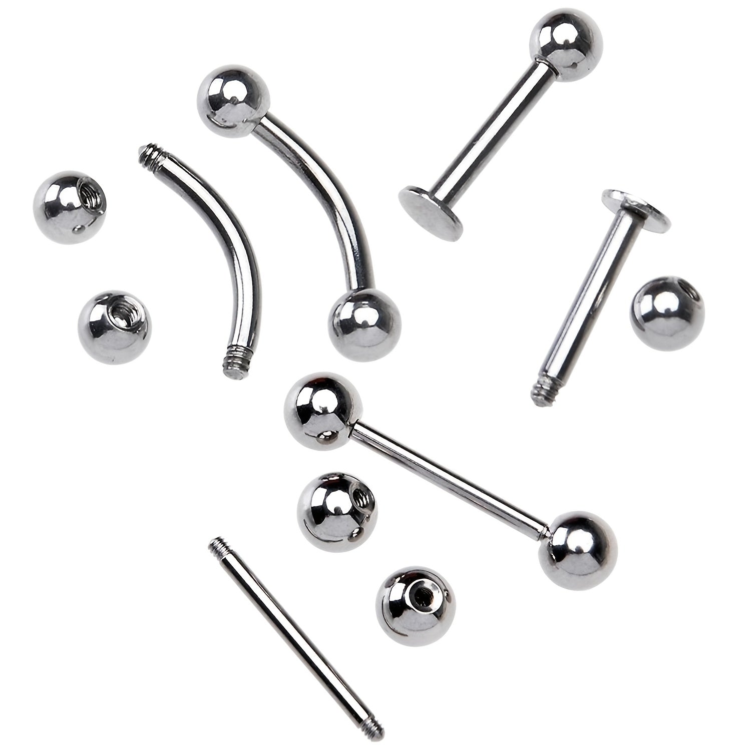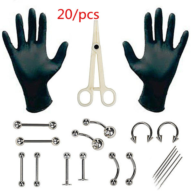 This set includes 20 pieces of piercing tools for nose, ear, navel, and lip nails. The kit is versatile and suitable for various body piercings.