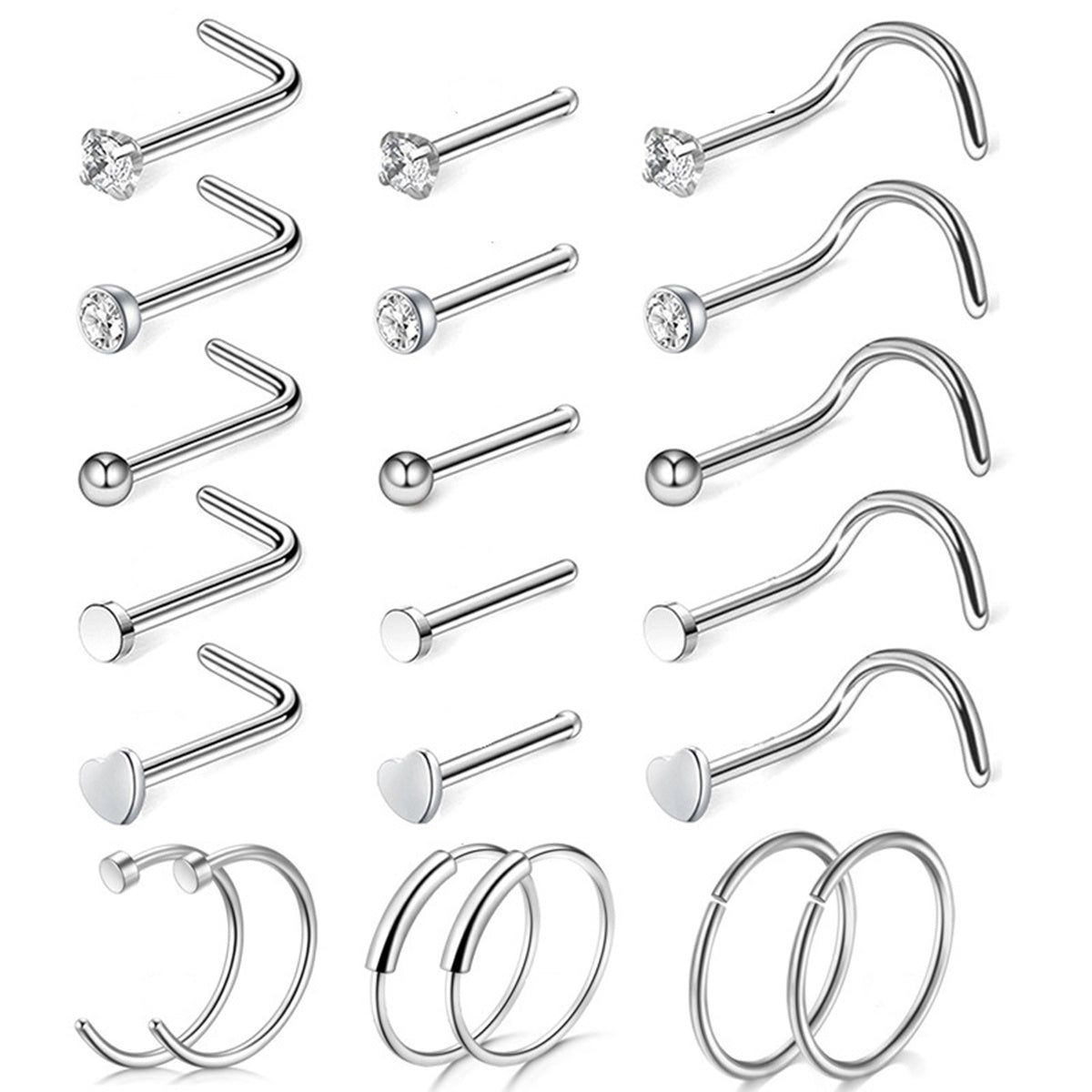 • Fashionable nose piercing set with 21 surgical steel rings