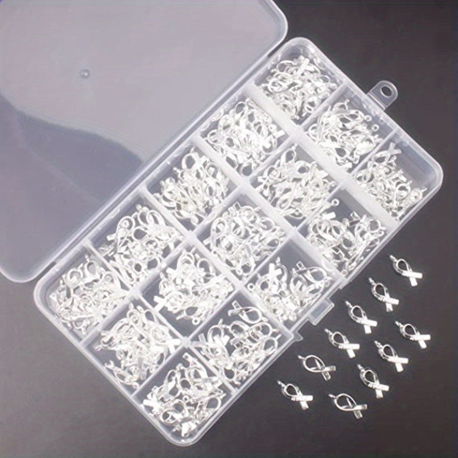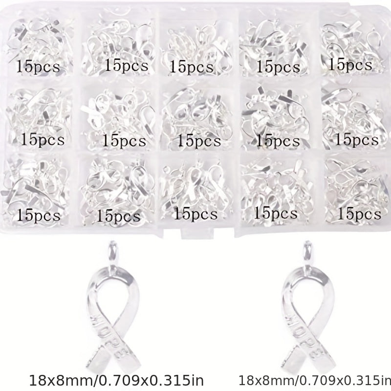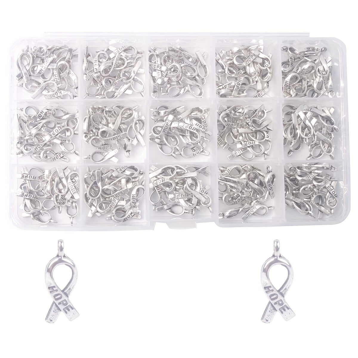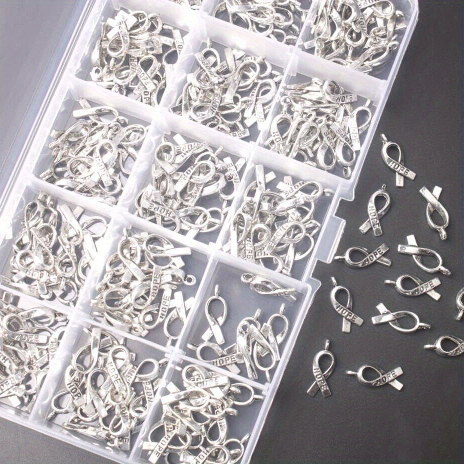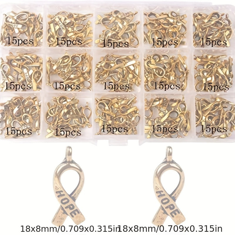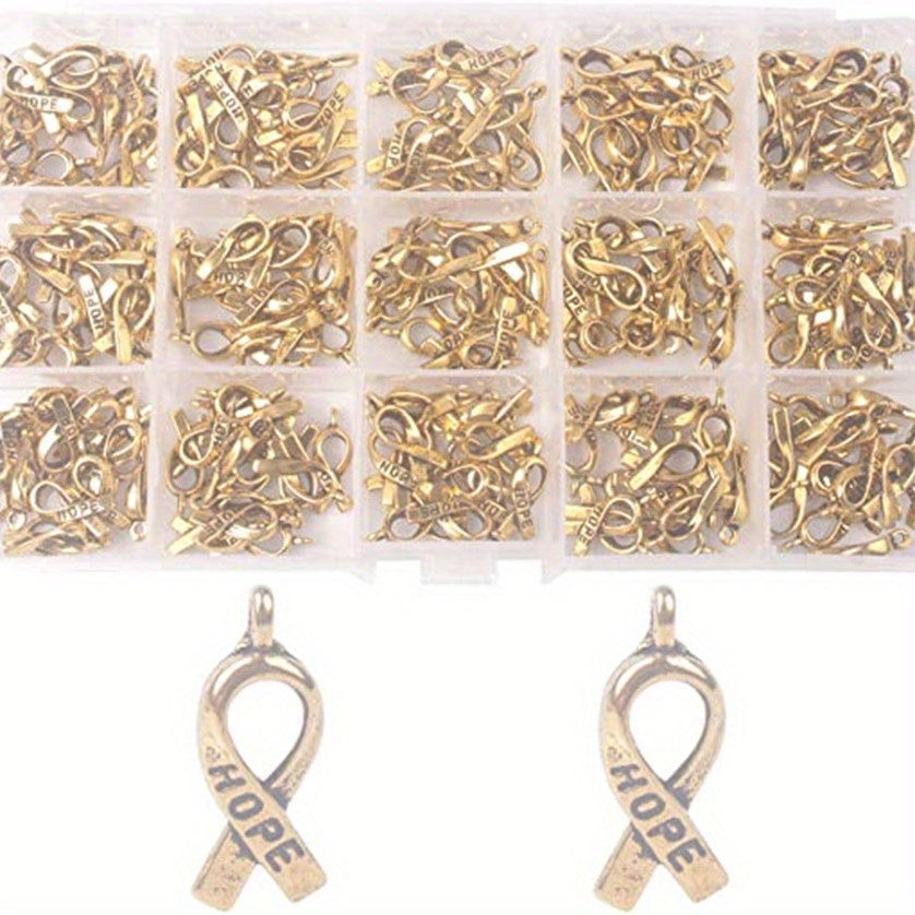 This box contains 225 antiqued silvery golden metal Cancer Awareness HOPE ribbon charms, ideal for creating jewelry pieces that support the cause.