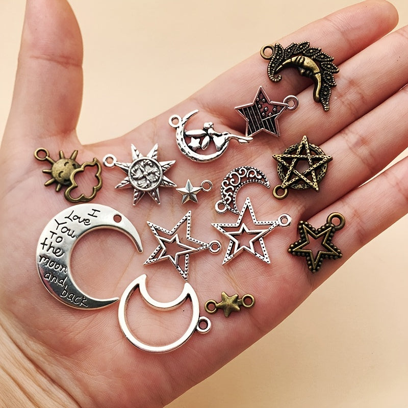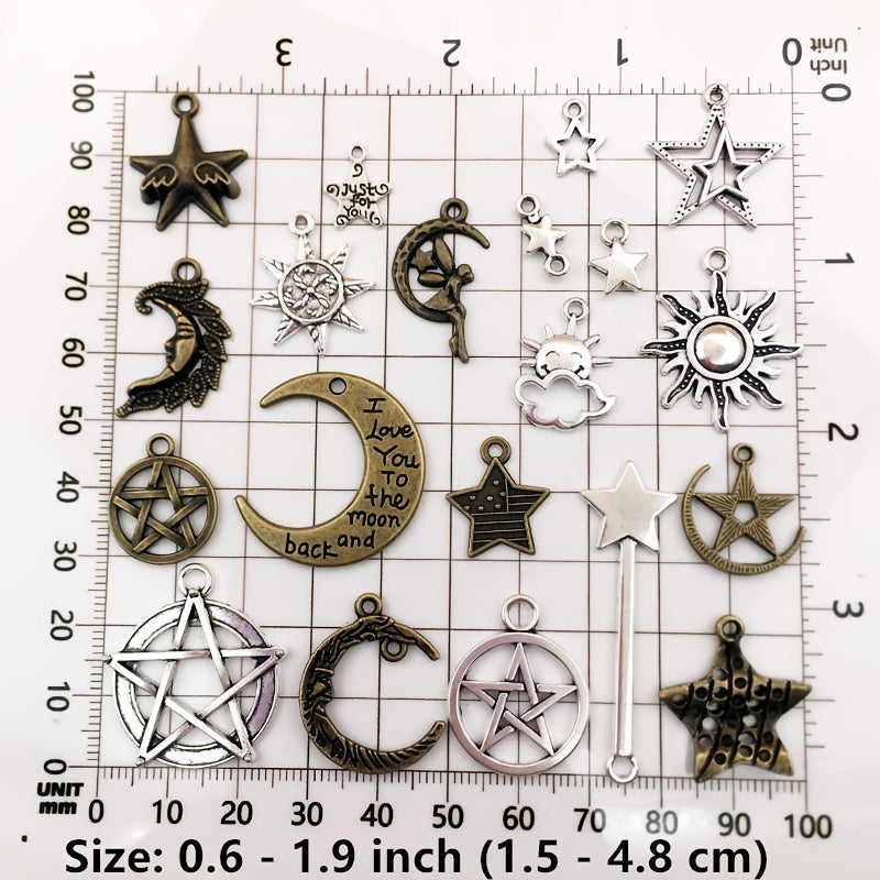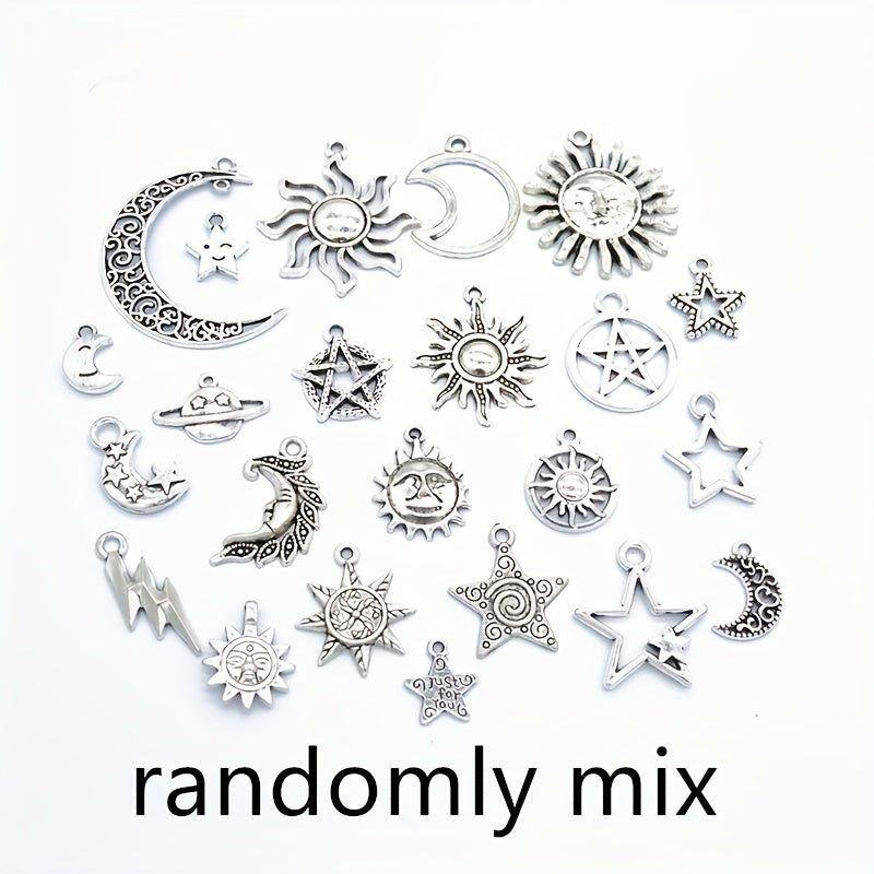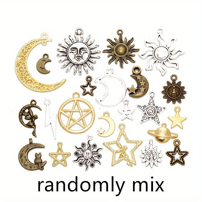 Get this set of 23 antique silver and gold sun, moon, and star charms for your jewelry making projects. Perfect for necklaces, bracelets, and other crafts.