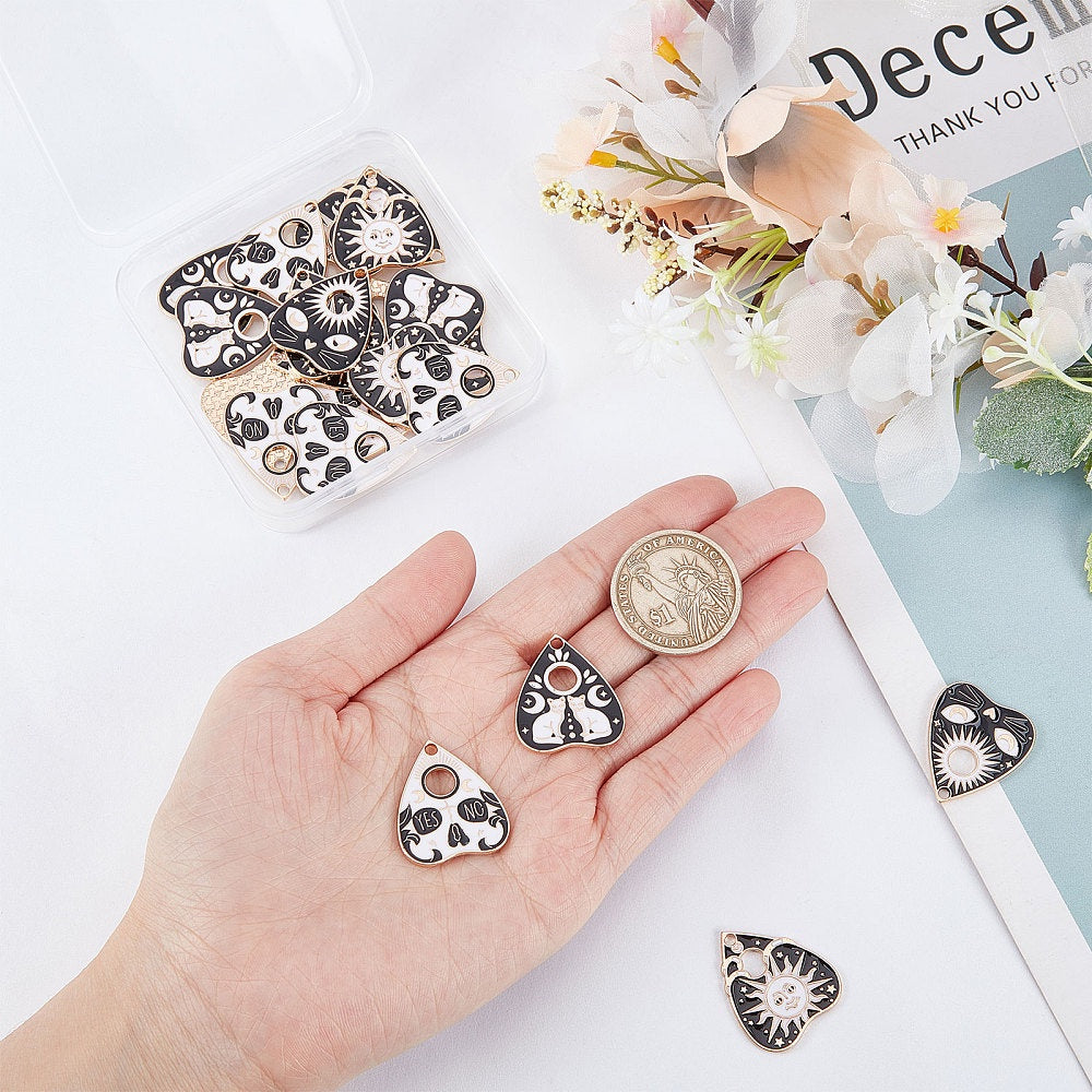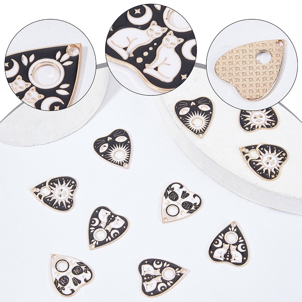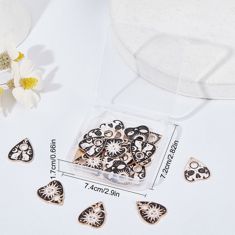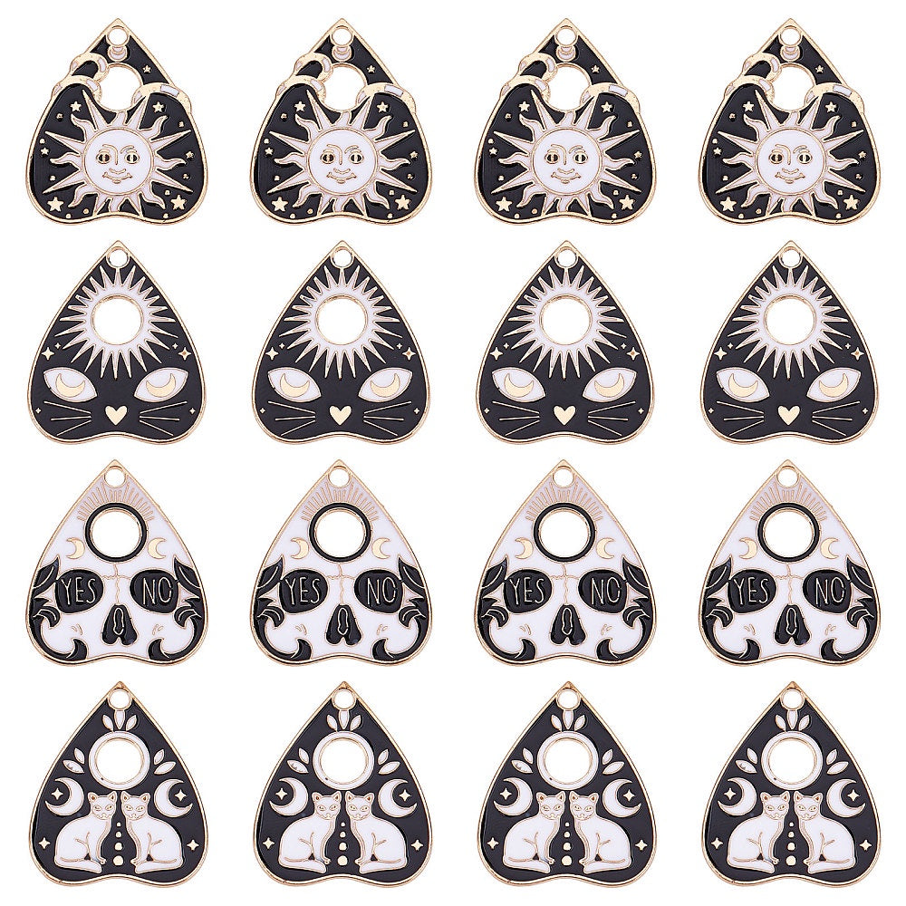 Enhance your DIY jewelry projects with this set of 24 Tarot and Ouijas charms, including Planchette, Sun, Cat, Yes No, and Fortune Teller Gothic charms. Perfect for adding a mystical touch to your accessories.