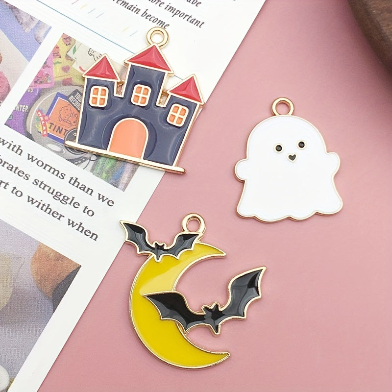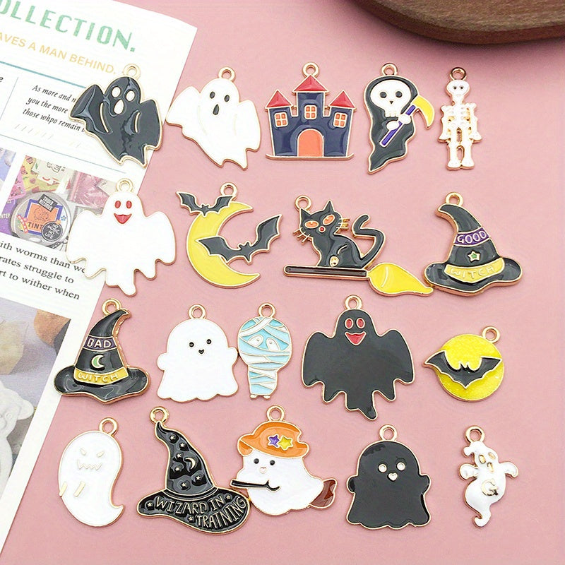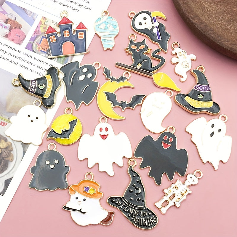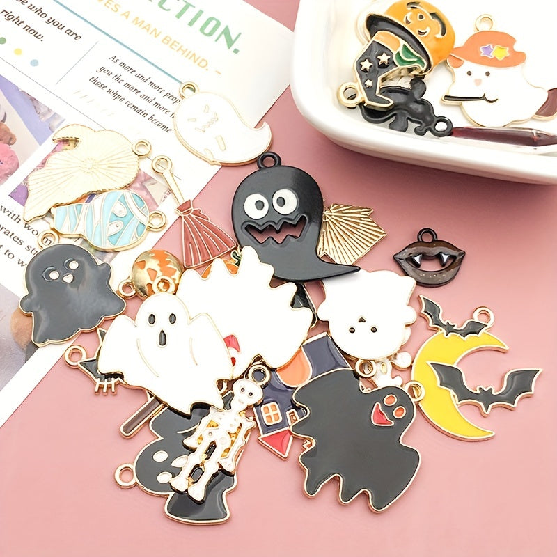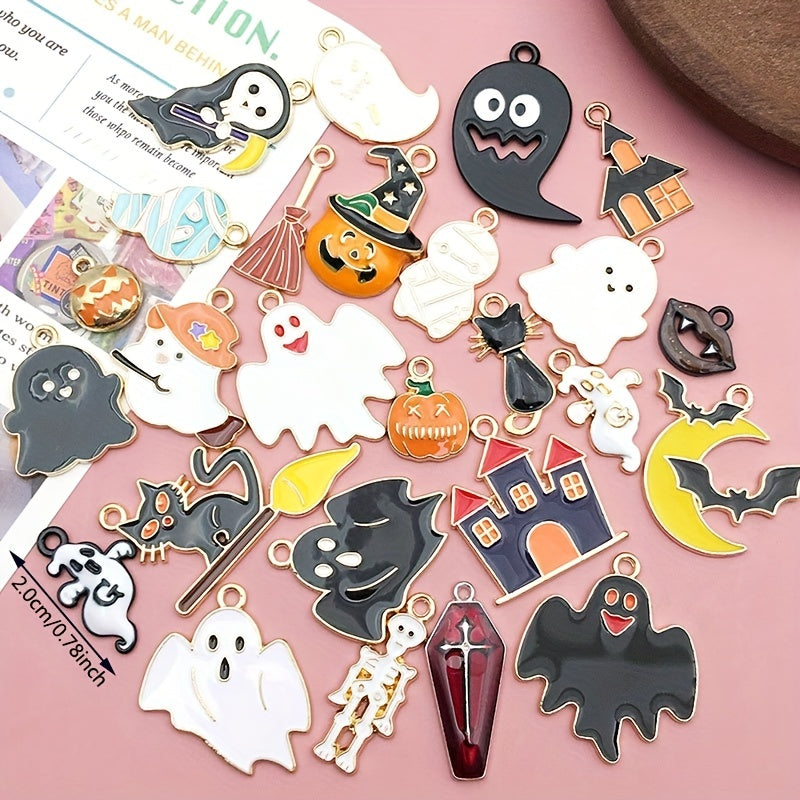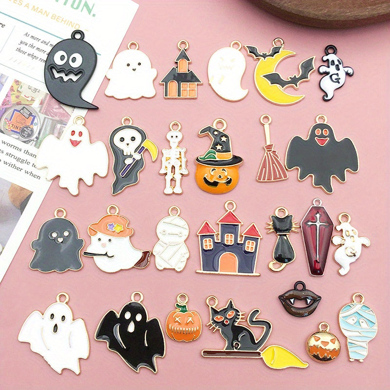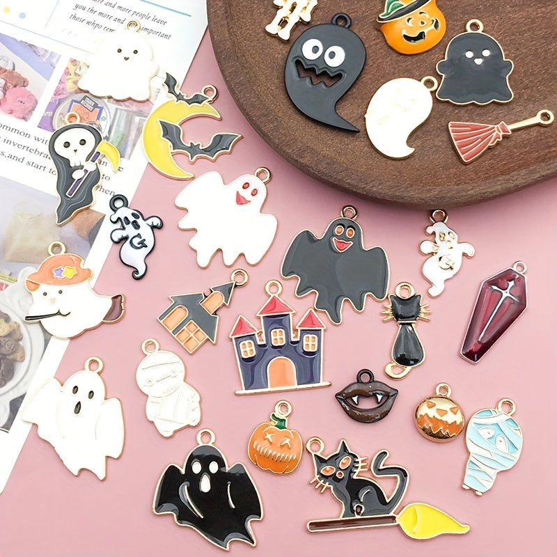 Get a random mix of 26 cartoon Halloween charms including pumpkin, skeleton, ghost, bat, and cat pendants. Perfect for DIY jewelry making or party decorations.