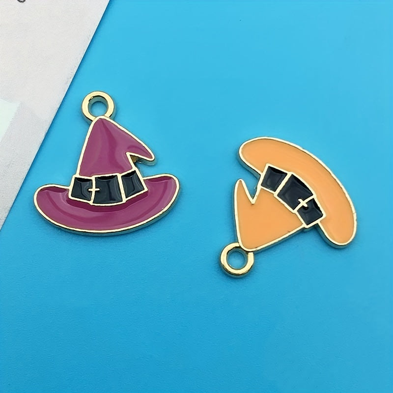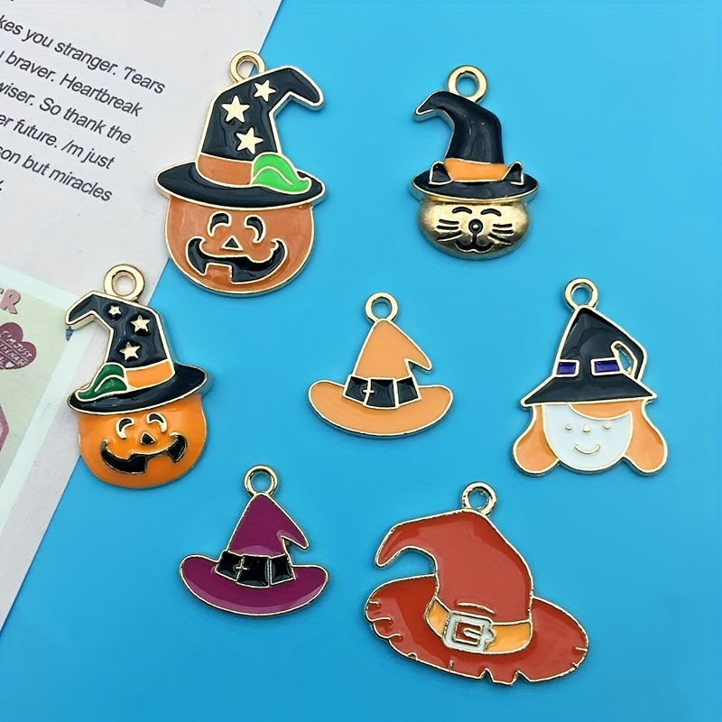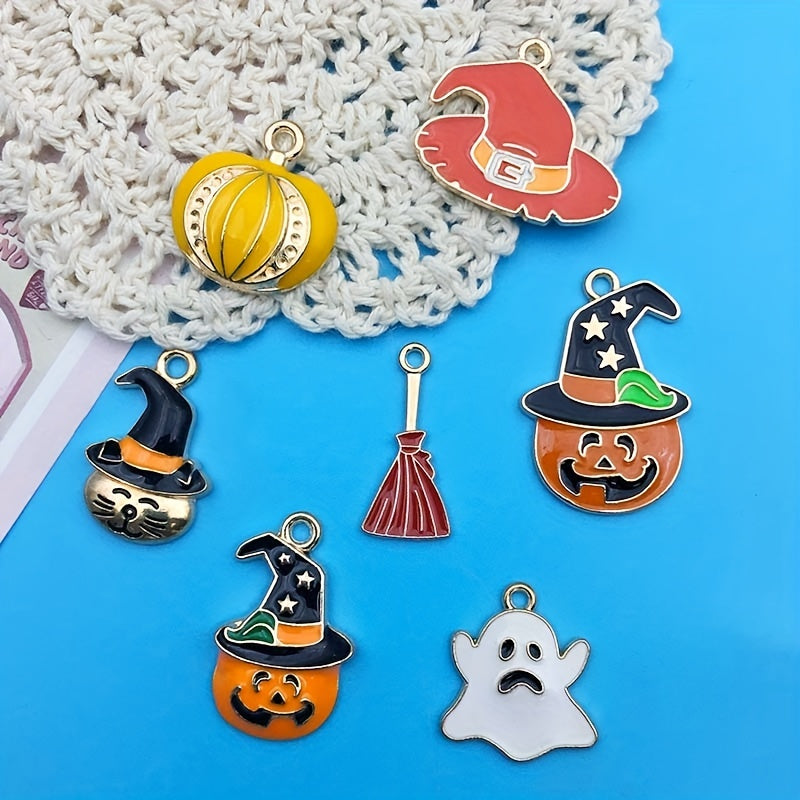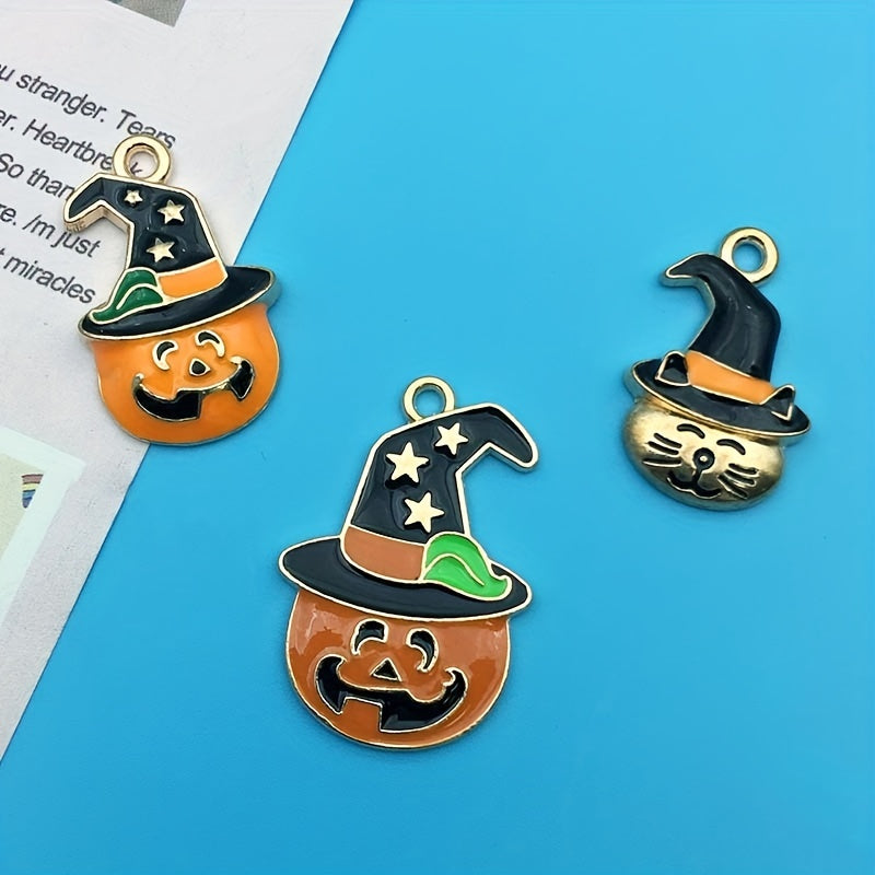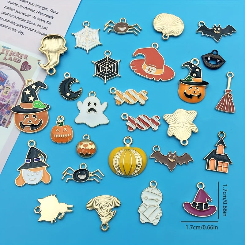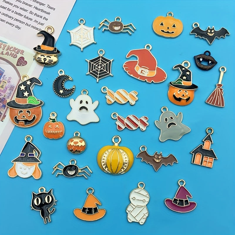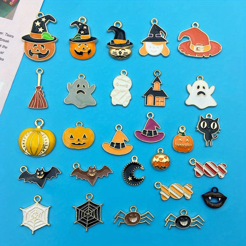Add a spooky and cute touch to your DIY jewelry projects with these 27 mixed cartoon Halloween style alloy enamel pumpkin, skull, bat, cat, and spider pendant charms.